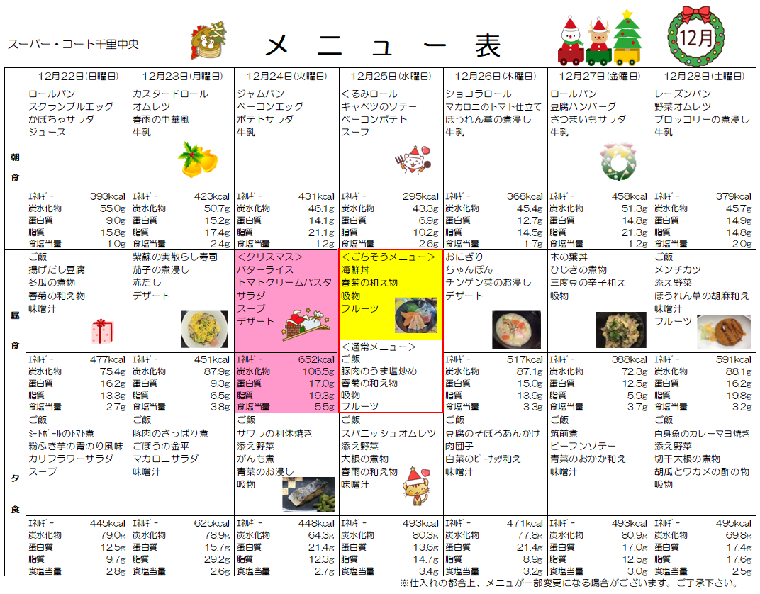 12月22日(日)~28日(土)までのお食事メニューをご紹介します!