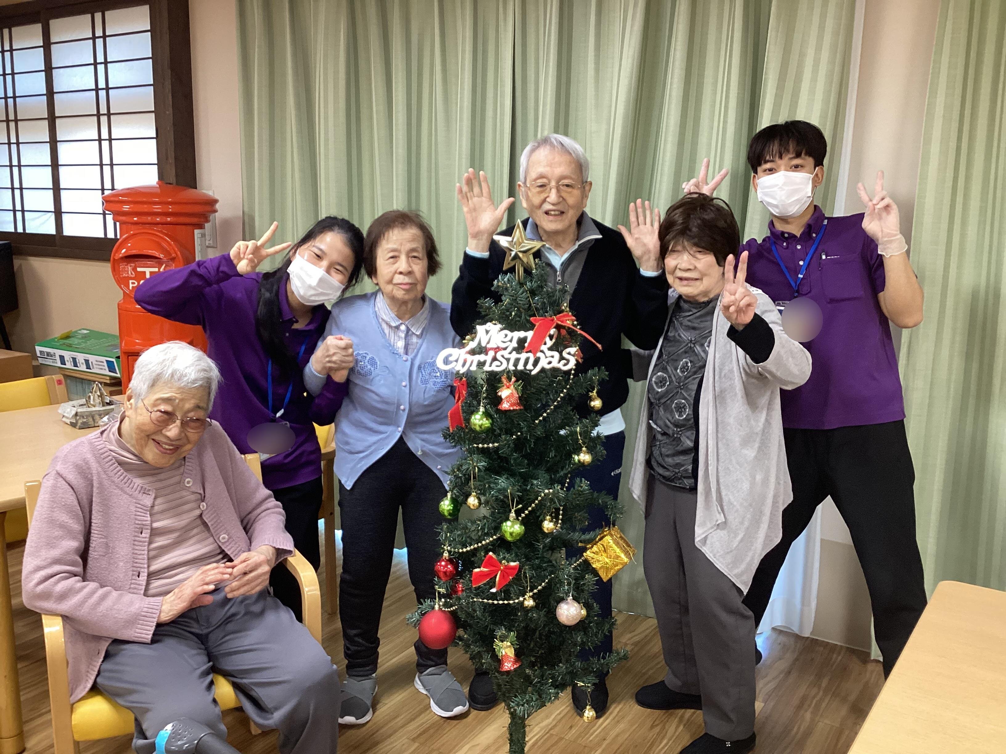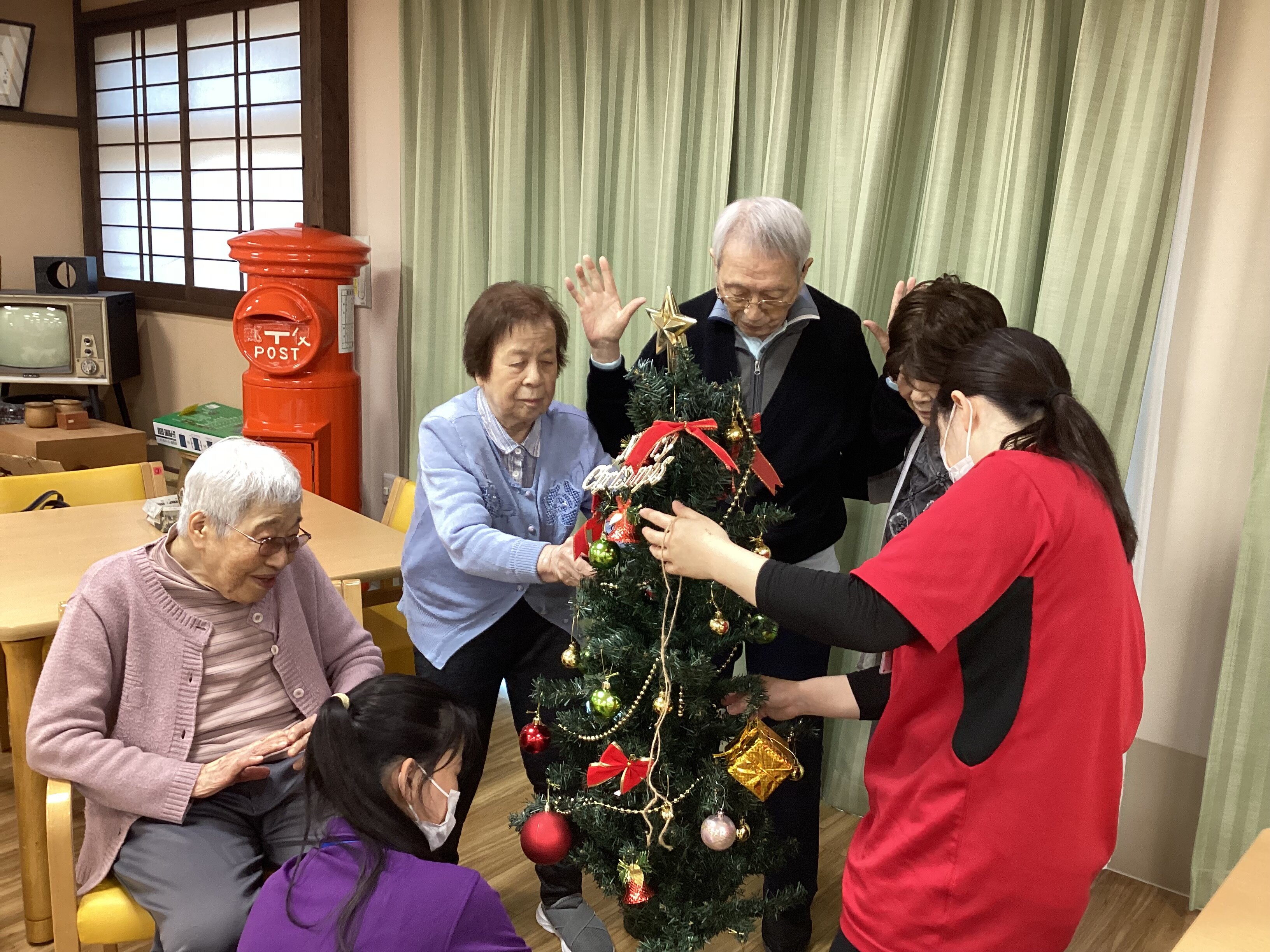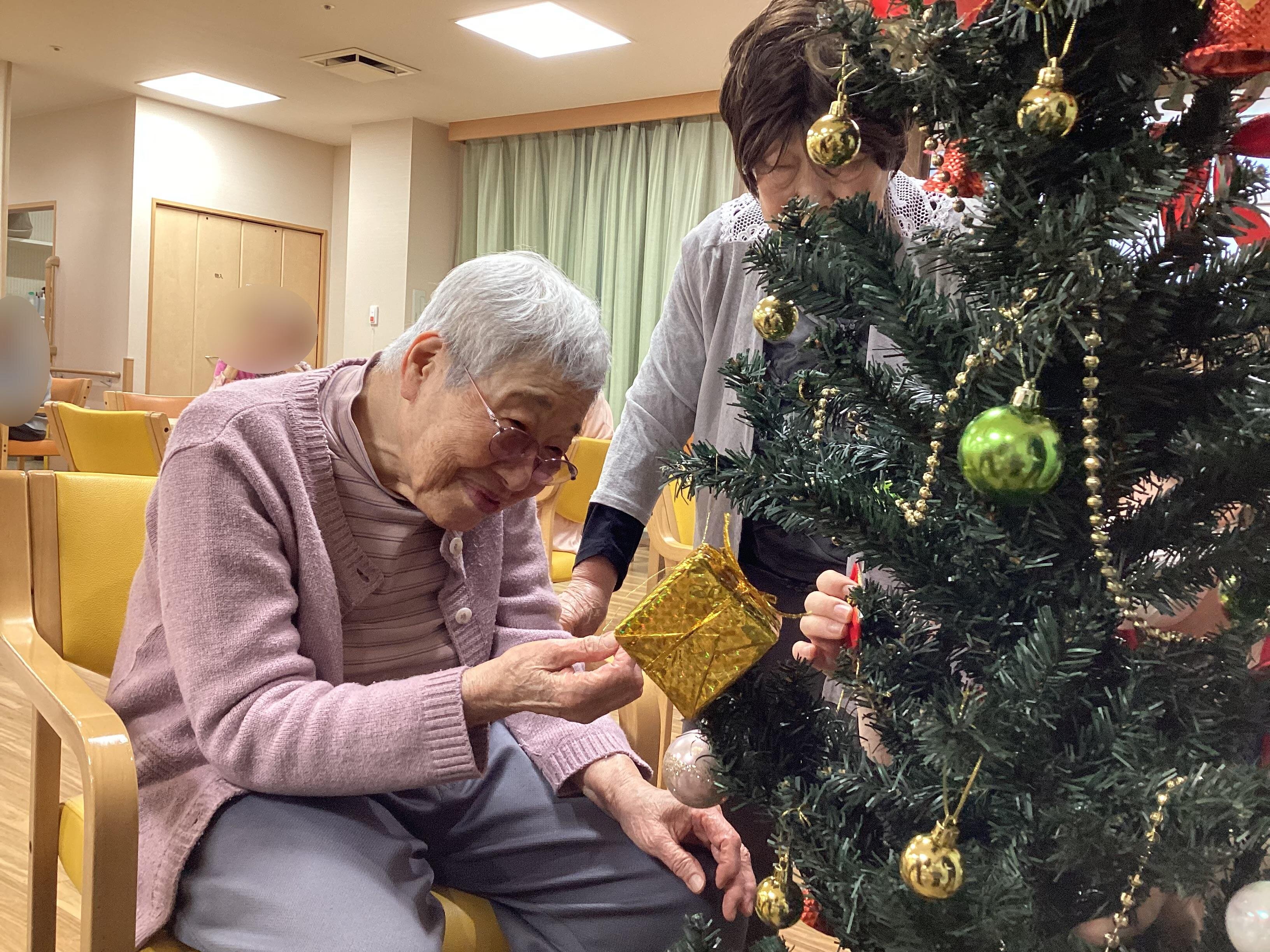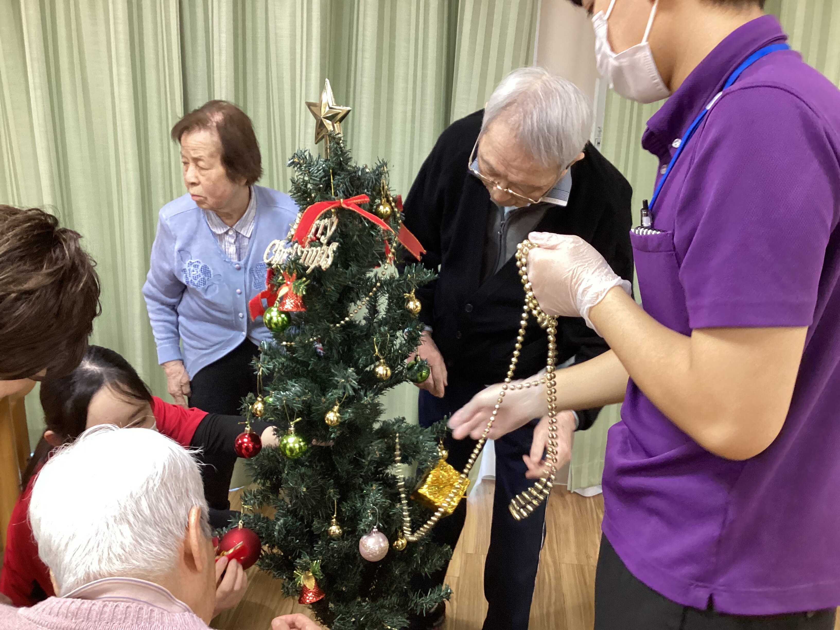 4階食堂へ置くツリーはご入居者に飾り付けをしていただきました(*^▽^*)