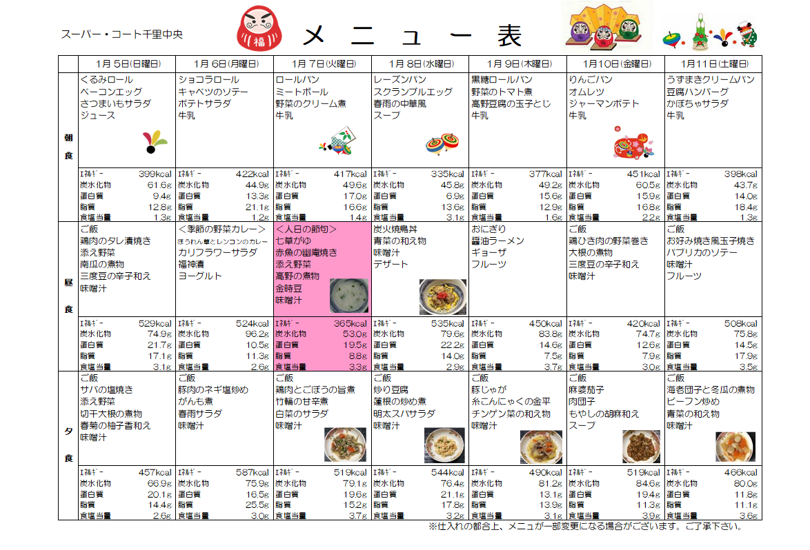新年1つ目のブログは、1月5日(日)~1月11日(土)のお食事メニューのご紹介です!