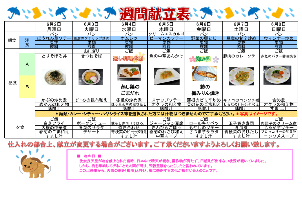 6月2日(月)~6月8日(日)のお食事メニューをご紹介します!