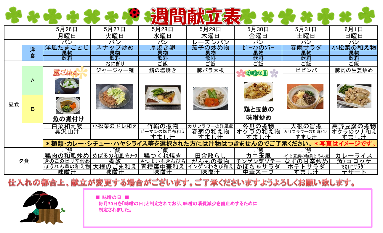 5月26日(月)~6月1日(日)のお食事メニューをご紹介します!