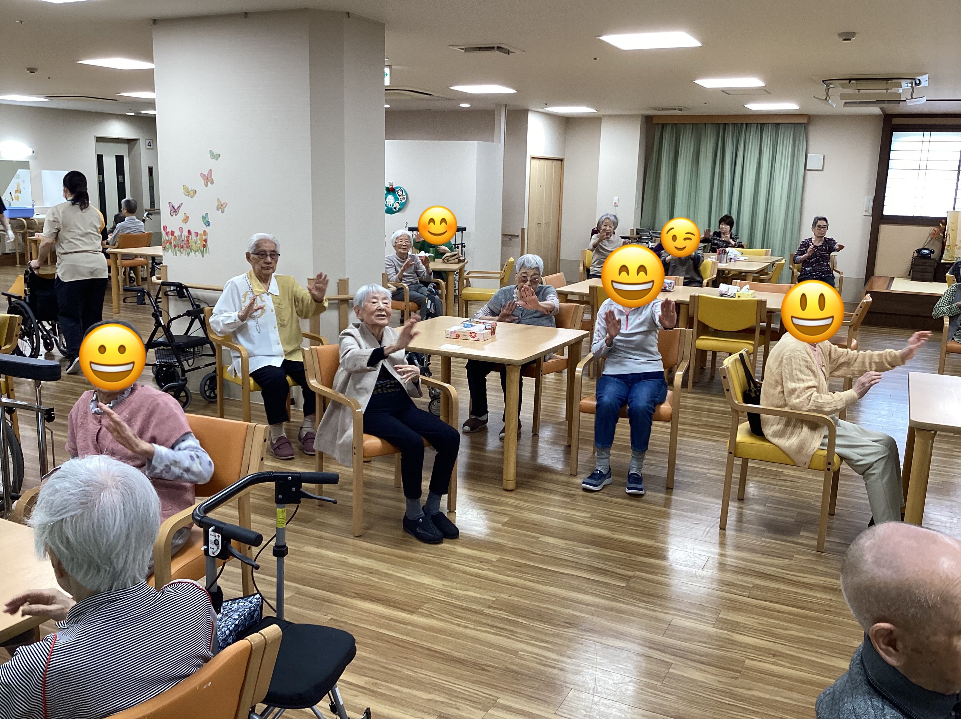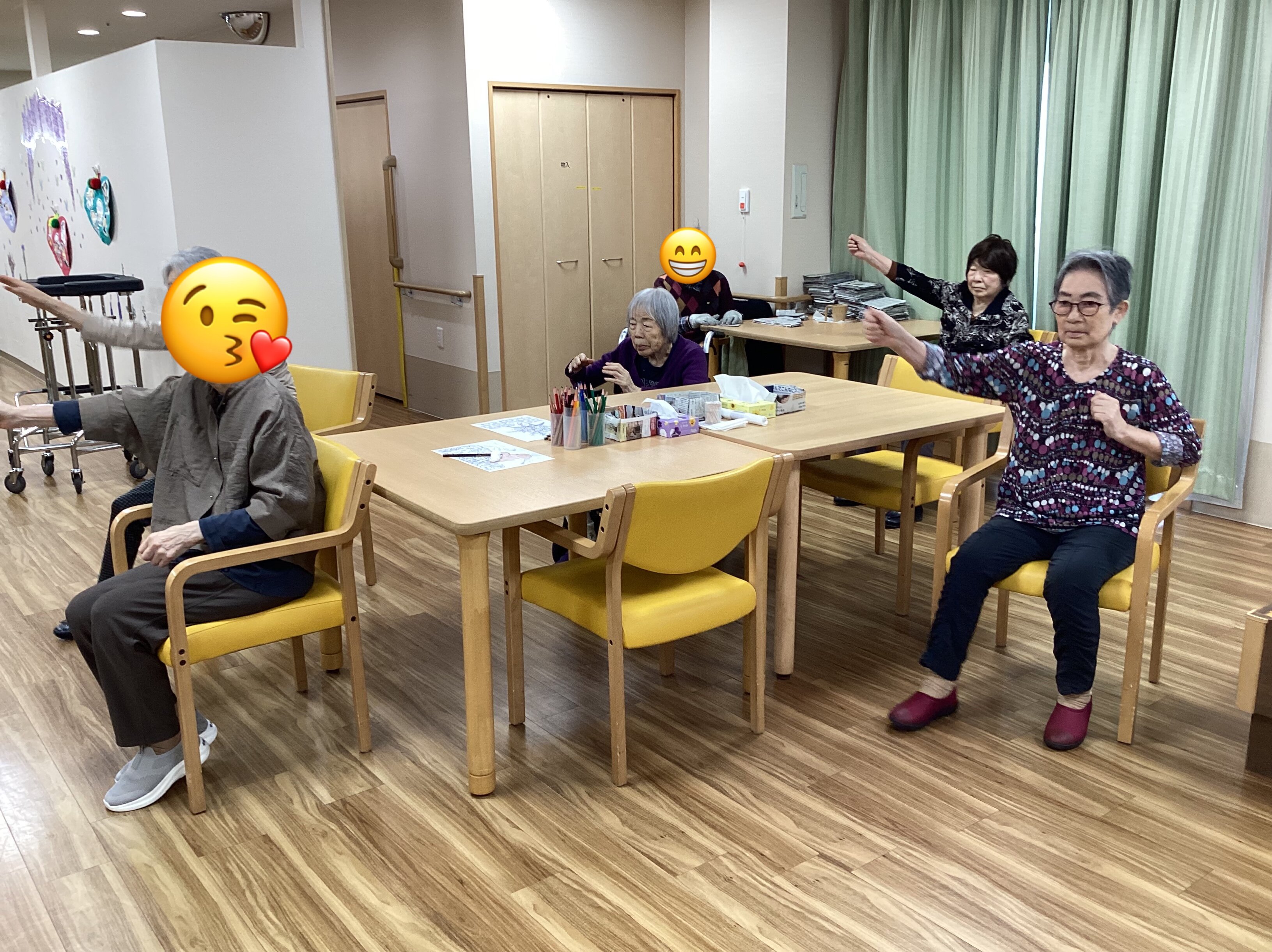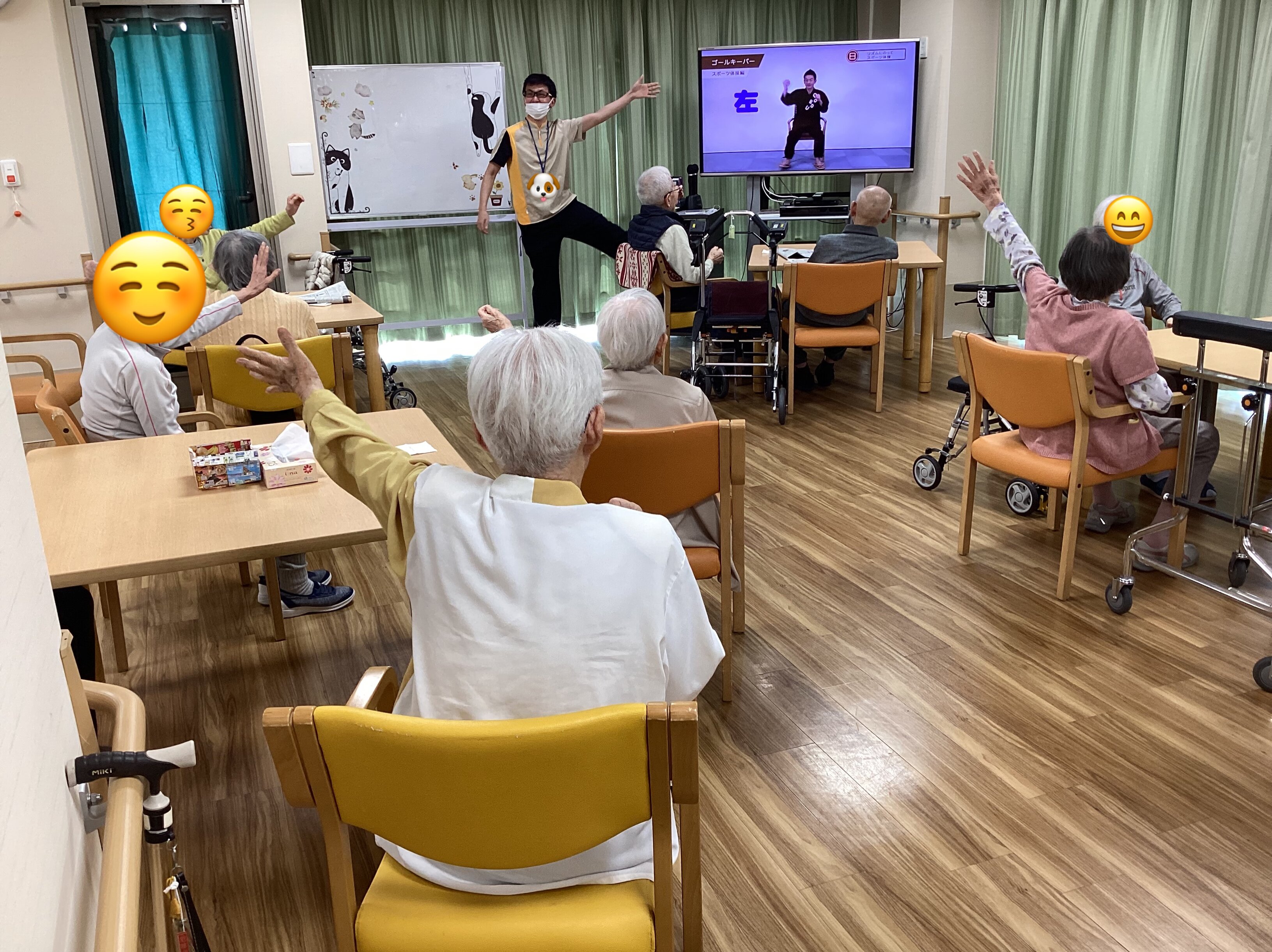 このように毎日10時半から15分程、スタッフが前に立ちラジオ体操やごぼう先生のDVDを流して皆さんと一緒に全身の運動をしております(ノ´∀`)ノ