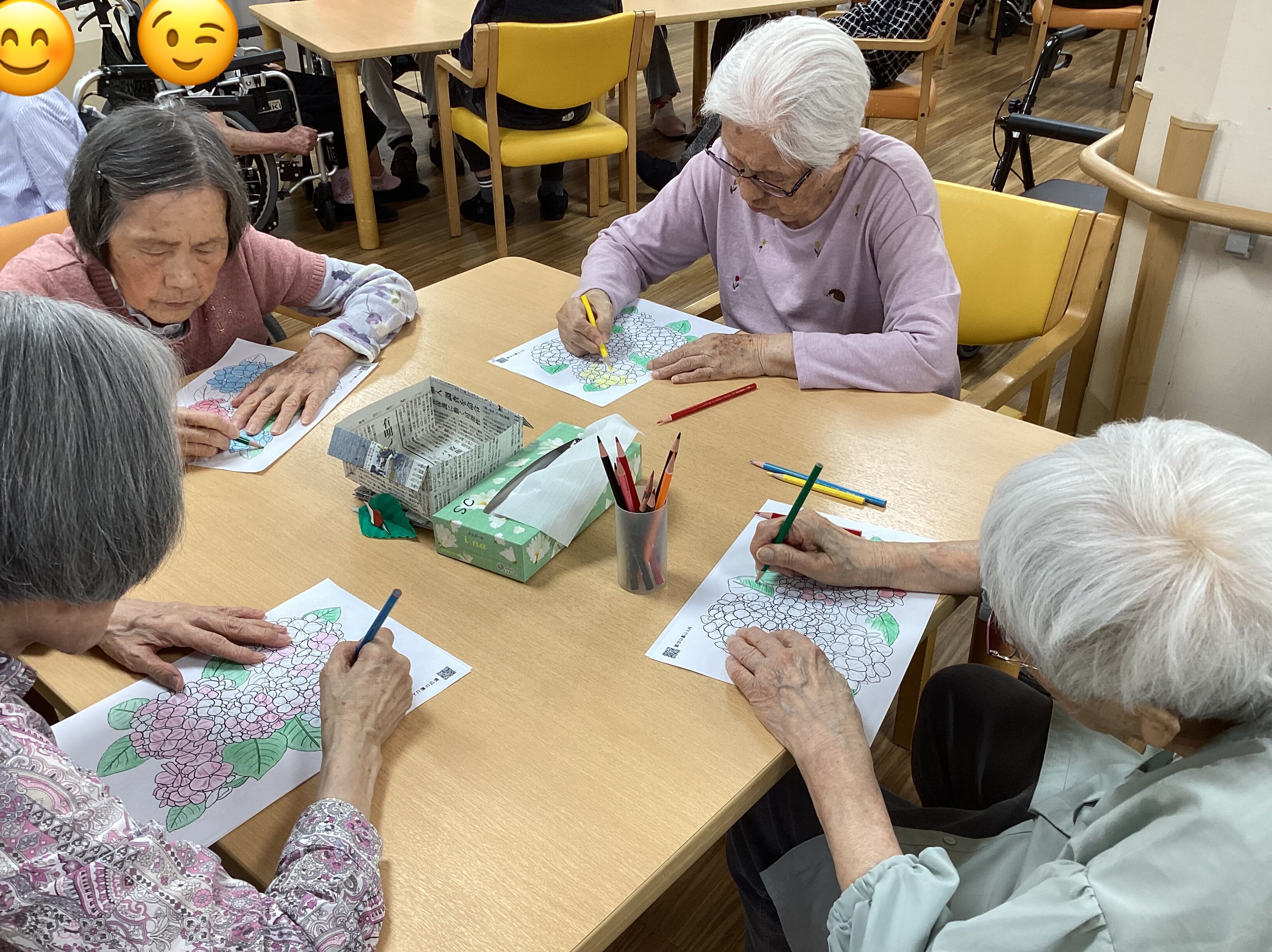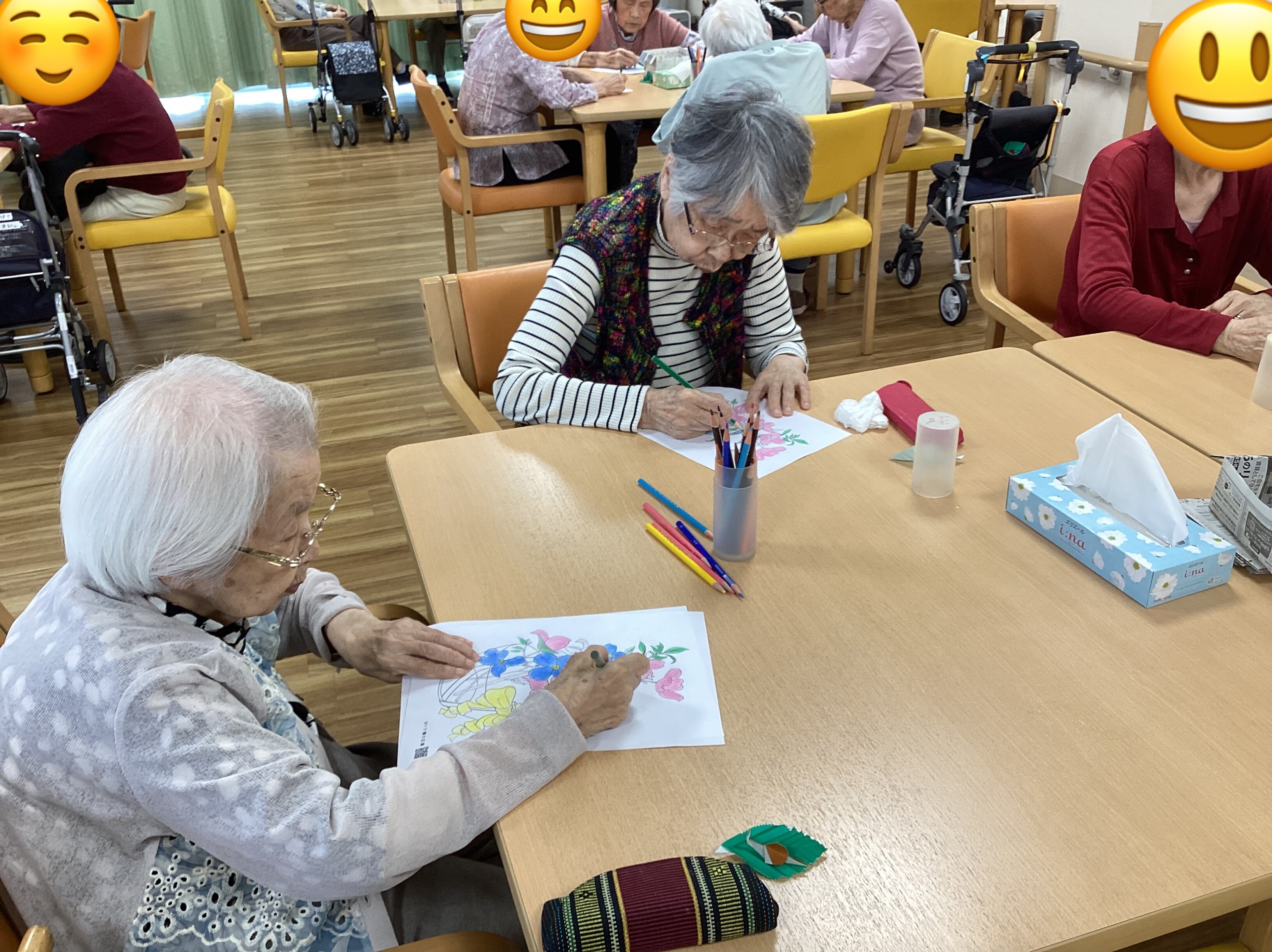 塗り絵は脳の活性化、リフレッシュ、ストレス解消、手指のリハビリに効果的!ただ、下を向いて首の痛みや肩凝りの原因にもなりかねないので、時折首や肩を回していただいております(^^;;)