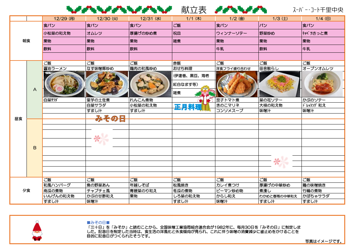 12月29日(月)~1月4日(日)までのお食事メニューをご紹介します!