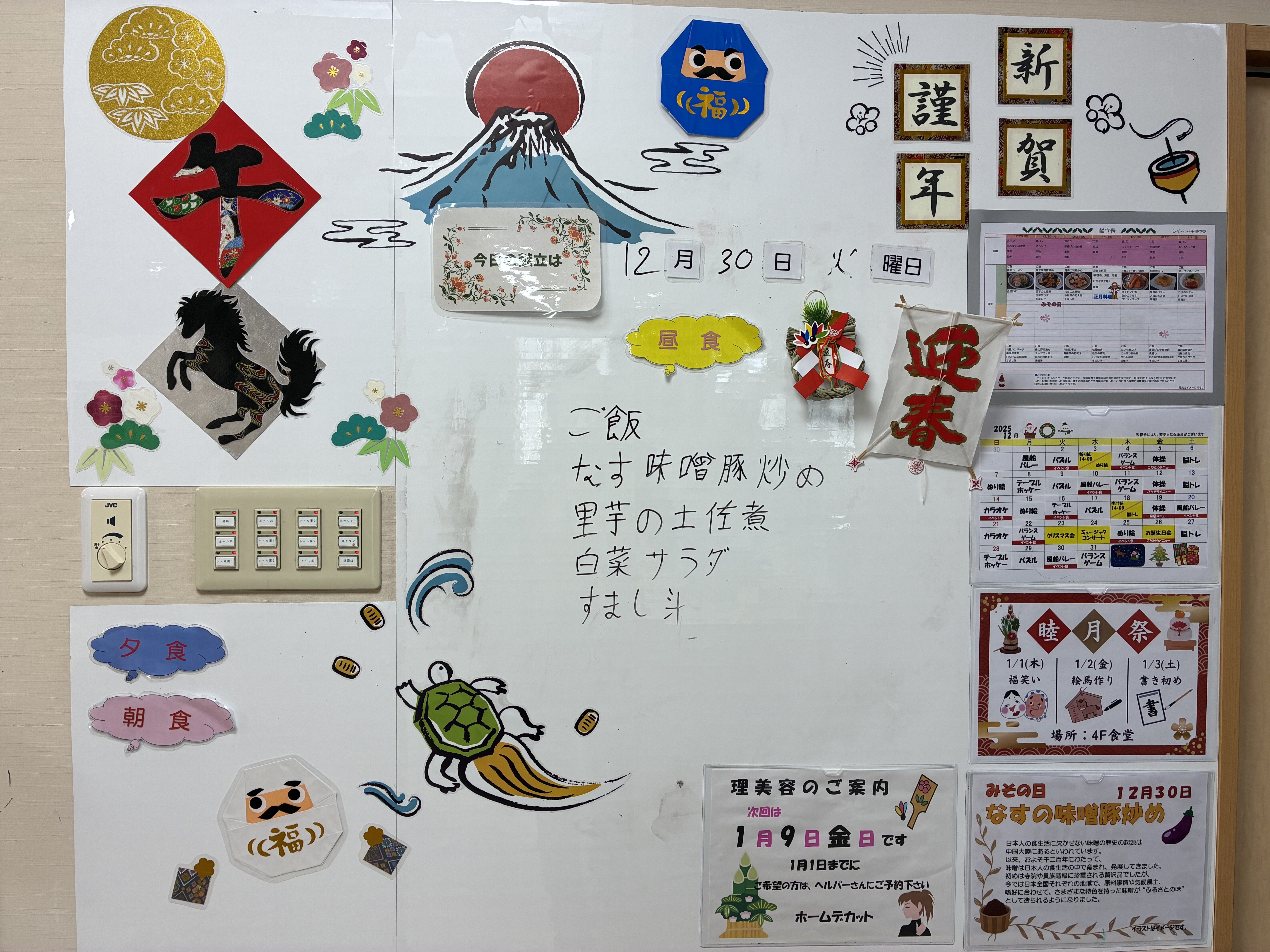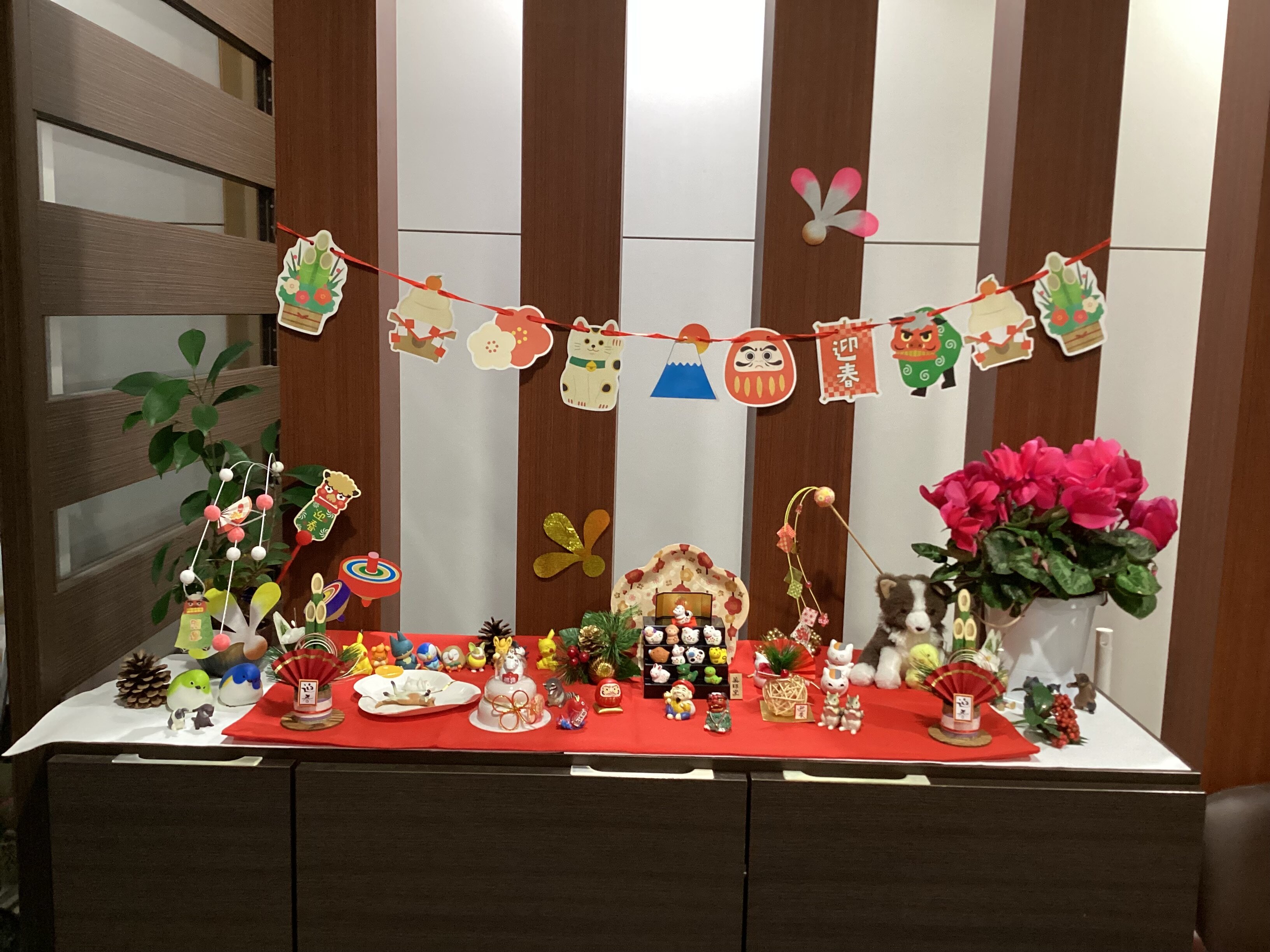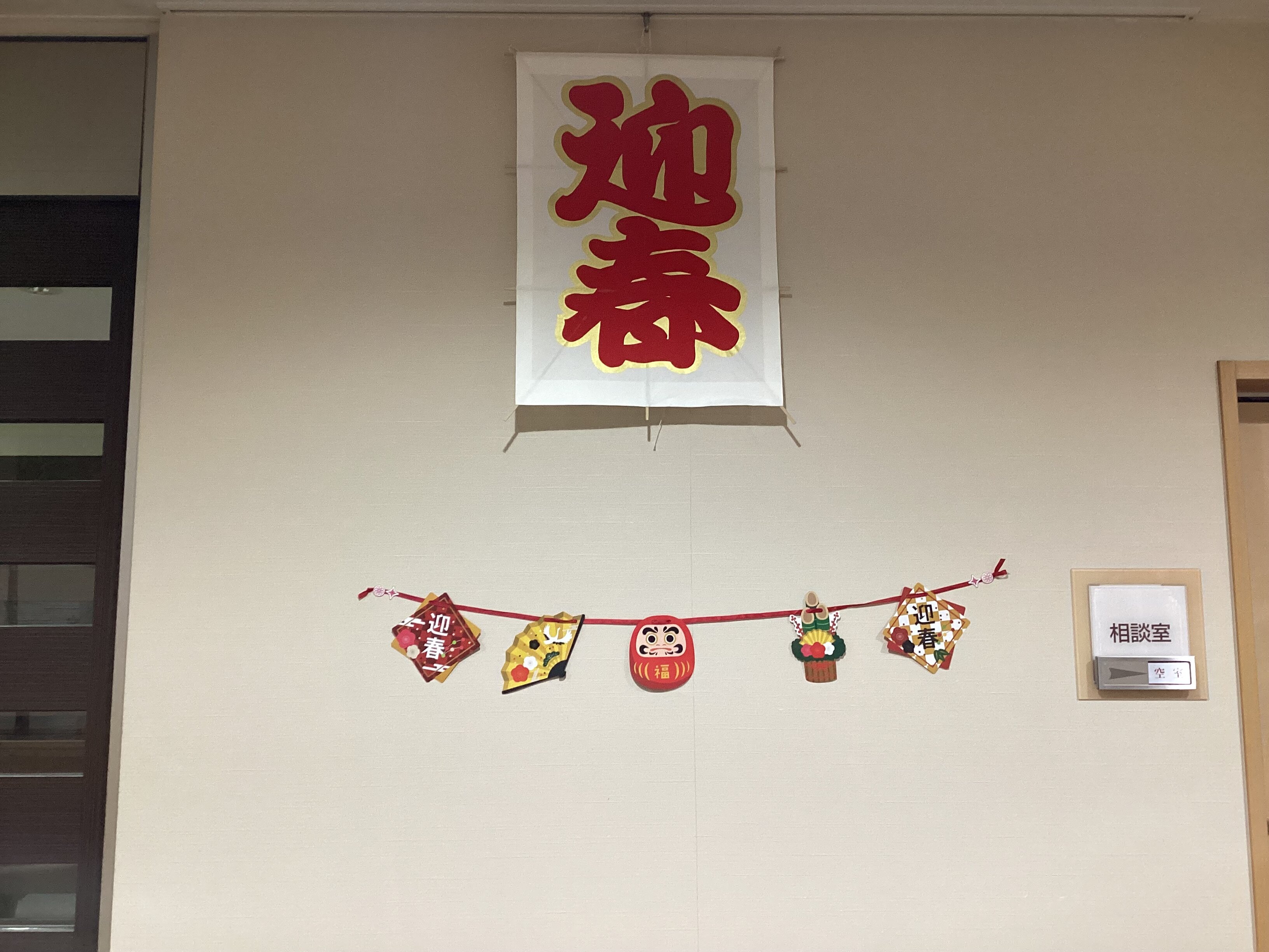 お正月の飾りつけを通して、季節を感じながら笑顔で過ごして頂ける空間づくりを、職員一同大切にしています。