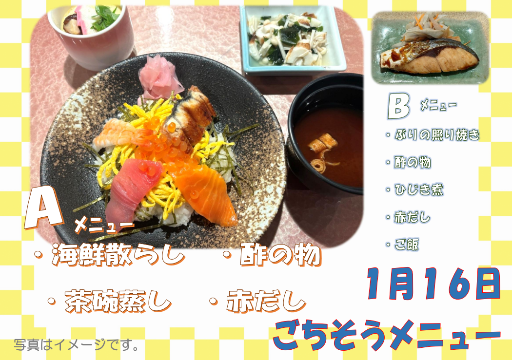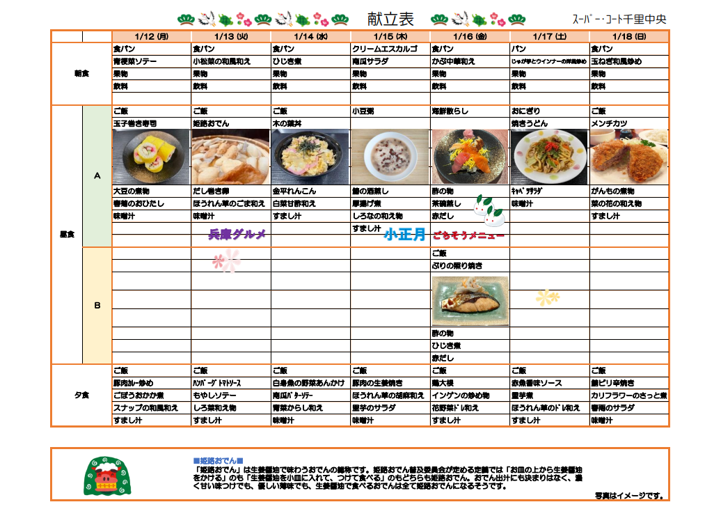 13日(火)は「姫路おでん」、15日(木)は「小豆粥」、16日(金)はごちそうメニュー「海鮮ちらし」をご提供します♪