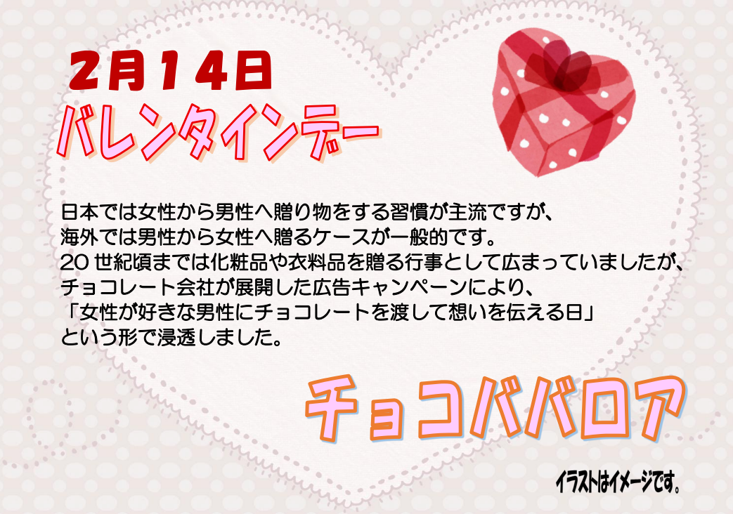 10日(火)は豚丼、13日(金)はごちそうメニュー「海鮮親子ドン」、14日(土)はバレンタインデー「チョコババロア」をご提供します♪