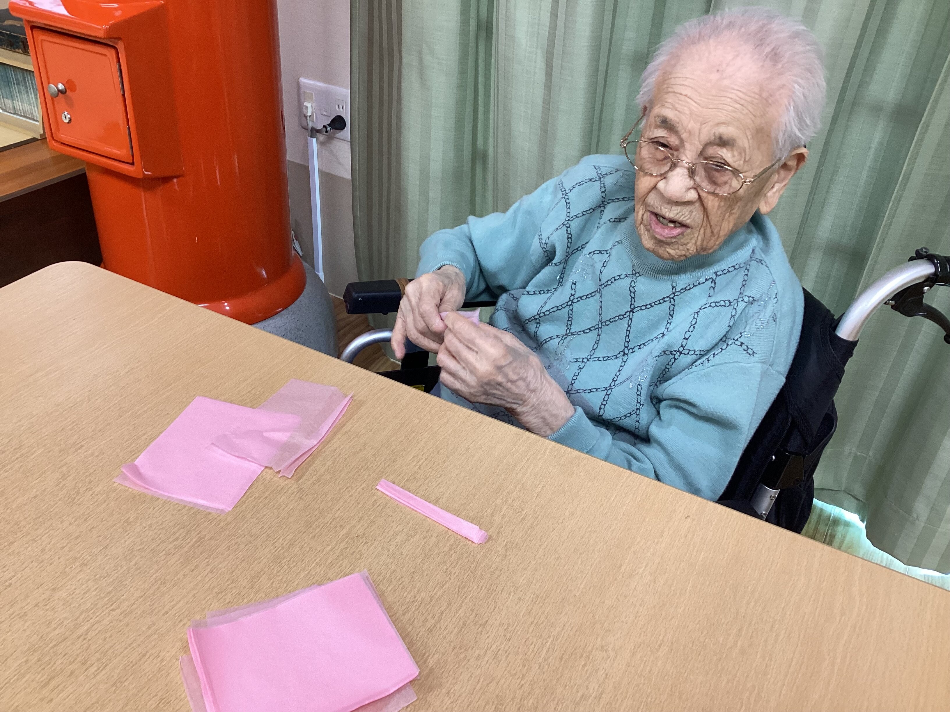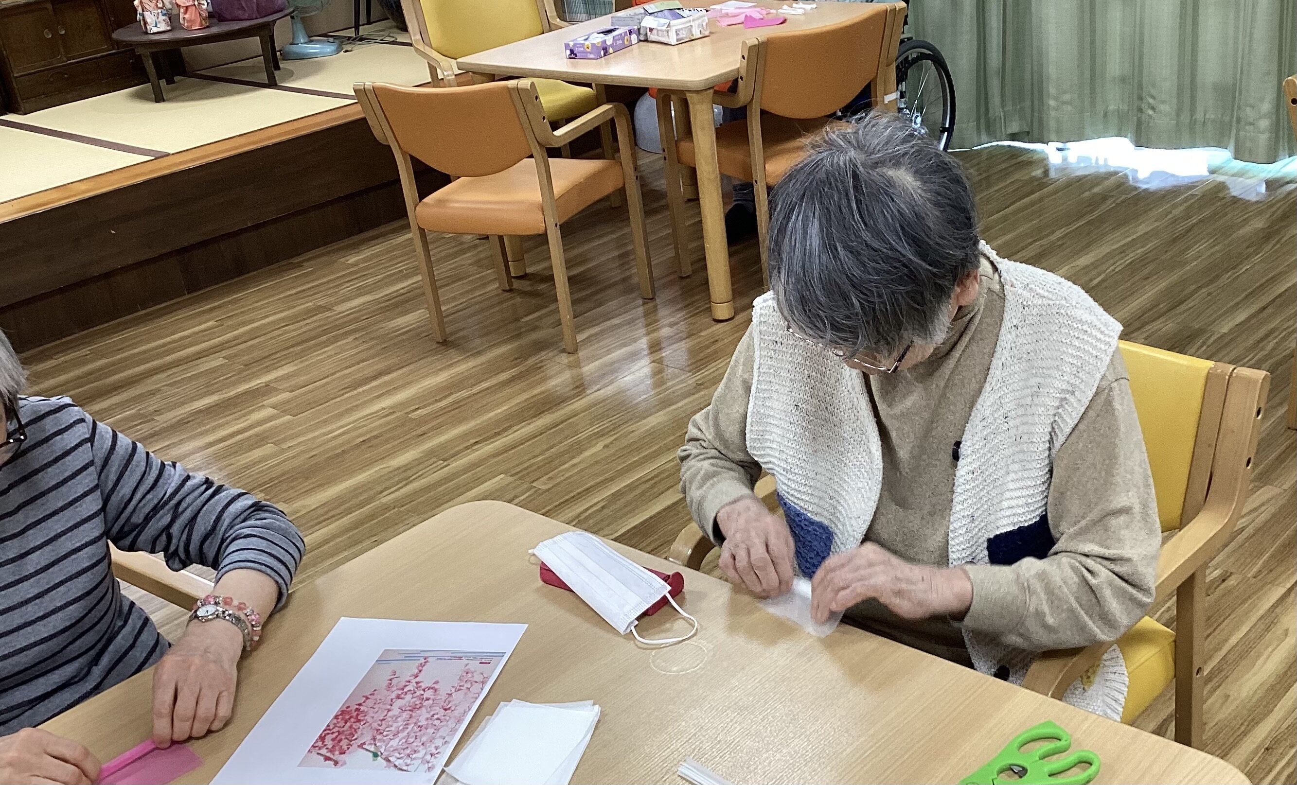 入居者さまたちと一緒にレクリエーションの時間に「枝垂れ桜」の工作を行いました。