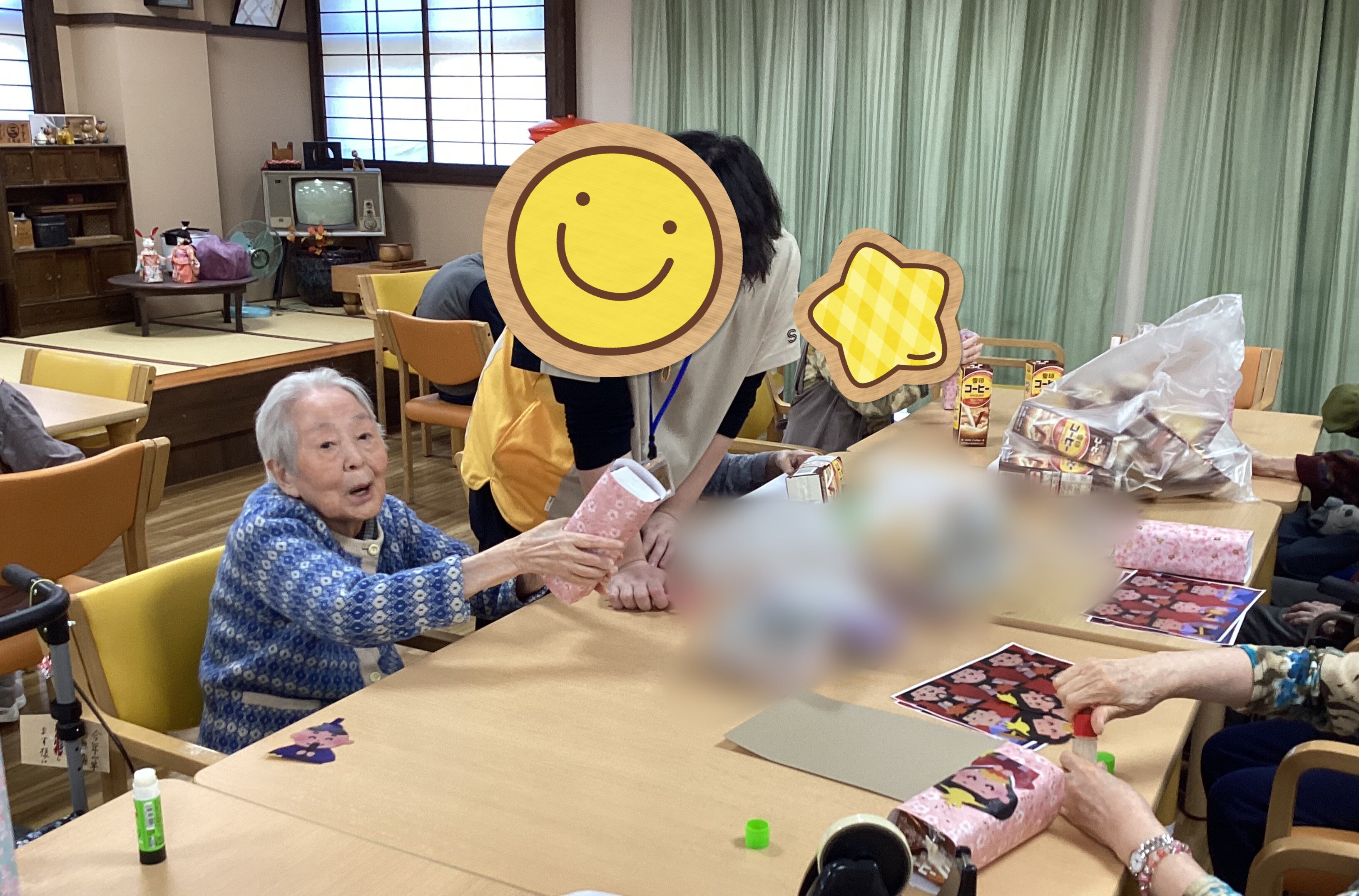 ひな祭り当日に行うゲームで使用するアイテムを、入居者の皆さまと一緒に手作りしました。