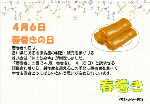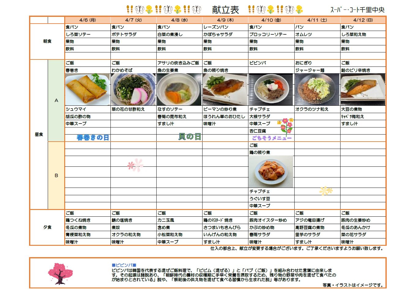 6日(月)は春巻きの日「春巻き」、8日(水)は貝の日「アサリの炊き込みご飯」、10日(金)はごちそうメニュー「ビビンバ」をご提供します!