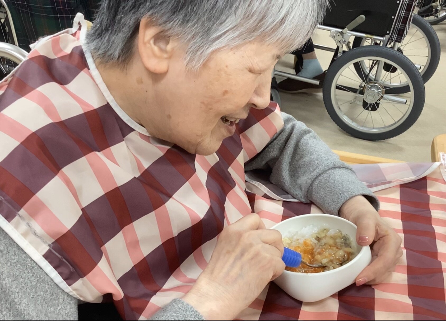 - 日常生活動作(ADL)の練習 最も重要となるのが、実際の生活動作を繰り返し練習することです。スプーンやお箸の持ち方、服の着脱などを丁寧に練習します。必要に応じて、滑り止めマットや自助具なども活用し、安全に食事ができるようにサポートします。