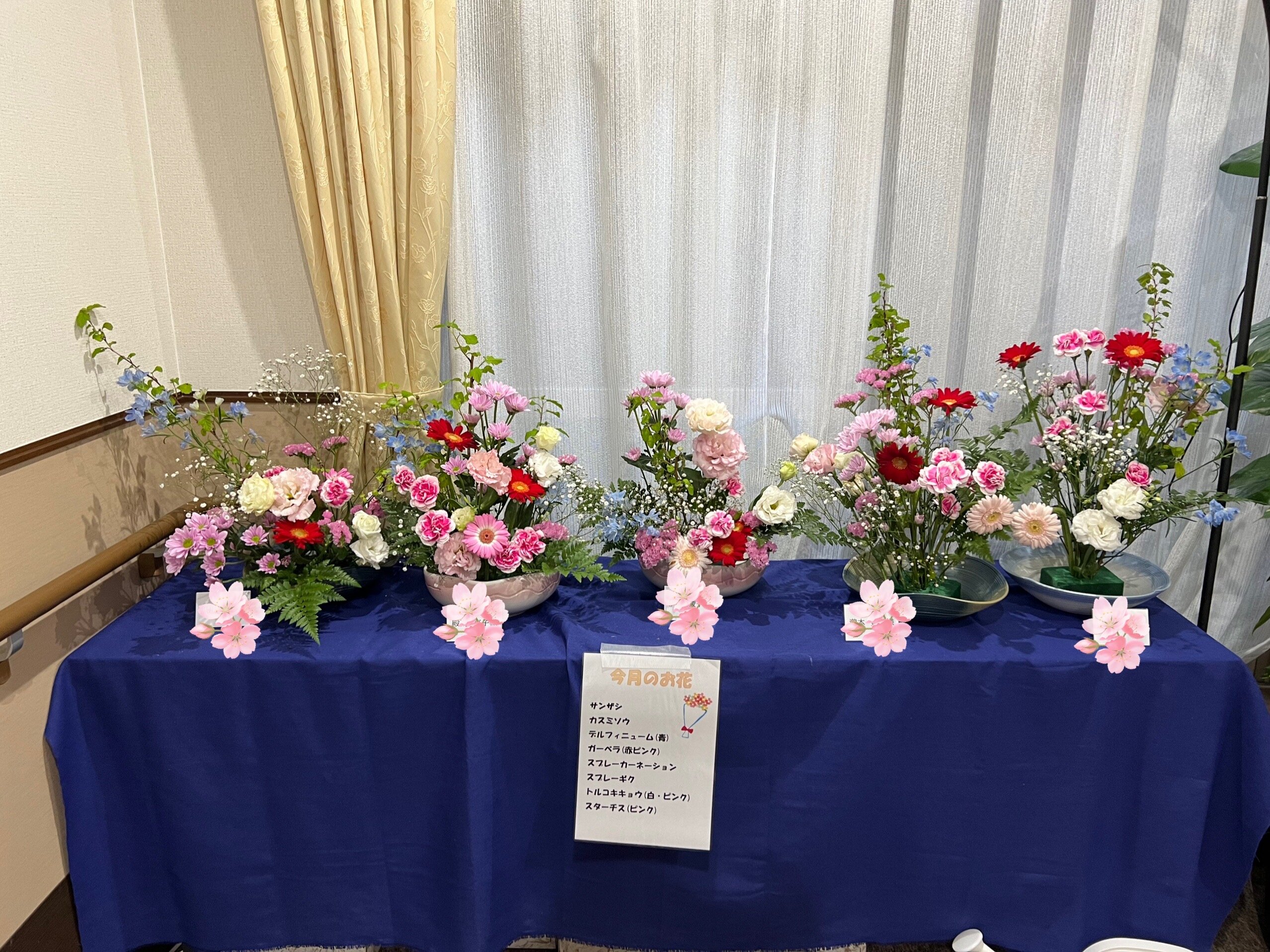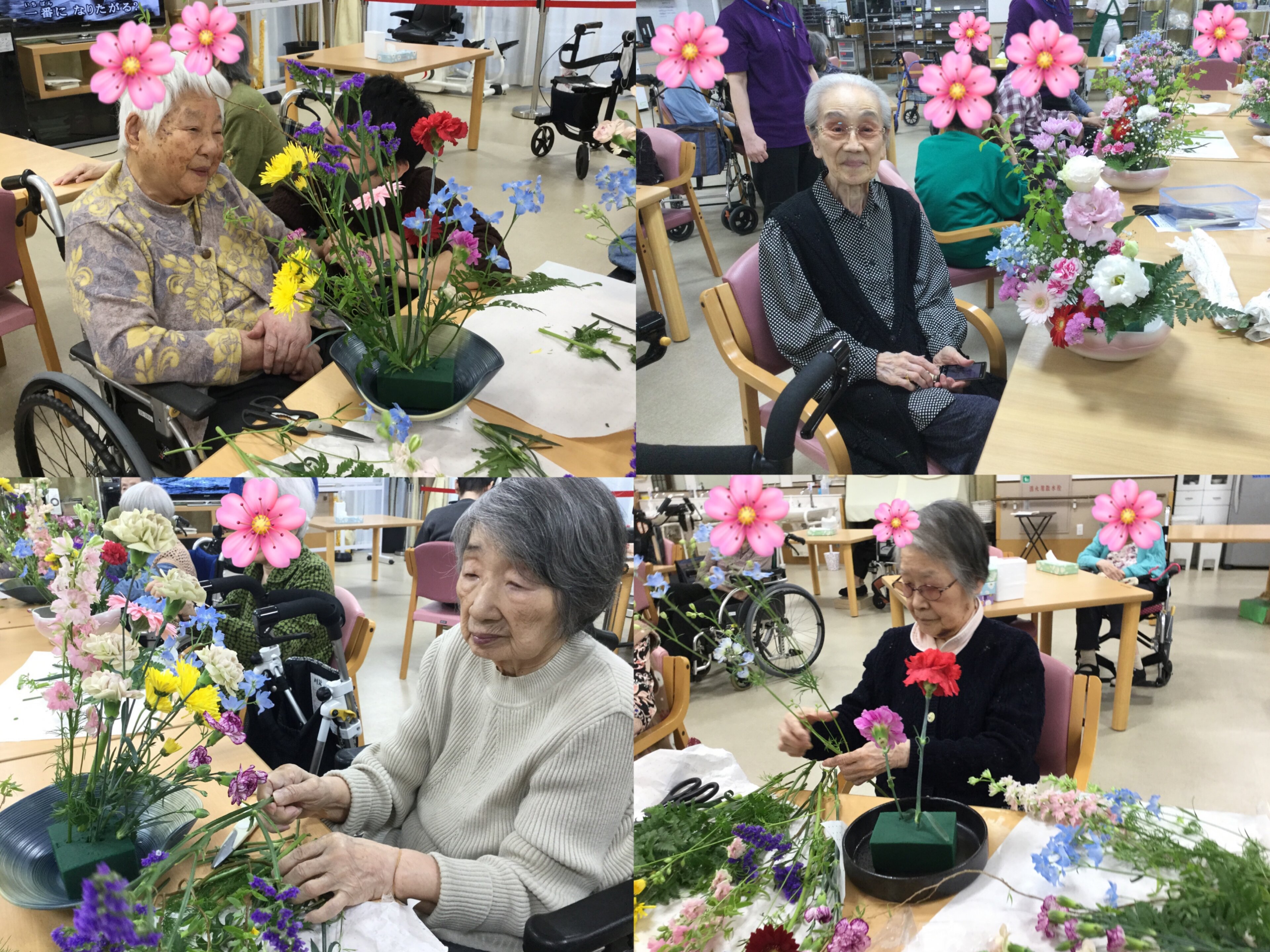 ピンク色が可愛いですよね。お花がお好きな方はたくさんおられましたが、ご自身で作るお花はより一層特別感がある事でしょう。完成した作品は一階玄関、廊下など、皆様が見えるところに展示しております。機会があれば、もっとたくさんの方々に見ていただきたいです。