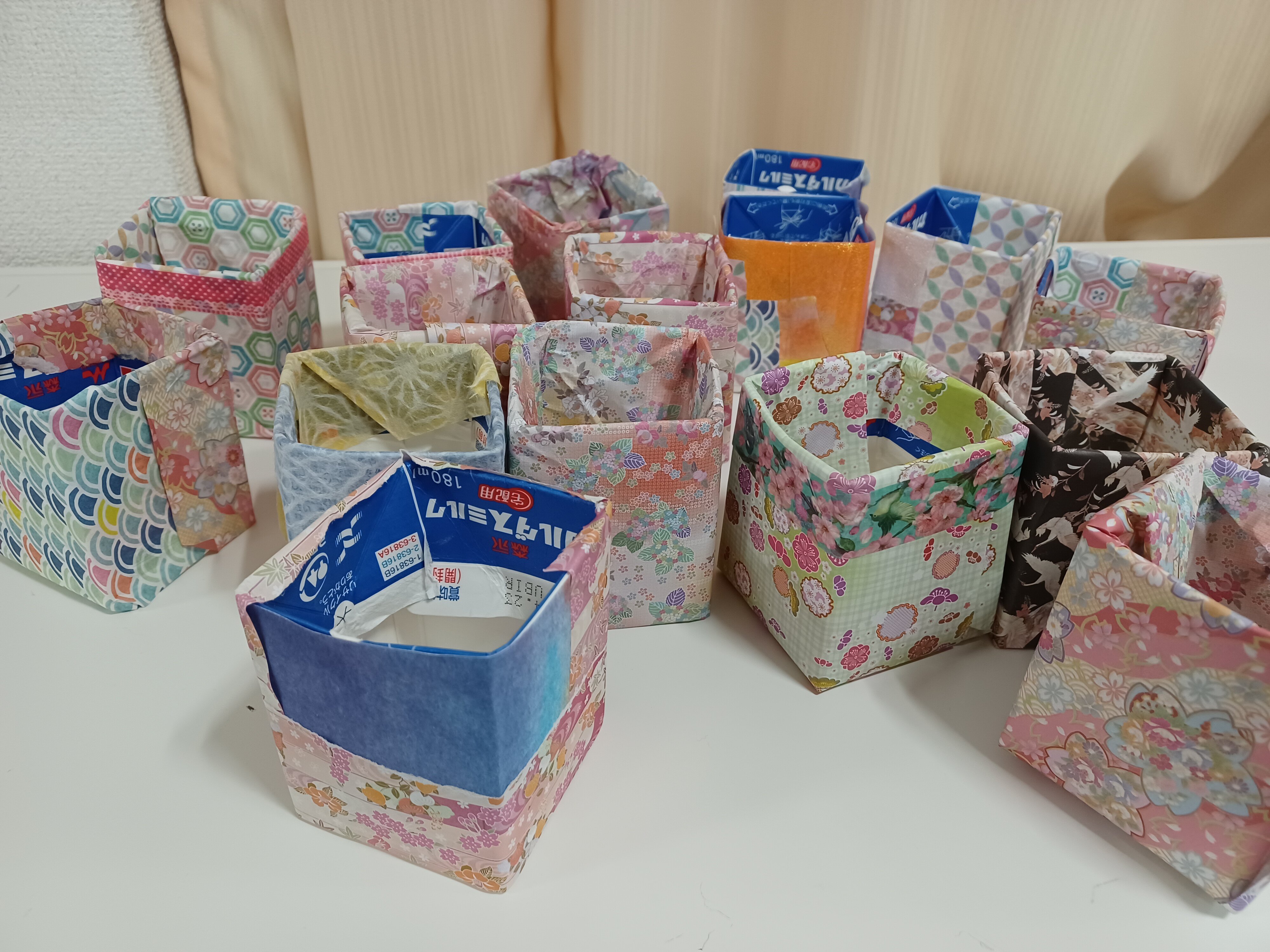 牛乳パックに千代紙やテープを張り付けて飾り付けています。