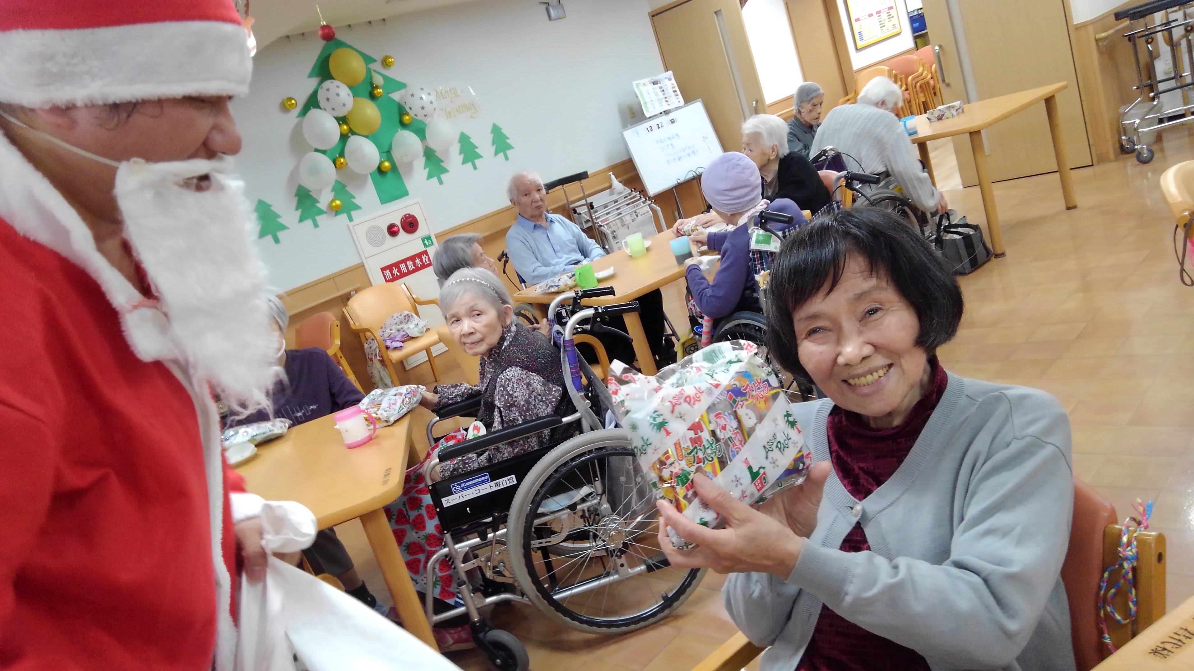 その時、なんとサンタさんがご入居者の皆さんにプレゼントを渡しに、はるばるやってきてくれました!