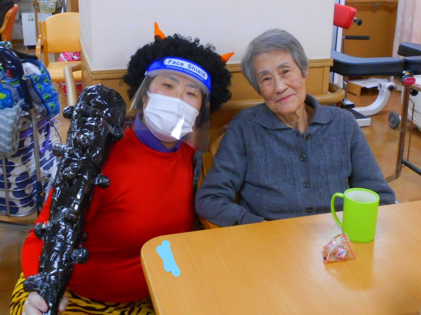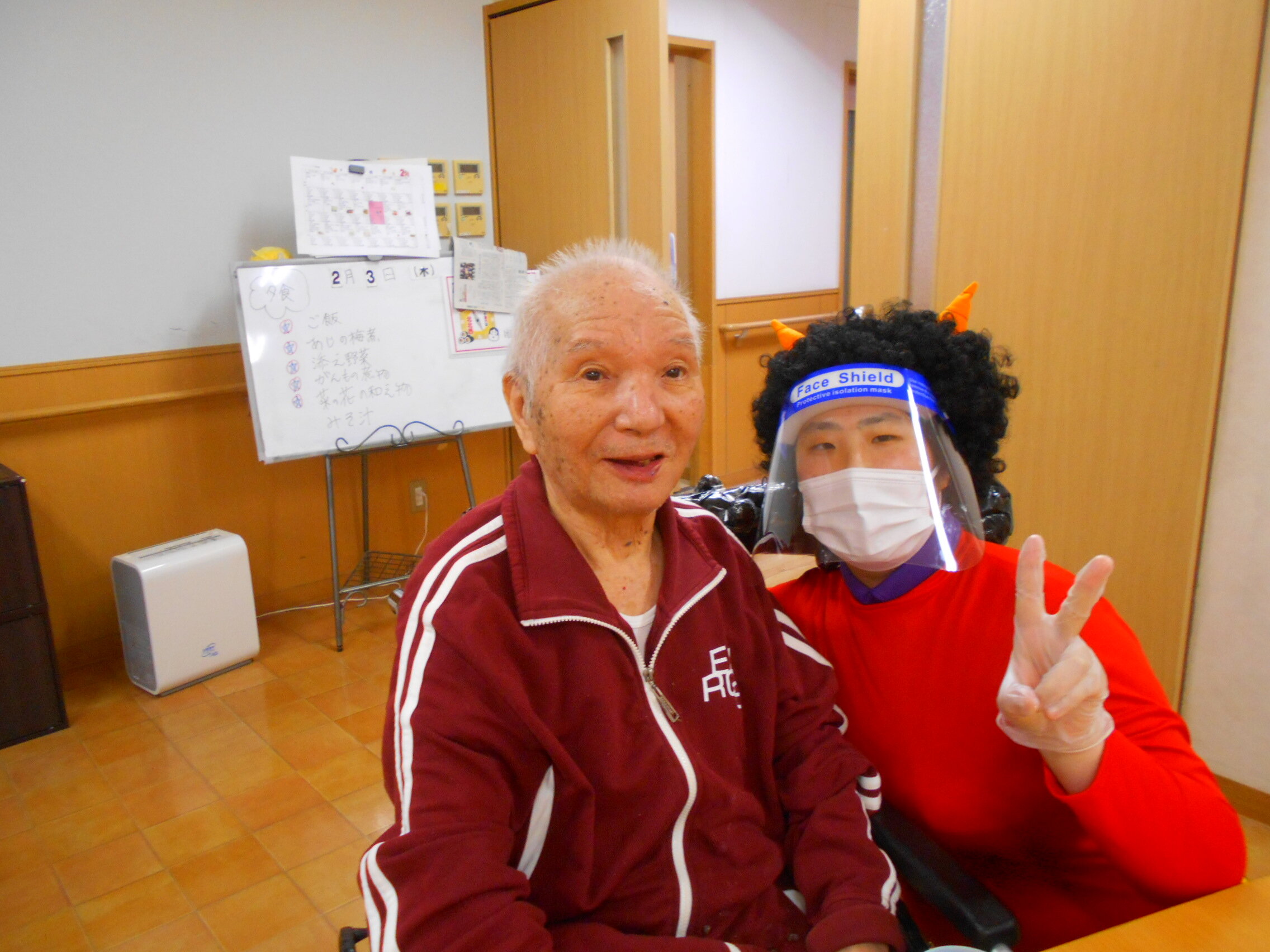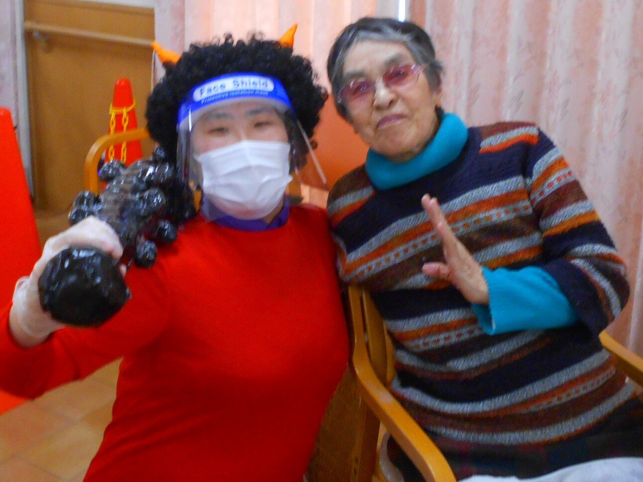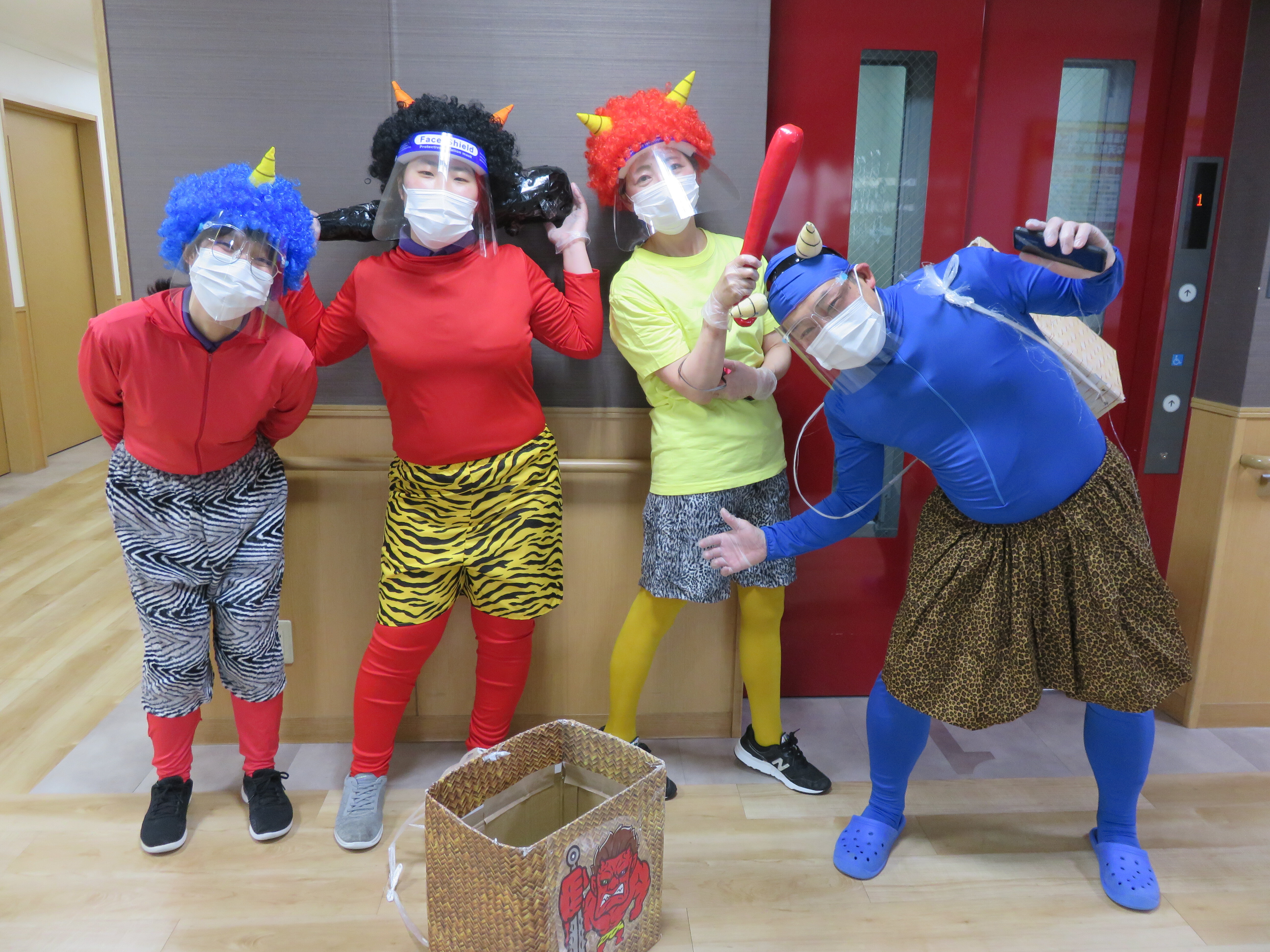 今年の鬼は感染対策のためフェイスシールドをつけています!!