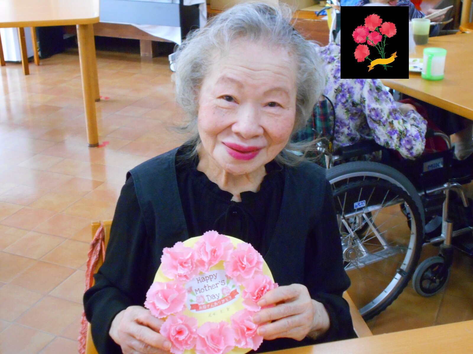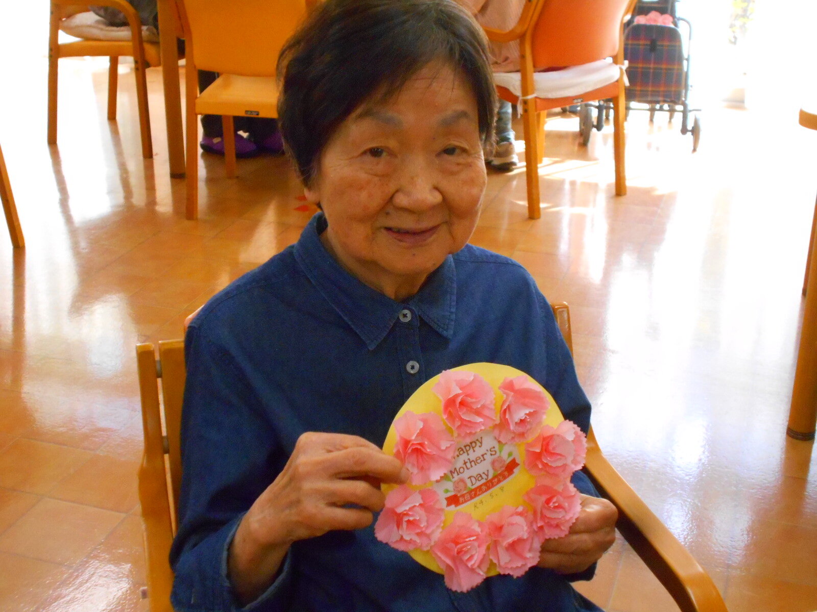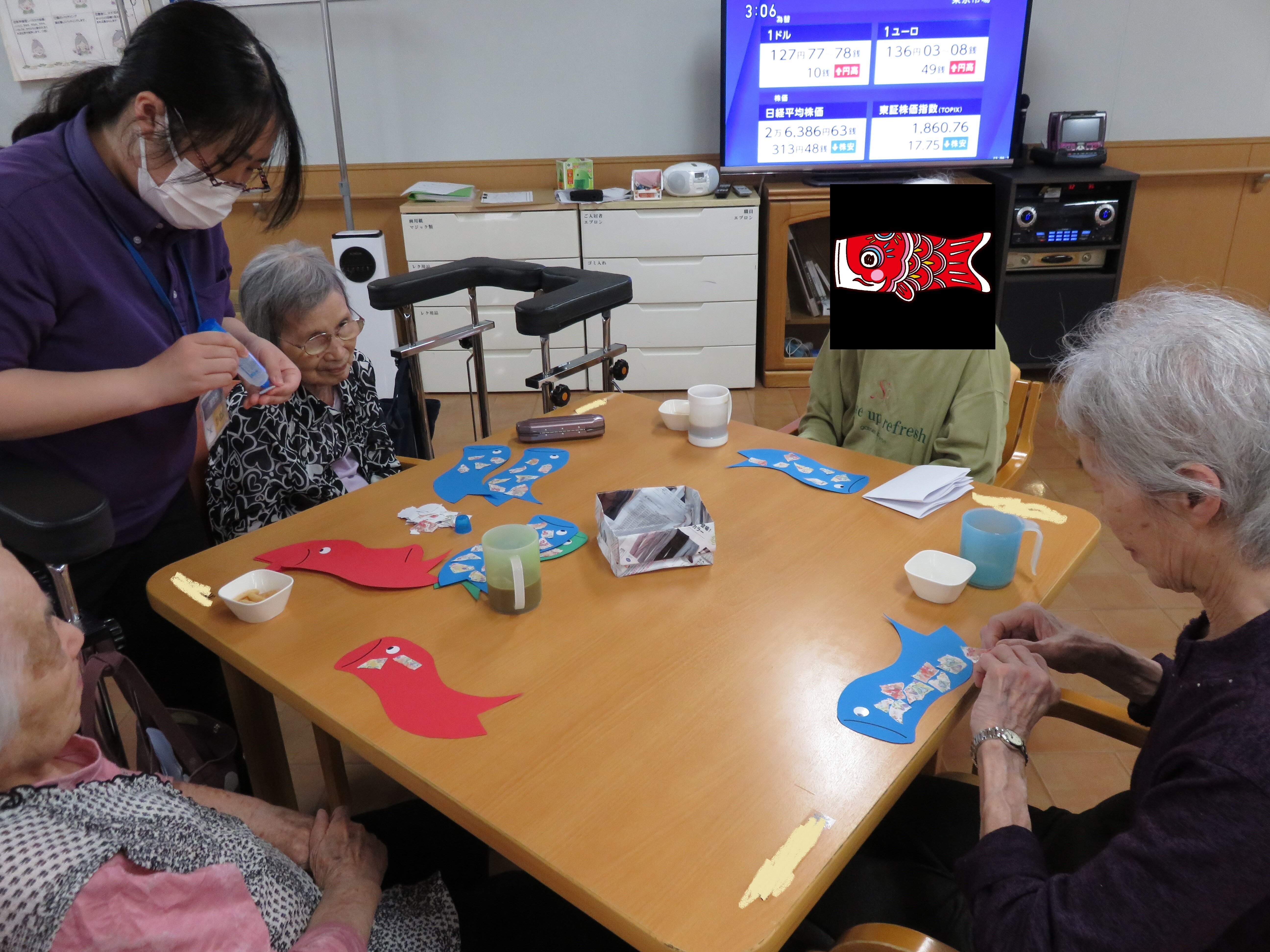 堺白鷺では5月前ににご入居者の皆さまにこいのぼりを作って頂きました。5月8日には母の日レクを行いました!!