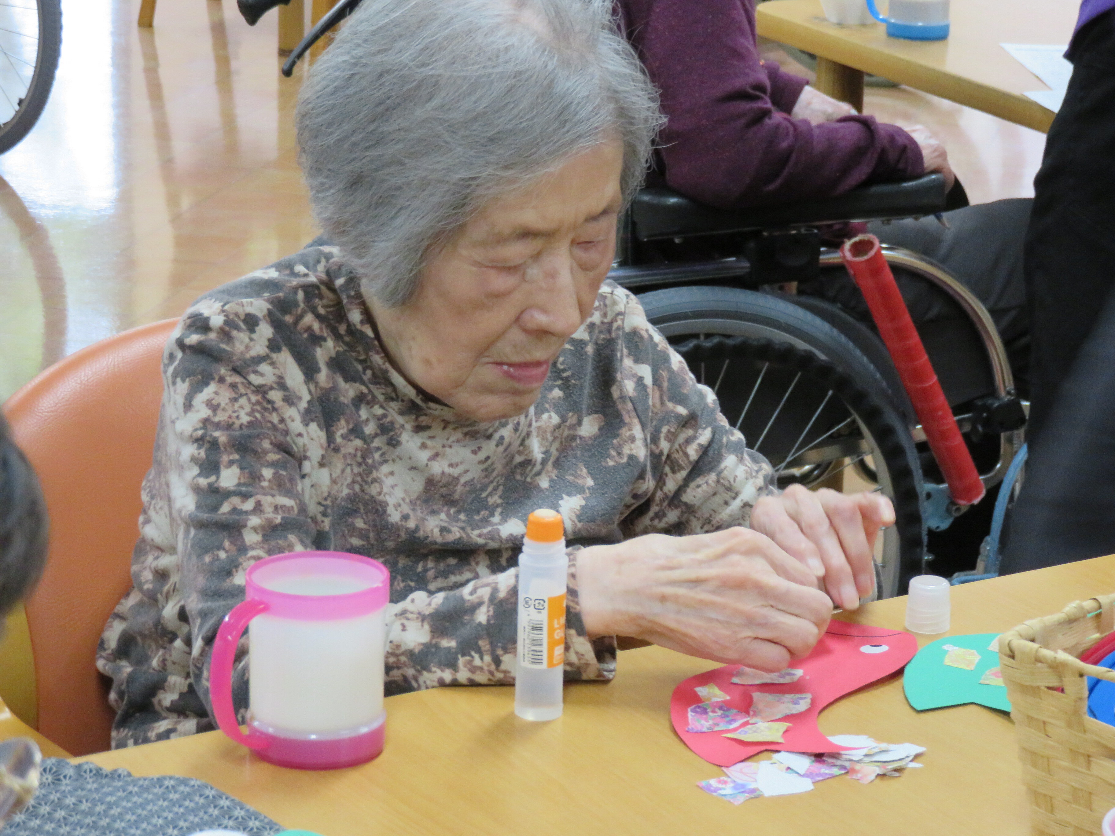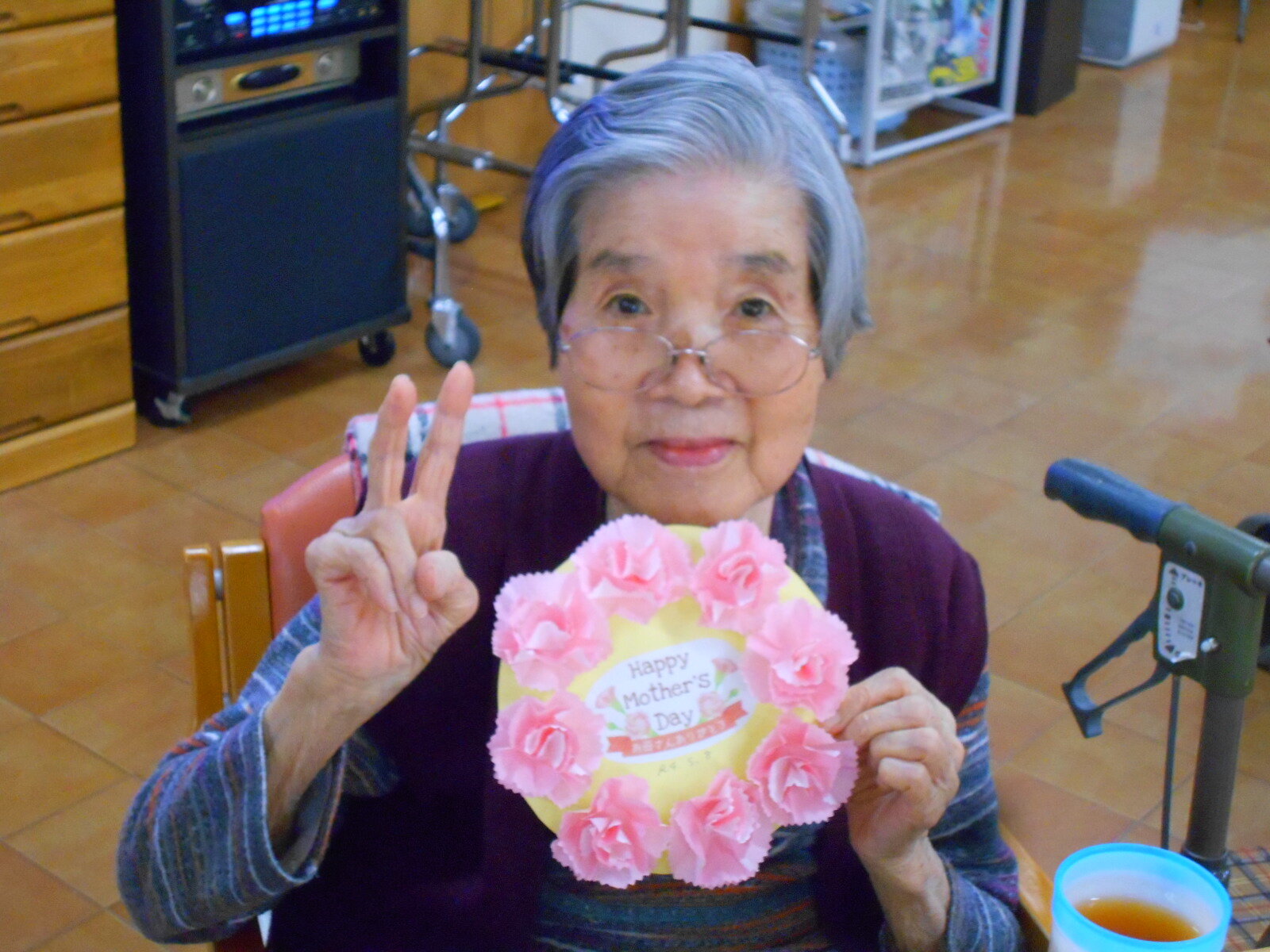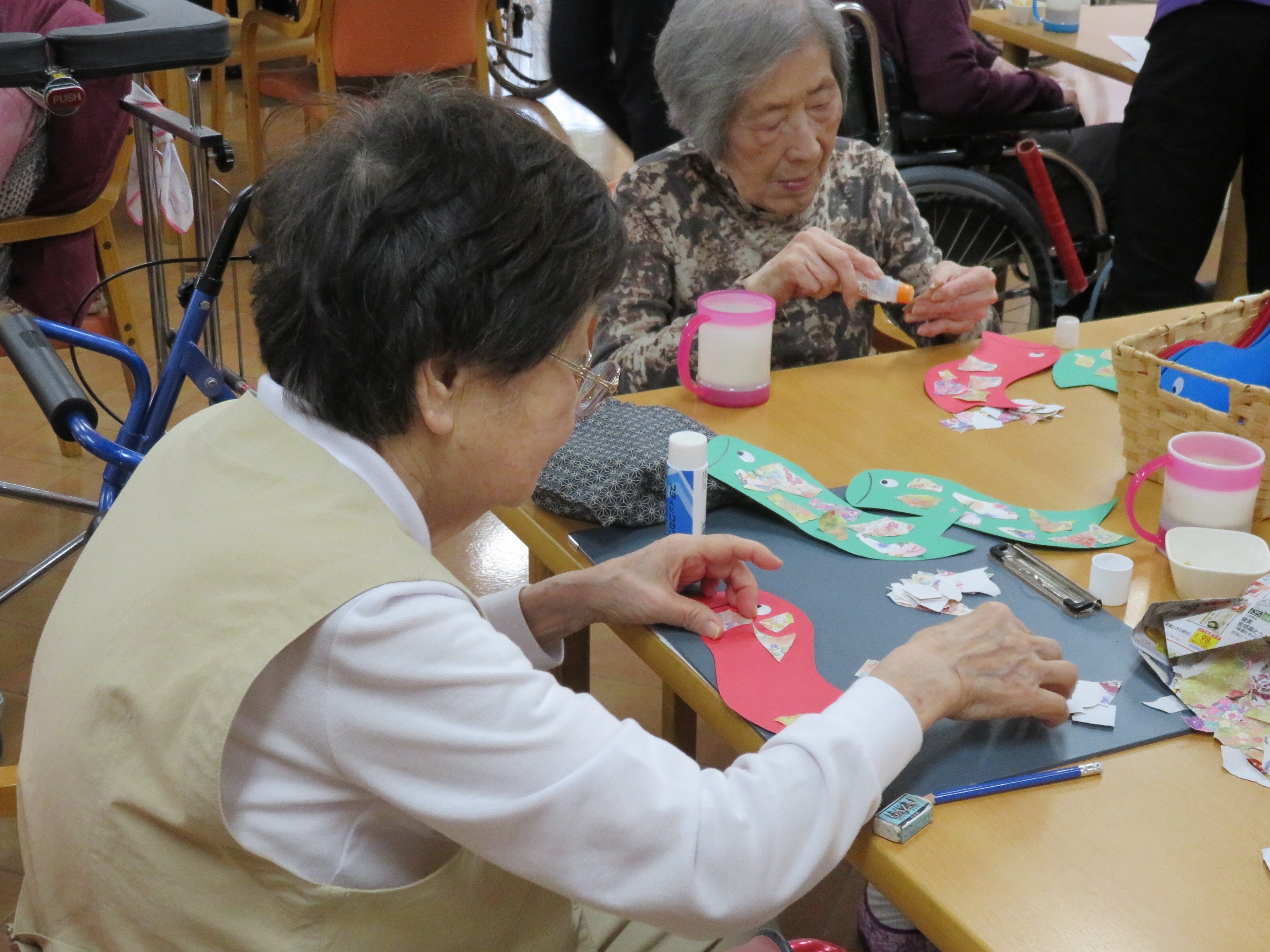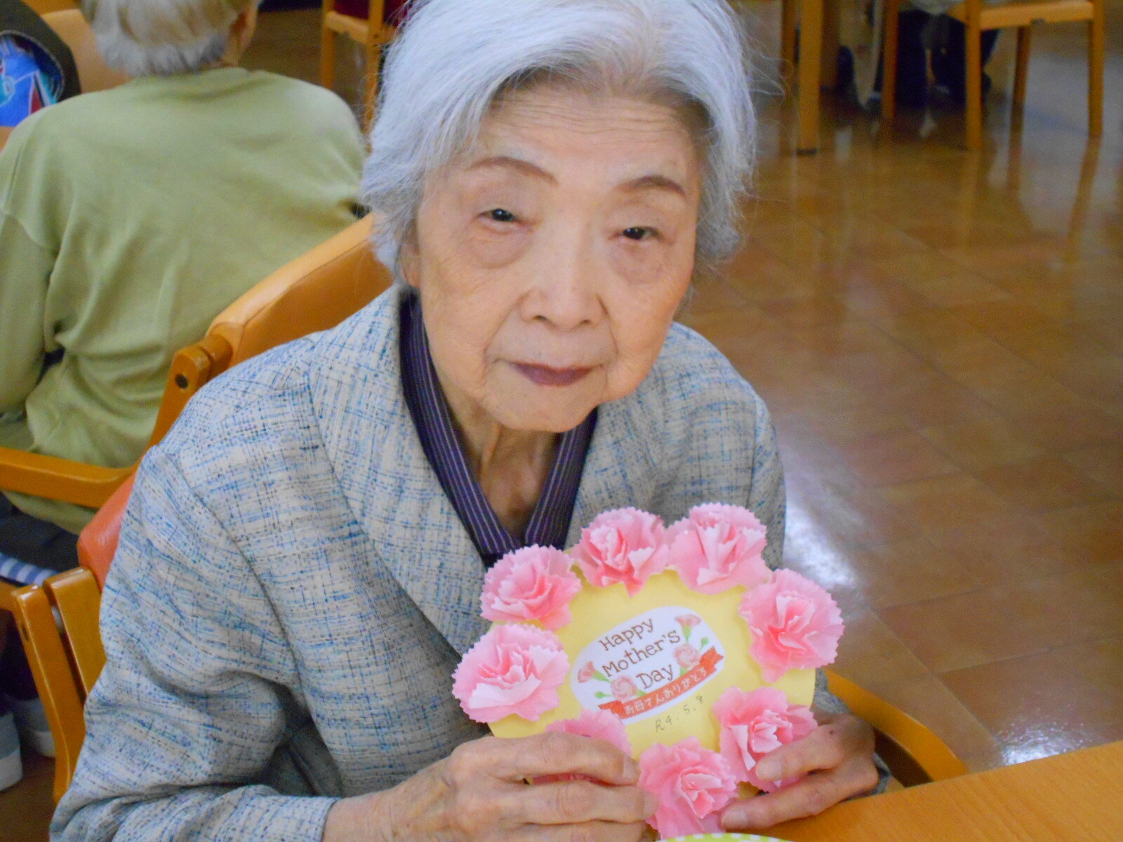 堺白鷺では5月前ににご入居者の皆さまにこいのぼりを作って頂きました。5月8日には母の日レクを行いました!!