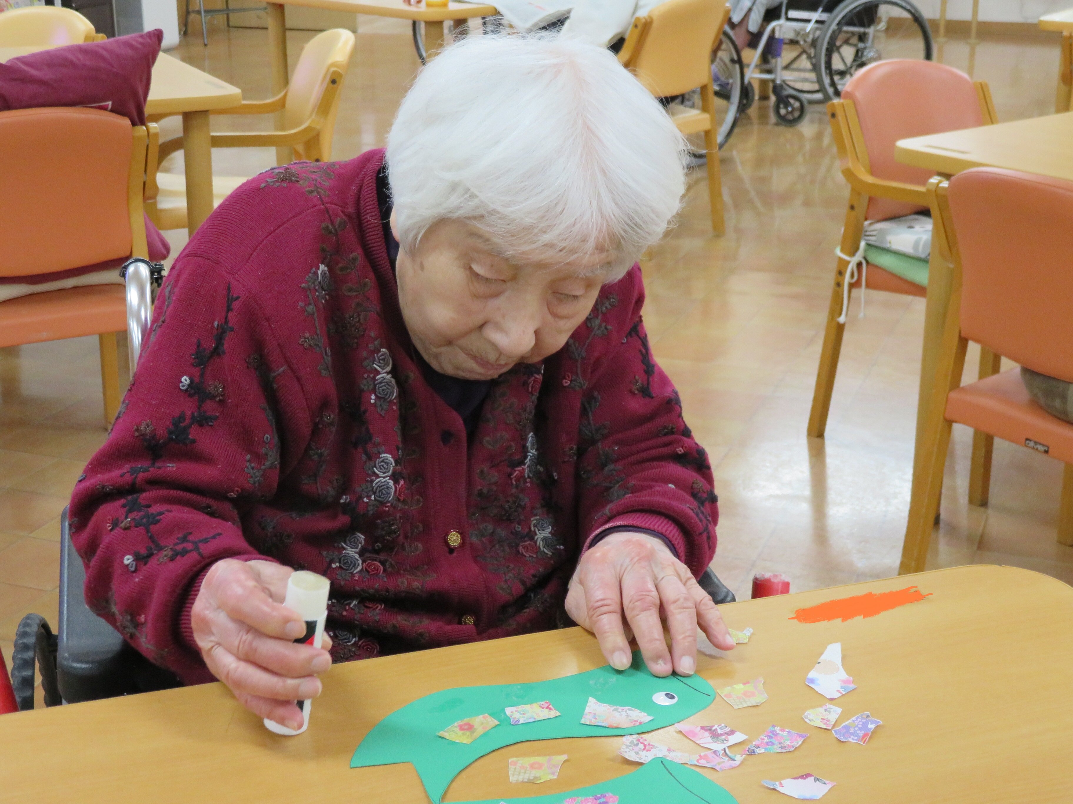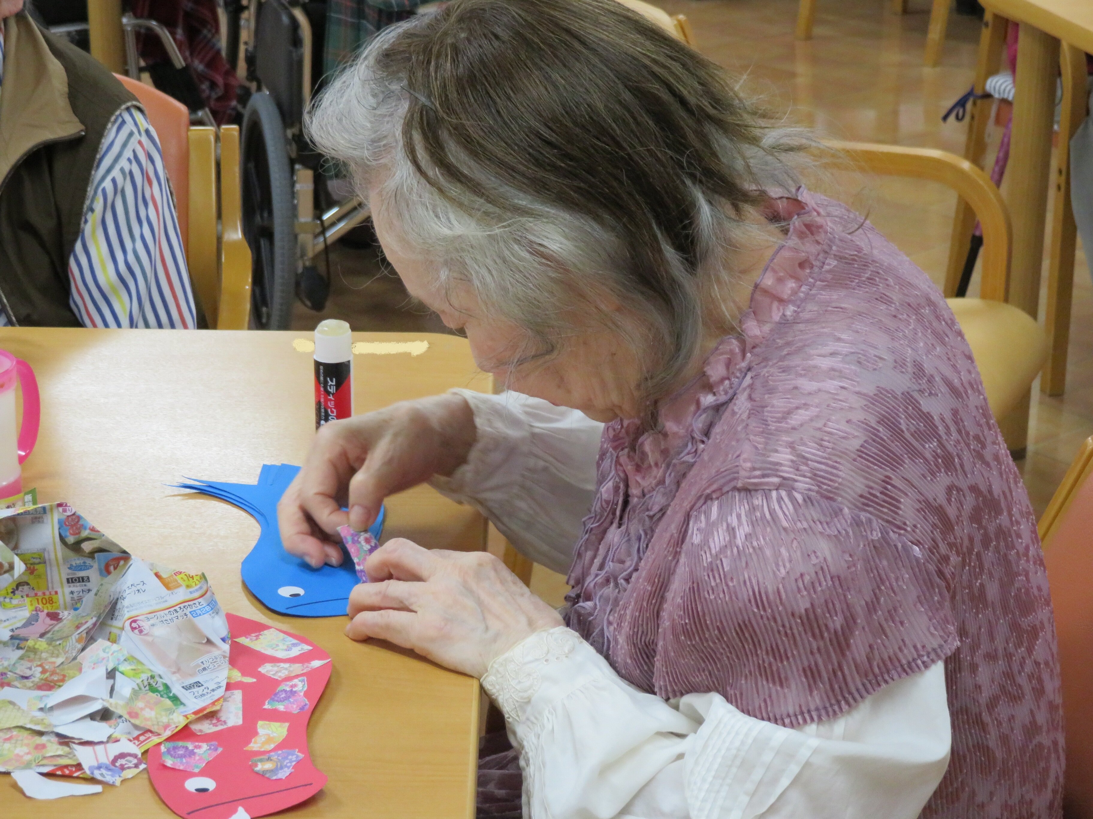 鯉のぼりの形に切った画用紙に柄付きのおりがみをちぎって鱗を作って頂きました!