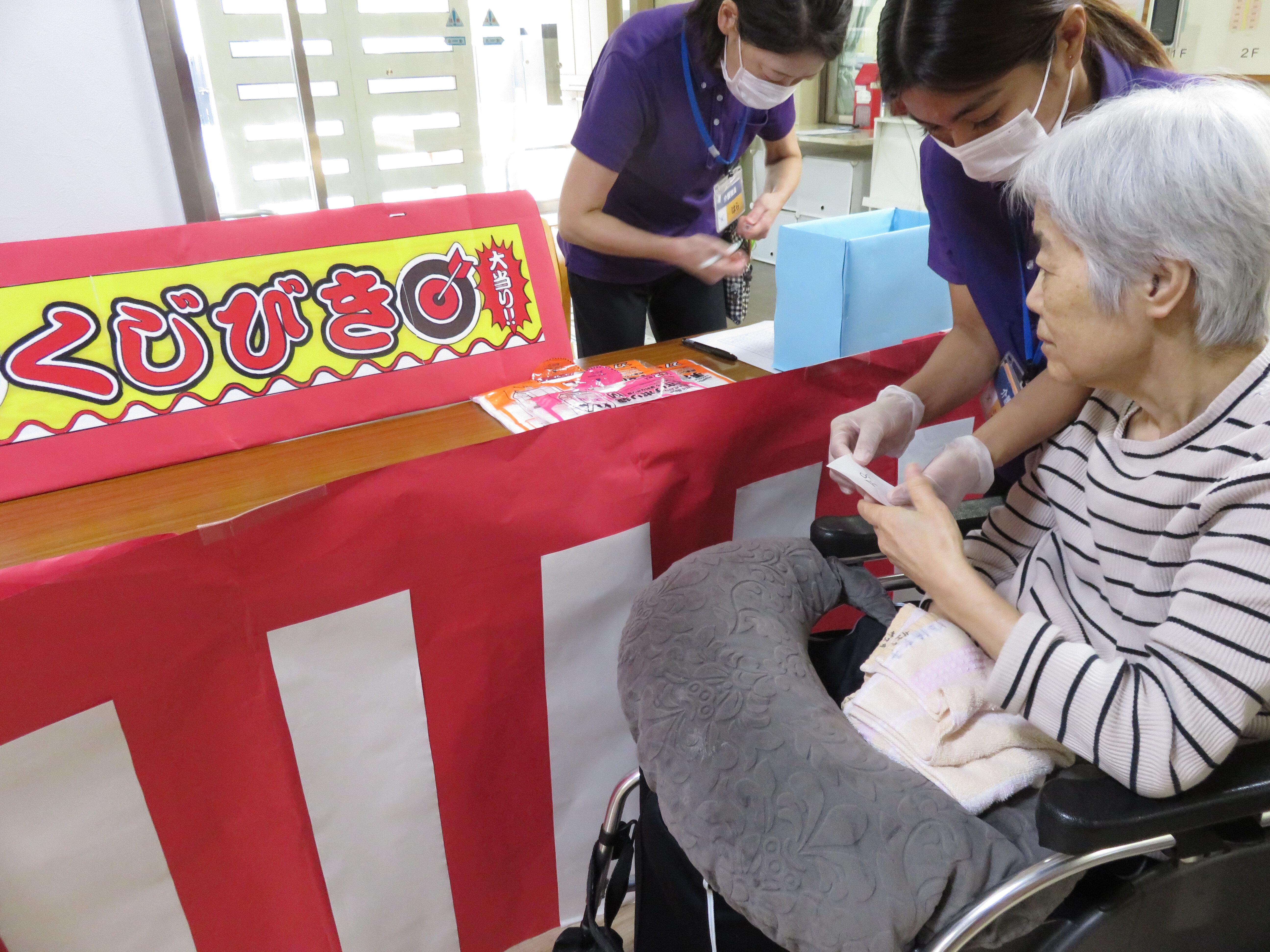 納涼祭当日、午前中にくじ引き、コイン落とし、ヨーヨー釣りを行いました!