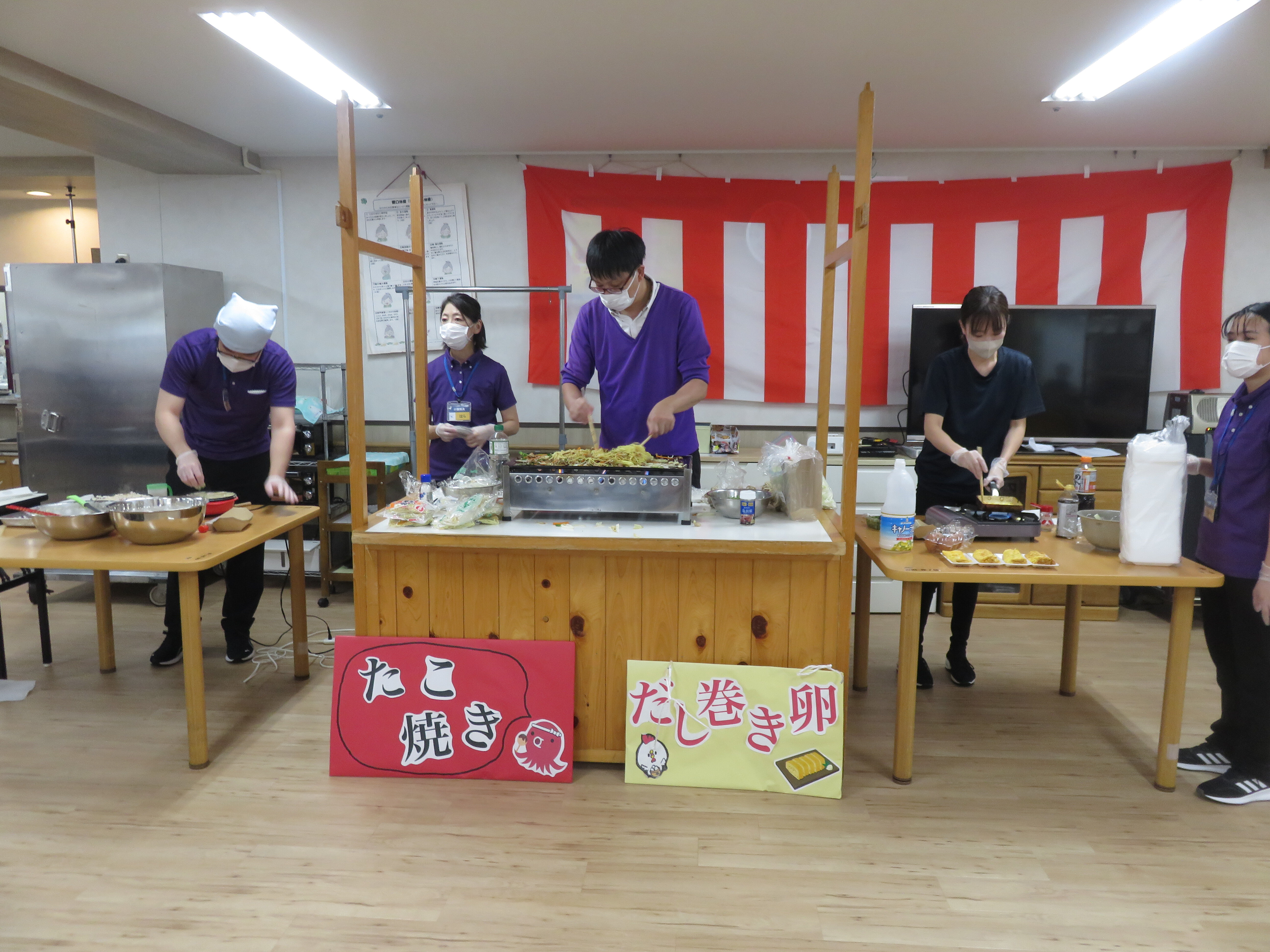 焼きそば、だし巻き卵、たこ焼き、フライドポテト、きゅうり一本漬け、ミニおにぎり