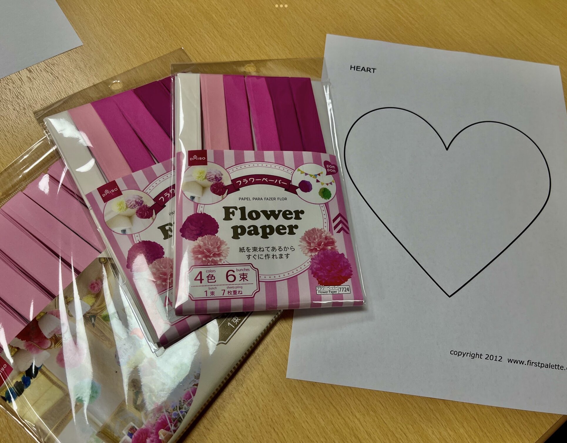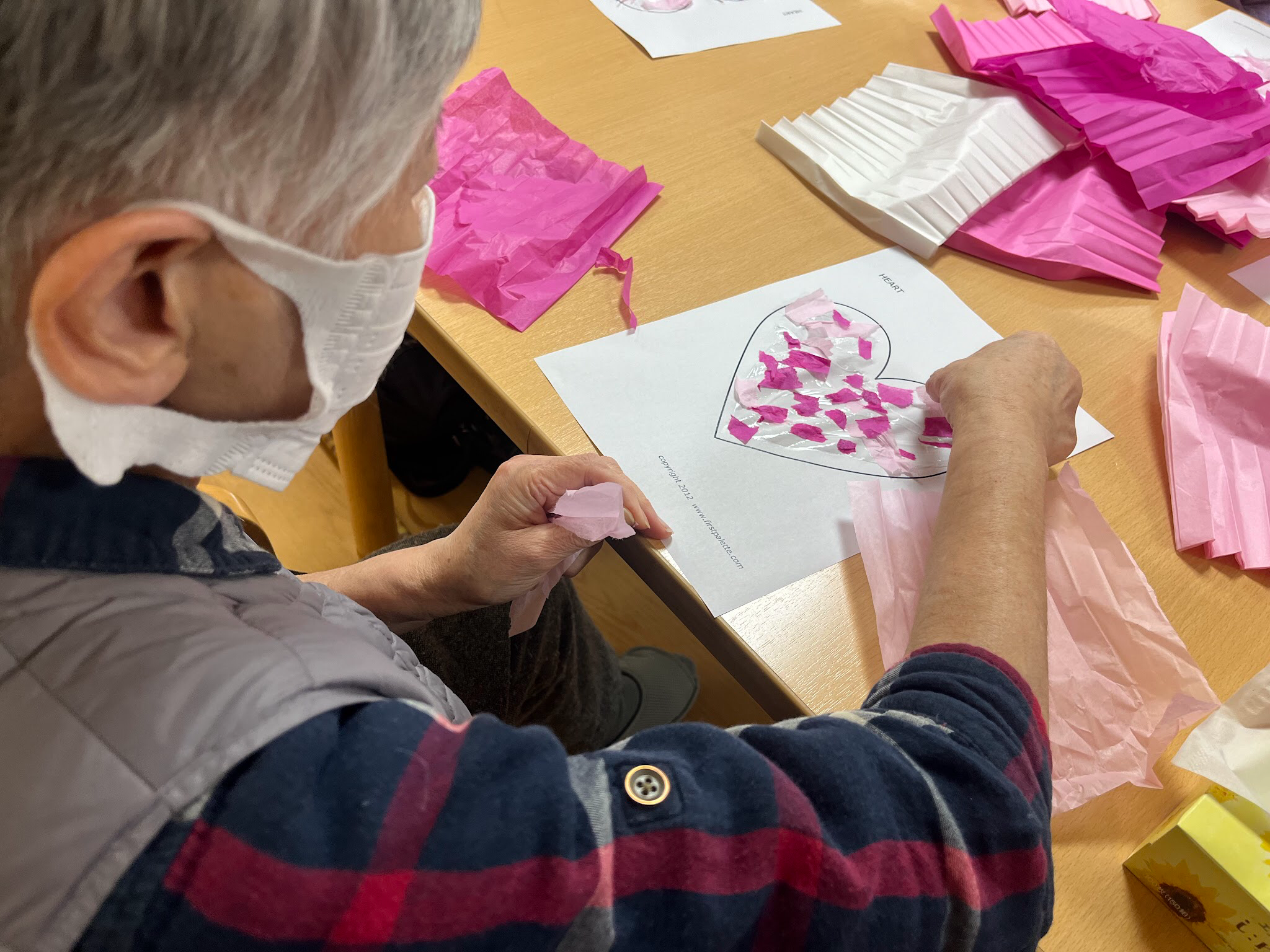 【材料】フラワーペーパー、のり、ハートの枠が描かれた紙