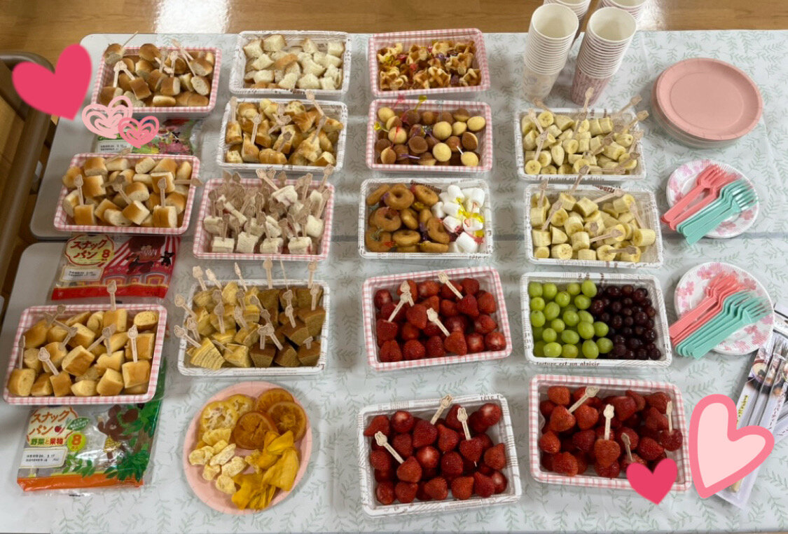 バナナ、イチゴ、ブドウなどの果物、パンやカステラ・マシュマロなどのお菓子たくさん準備しました(*´▽`*)