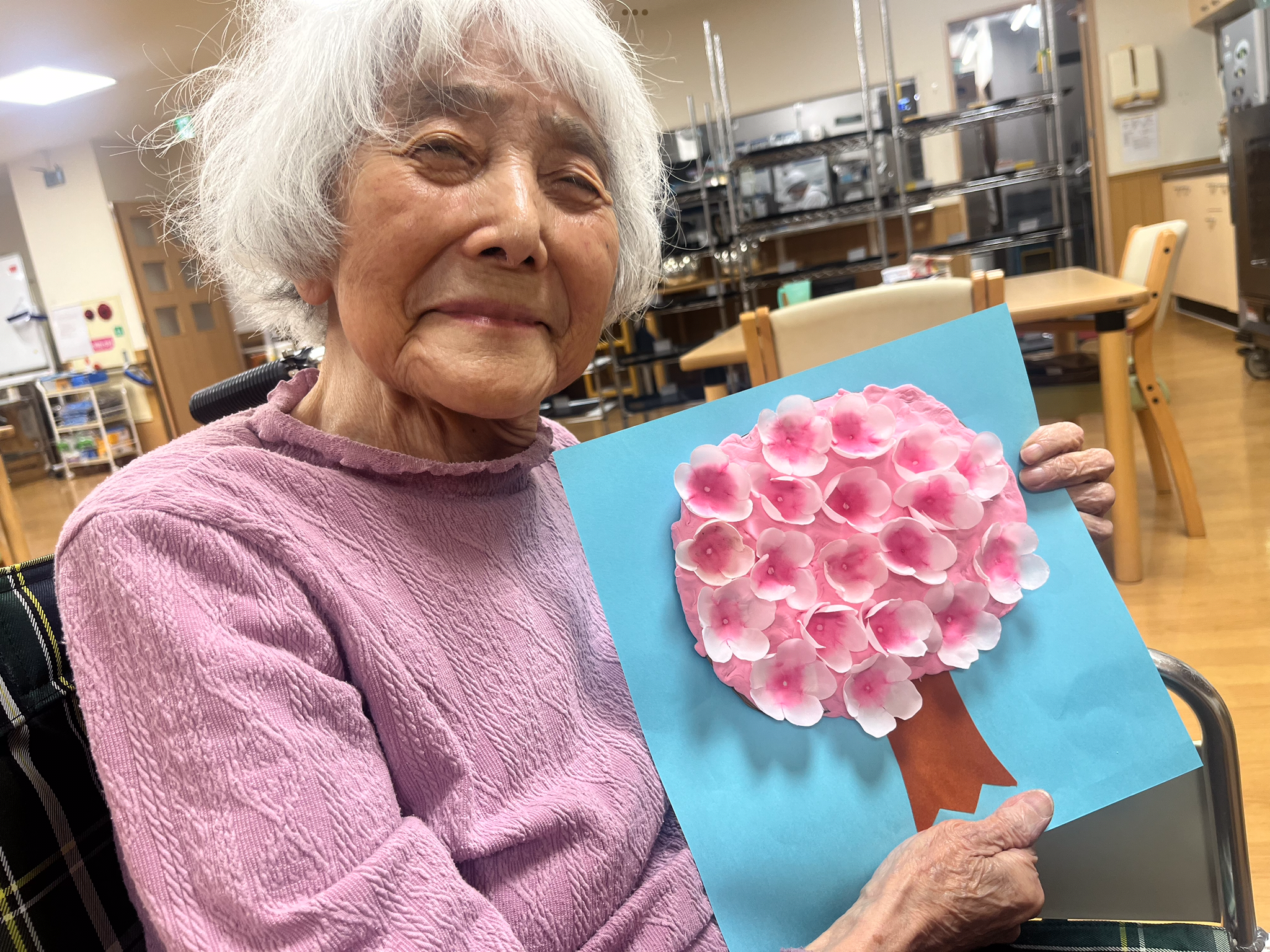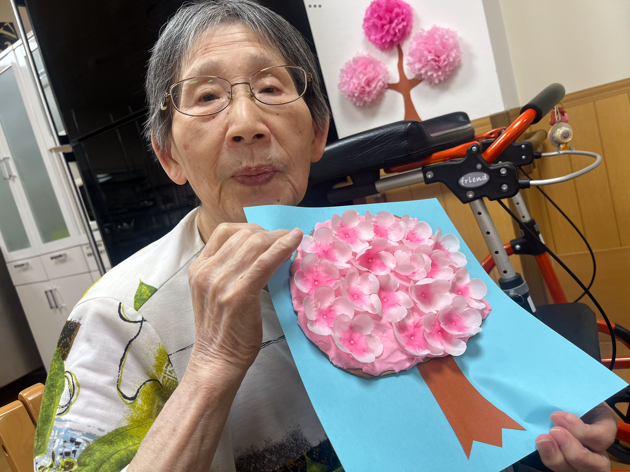 材料はピンクの粘土、桜の紙花、ダンボール、画用紙です(^^♪