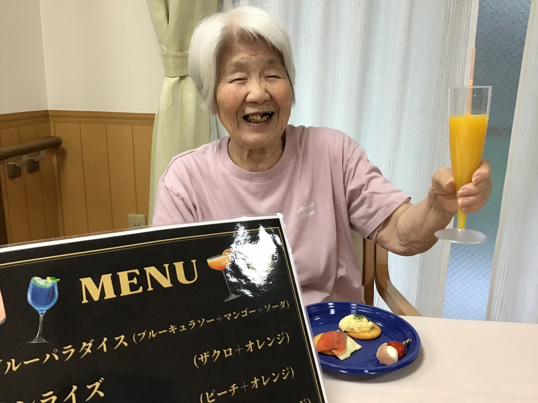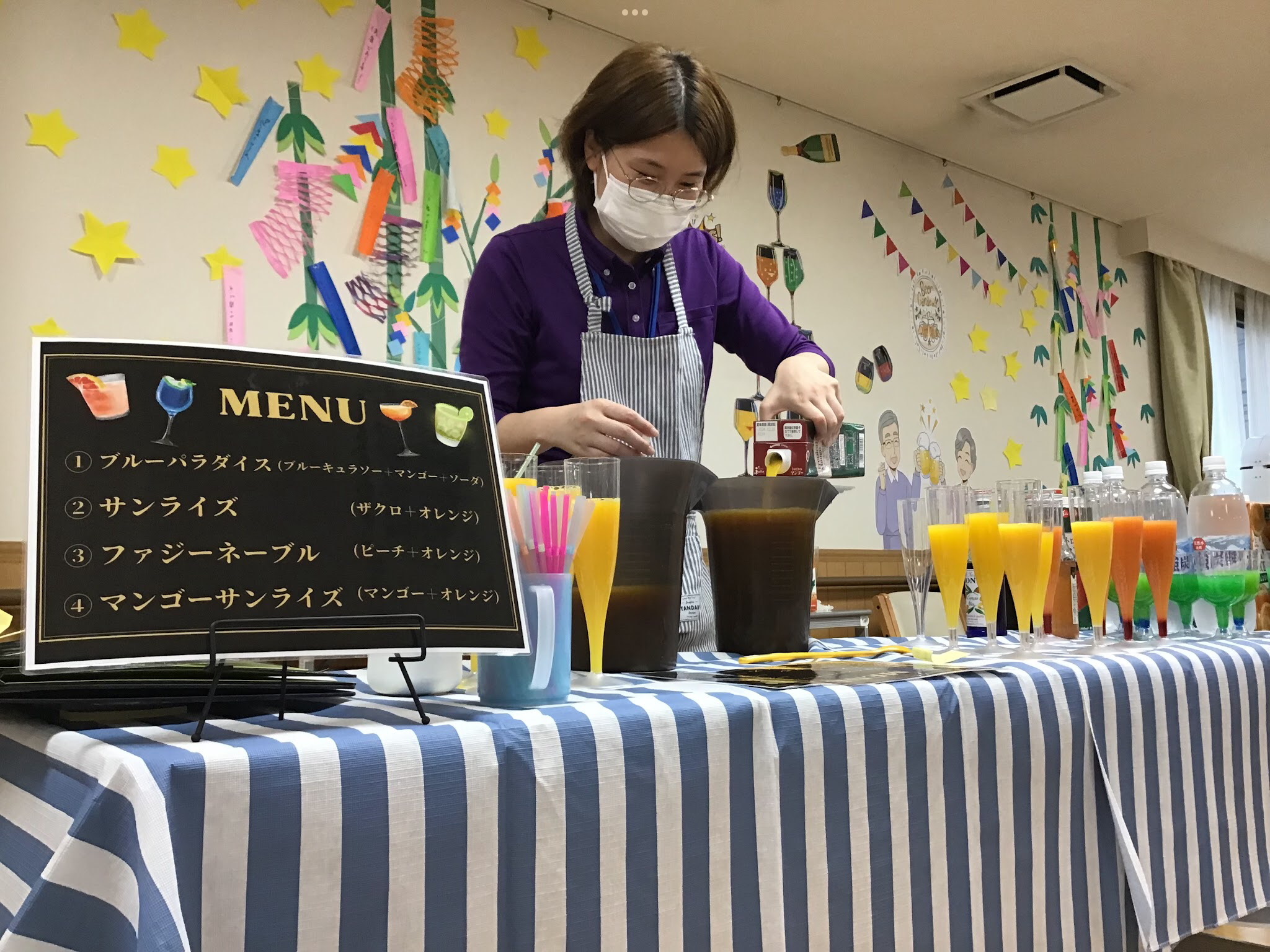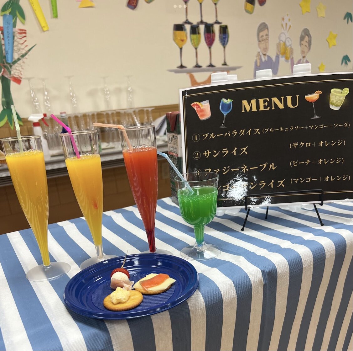 飲み物はカクテル風のジュース「ブルーパラダイス」「サンライズ」「ファジーネーブル」「マンゴーサンライズ」の4種類を用意しました(*^-^*)
