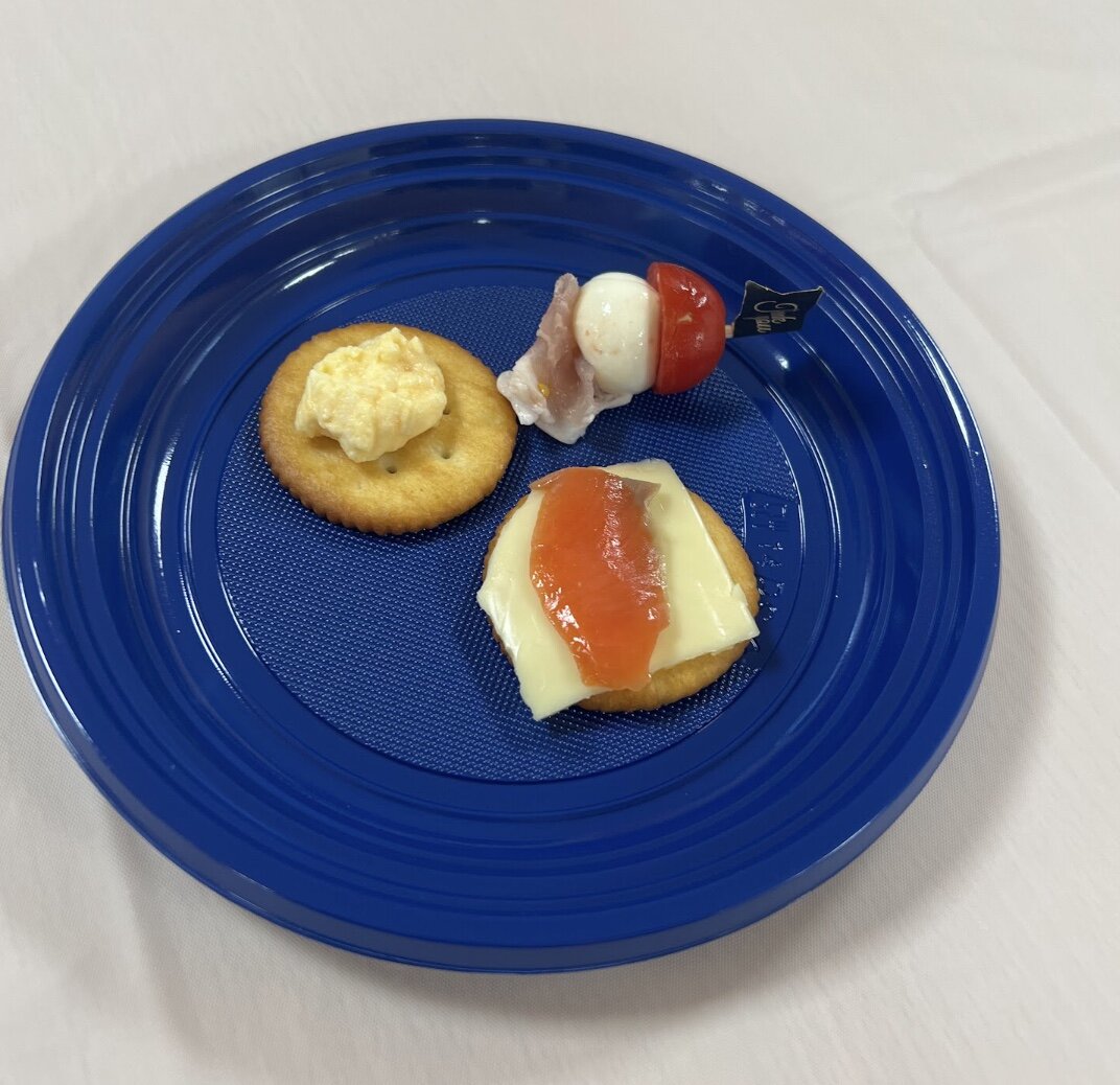 おつまみはクラッカーの上にたまごサラダを乗せた物、チーズとスモークサーモンを乗せた物、ピックに生ハムとモッツァレラチーズとトマトを刺した物の3種類を用意しました!