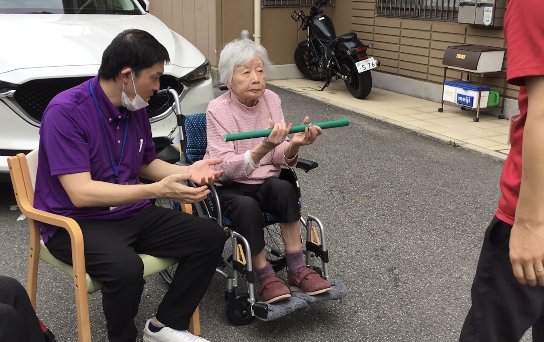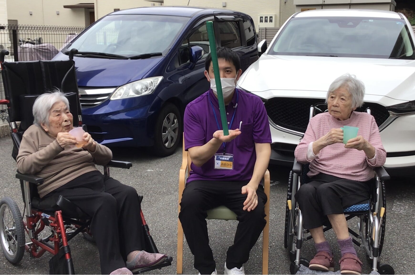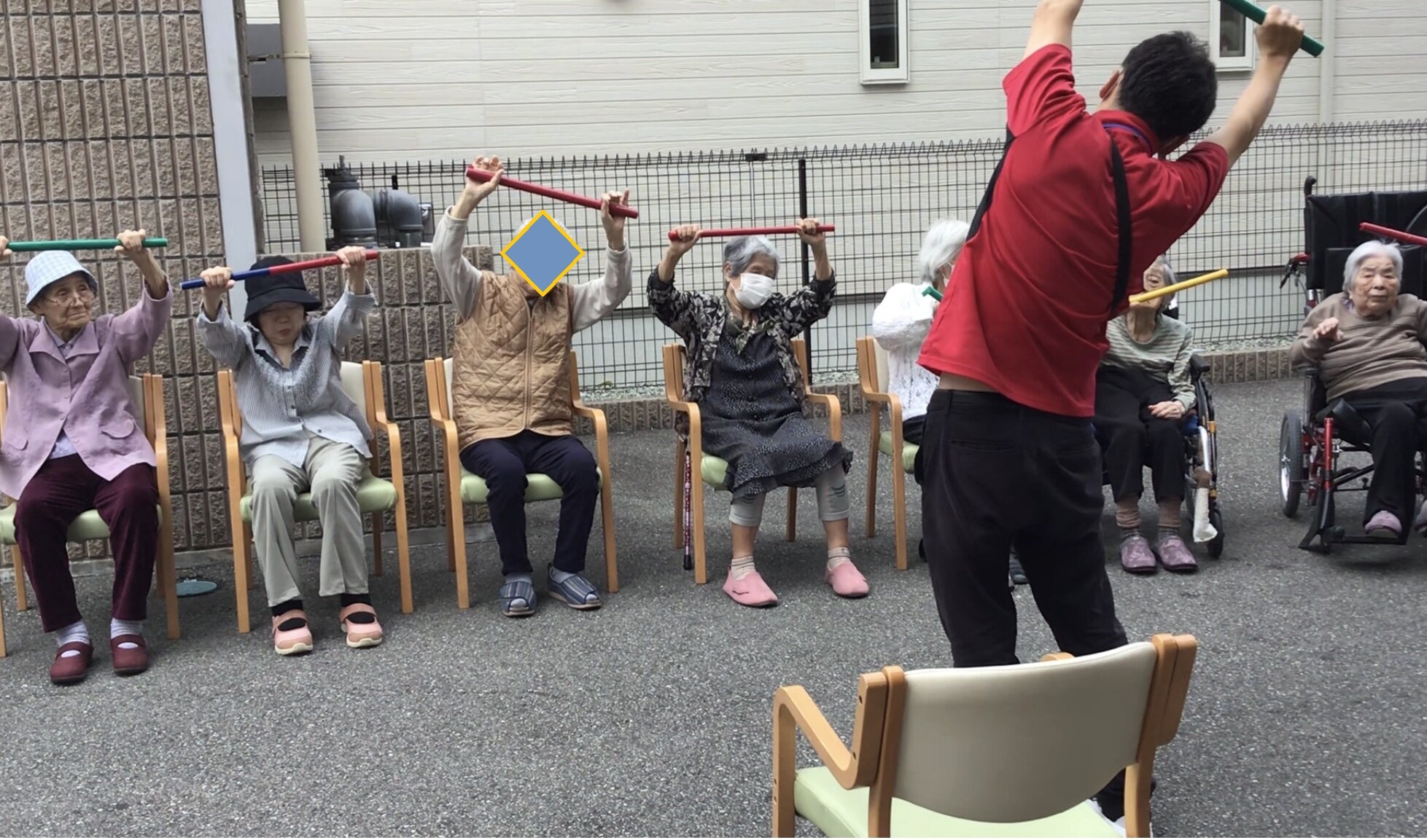 ポカポカした暖かい日、ご入居者と外で元気いっぱい体操を実施しました(^^♪