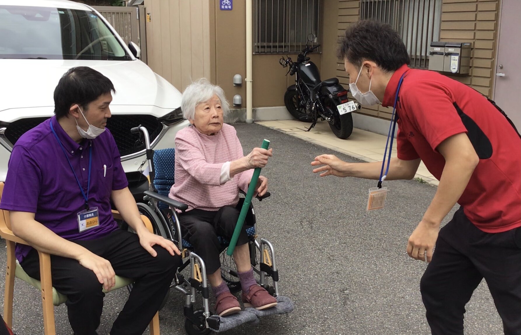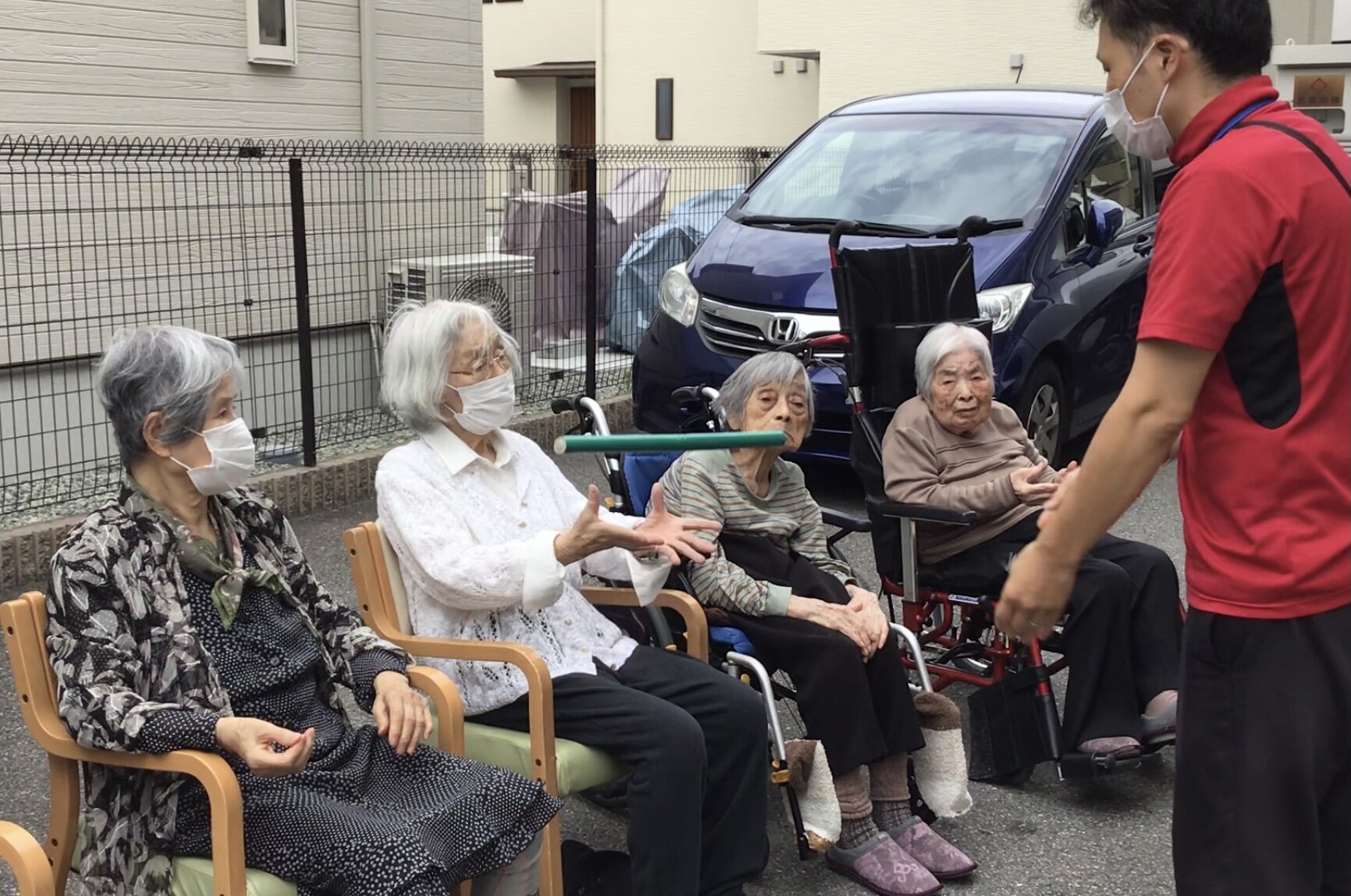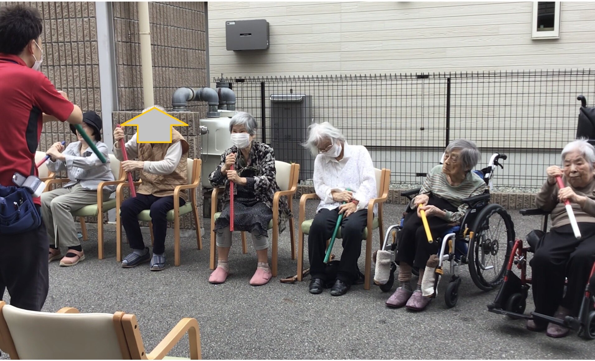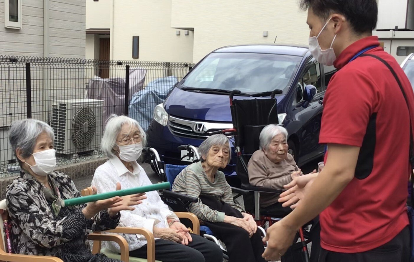 ポカポカした暖かい日、ご入居者と外で元気いっぱい体操を実施しました(^^♪