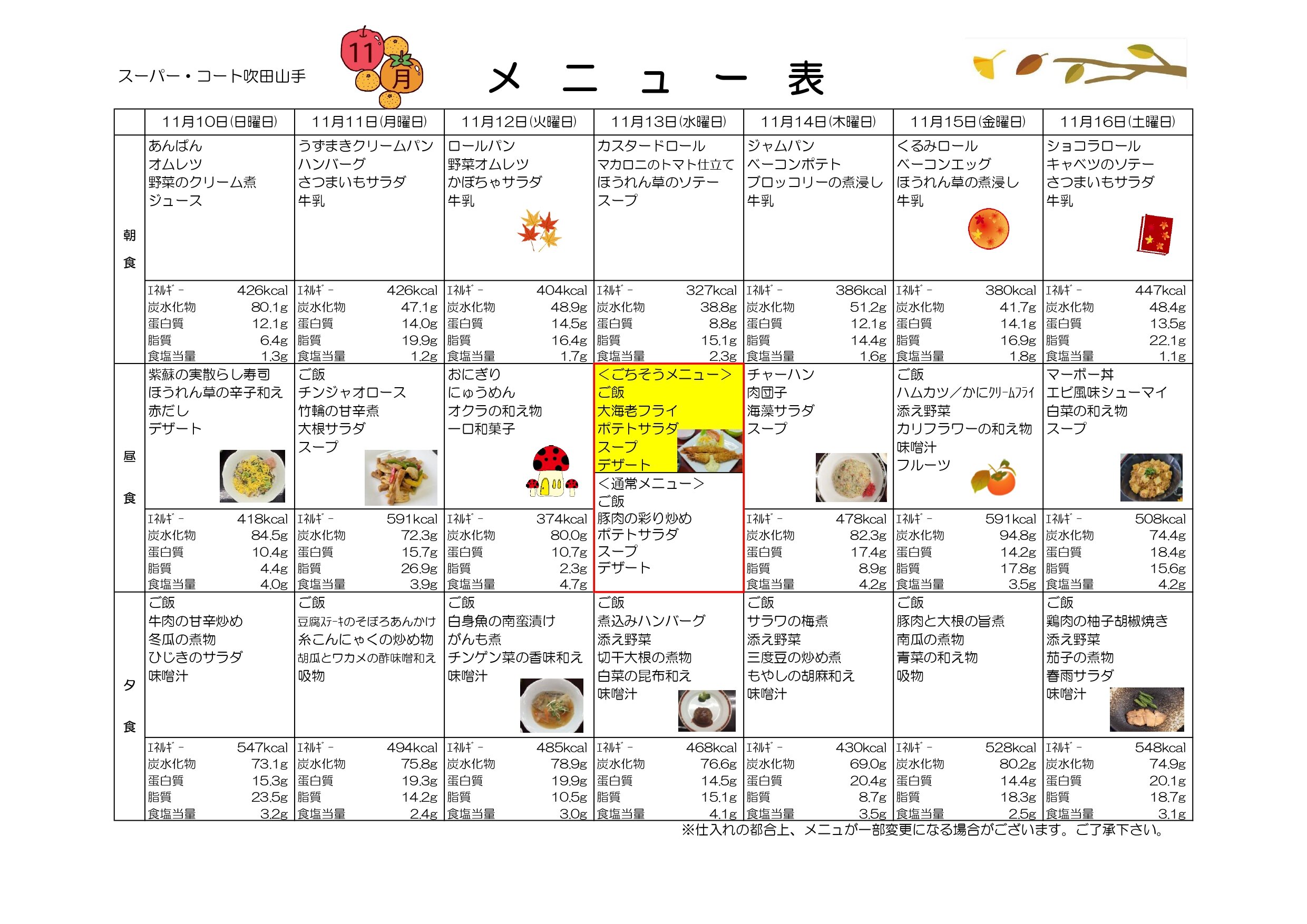 みなさまこんにちは11月10日~11月16日の献立のお知らせです(*^▽^*)