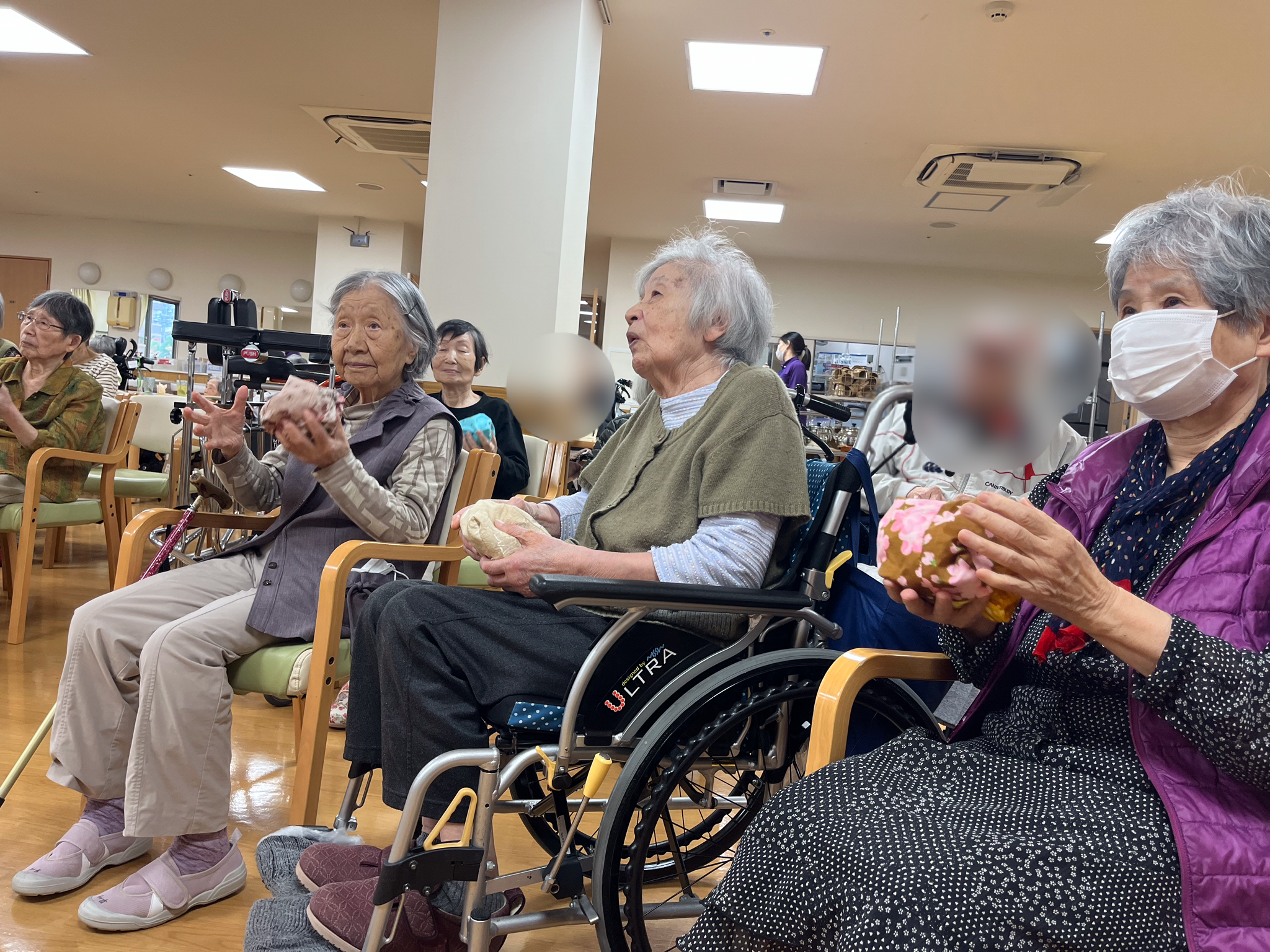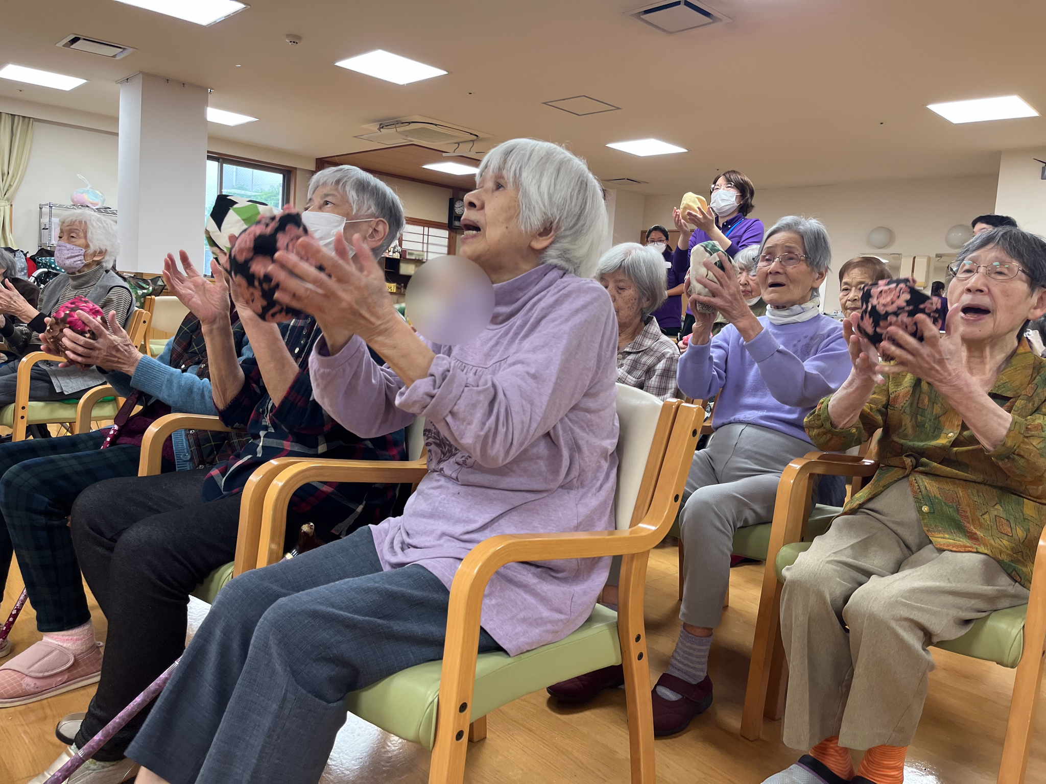 大きなお手玉や定番の鳴子を使い、みなさんで合唱しました。