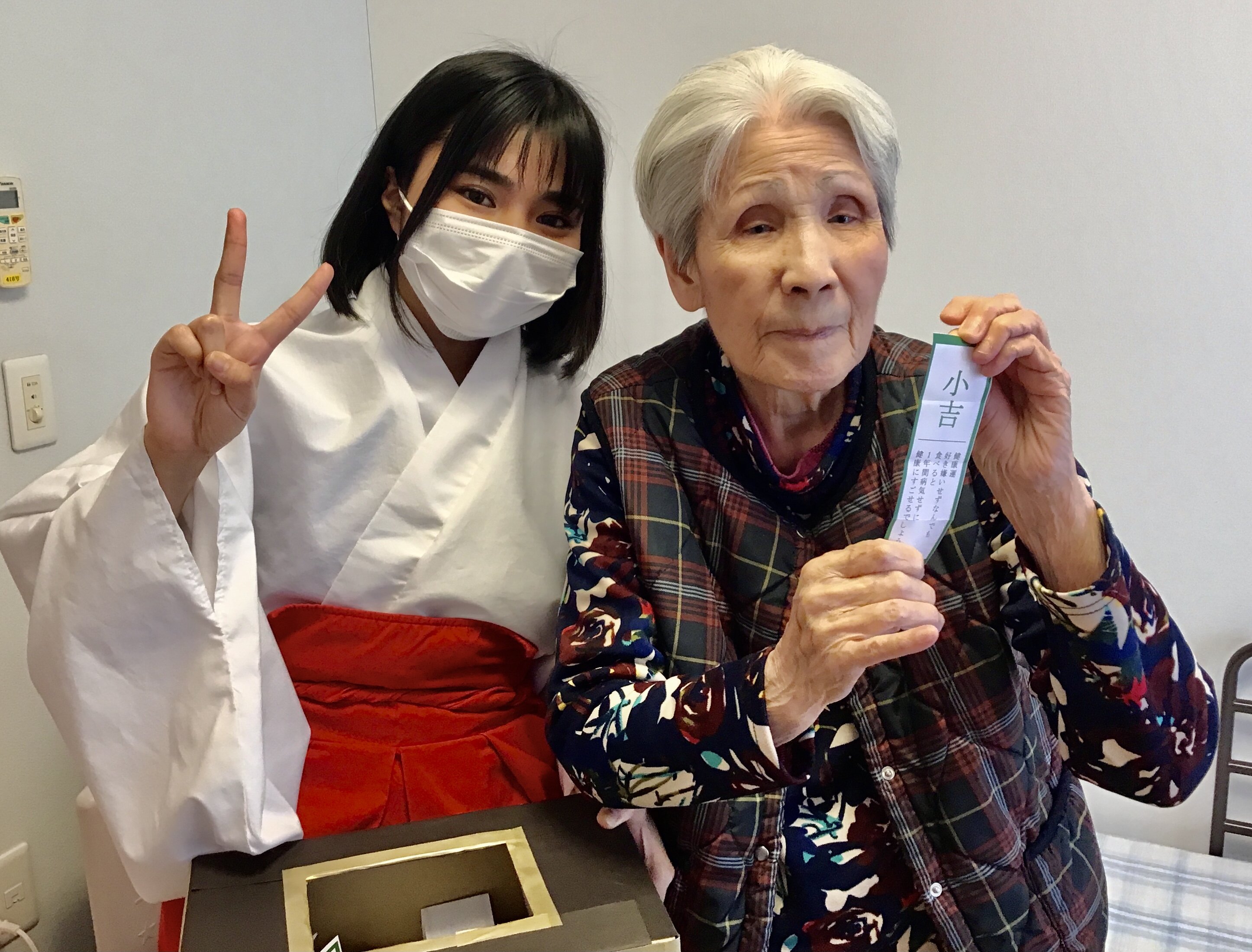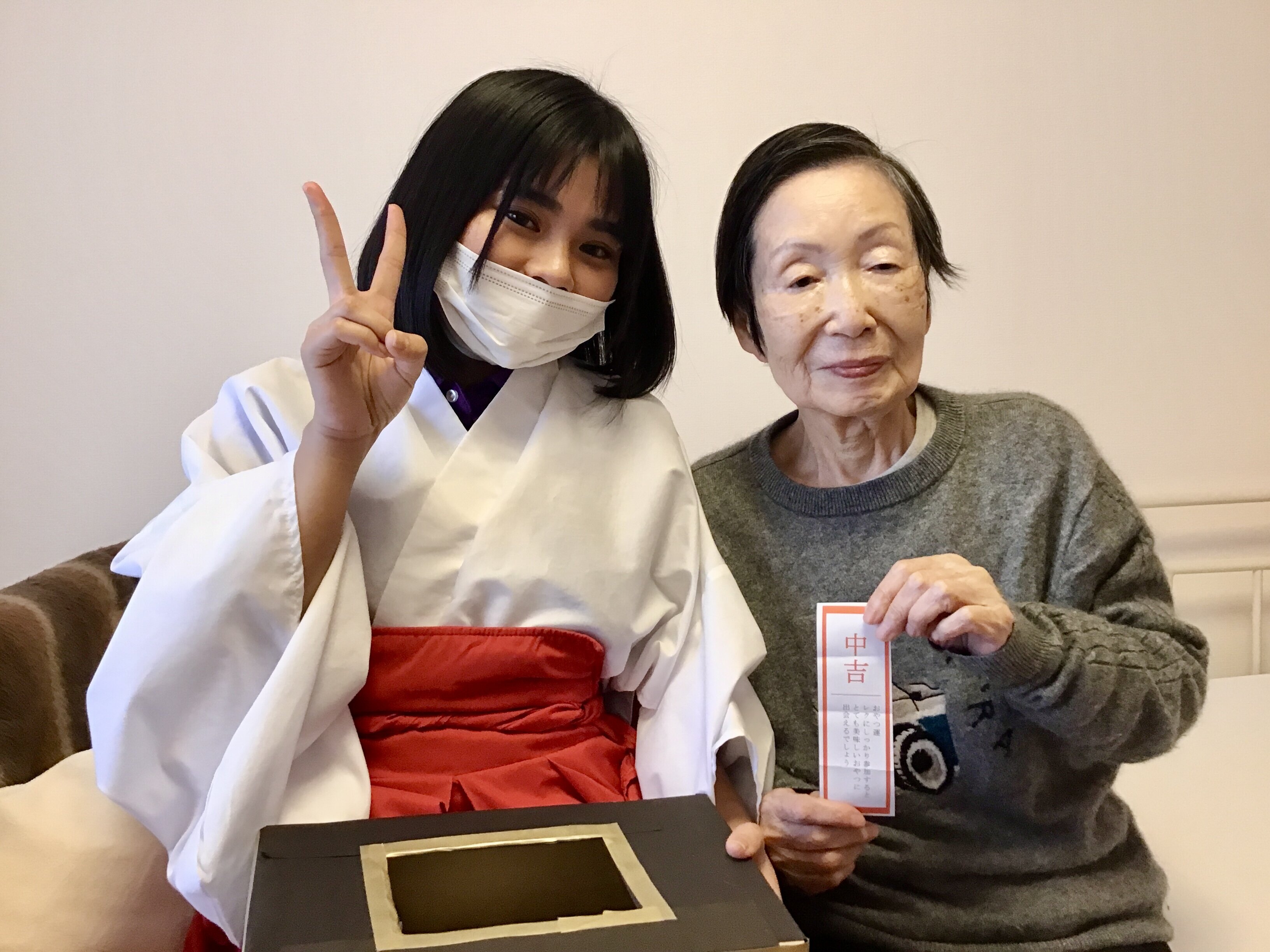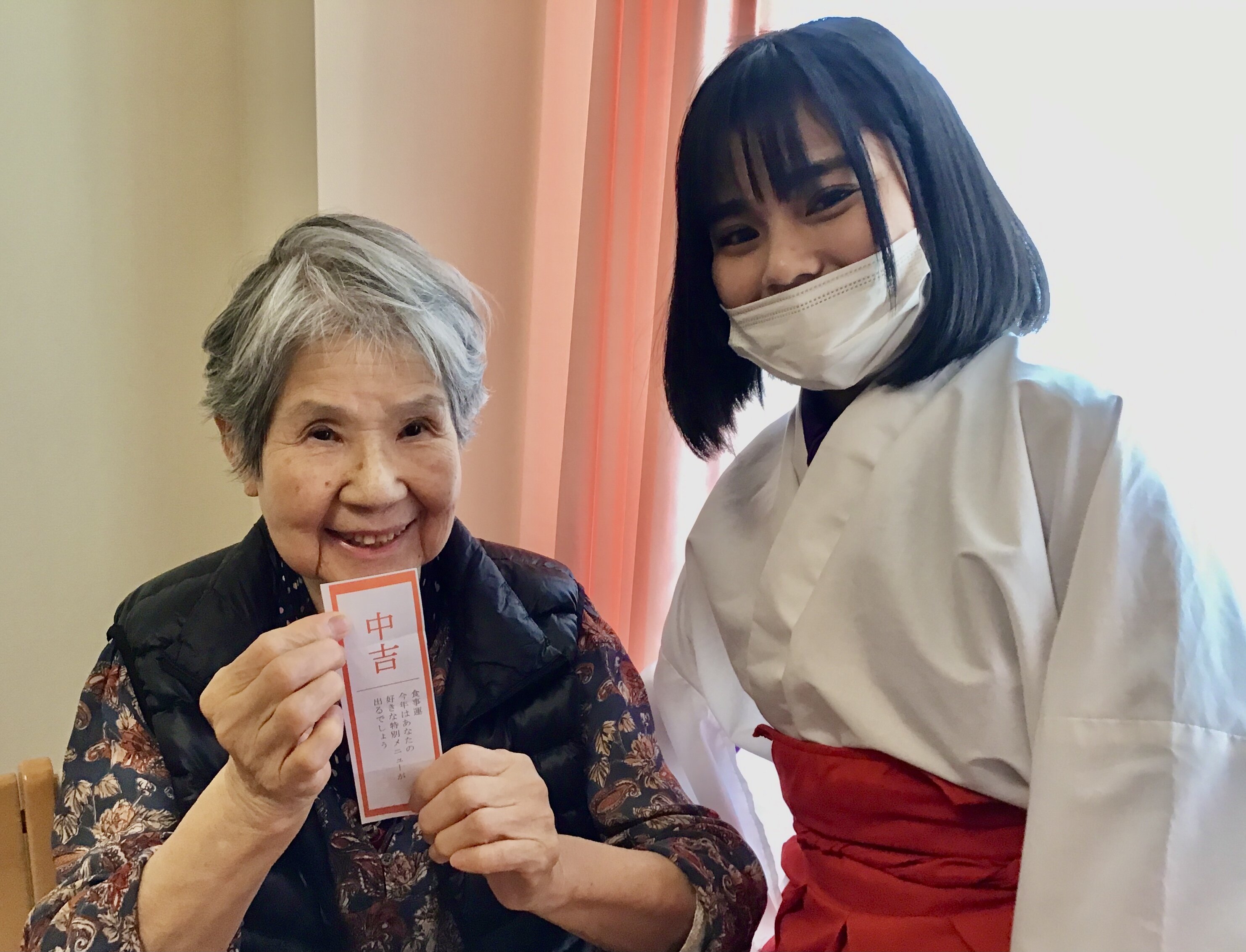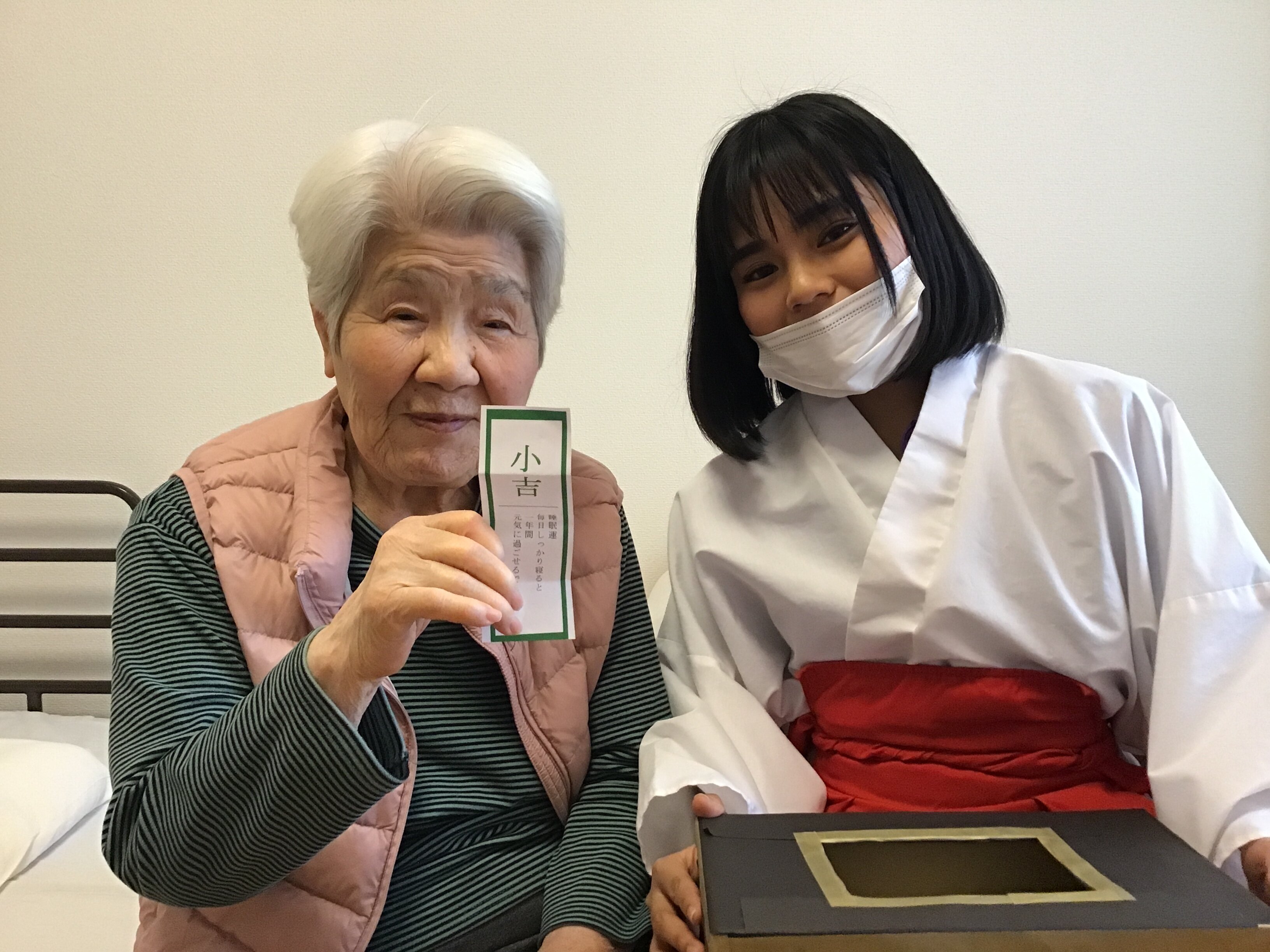 新年を迎えて一番始めのレクリエーションで、ご入居者の皆様に施設手作りのおみくじを引いていただきました!