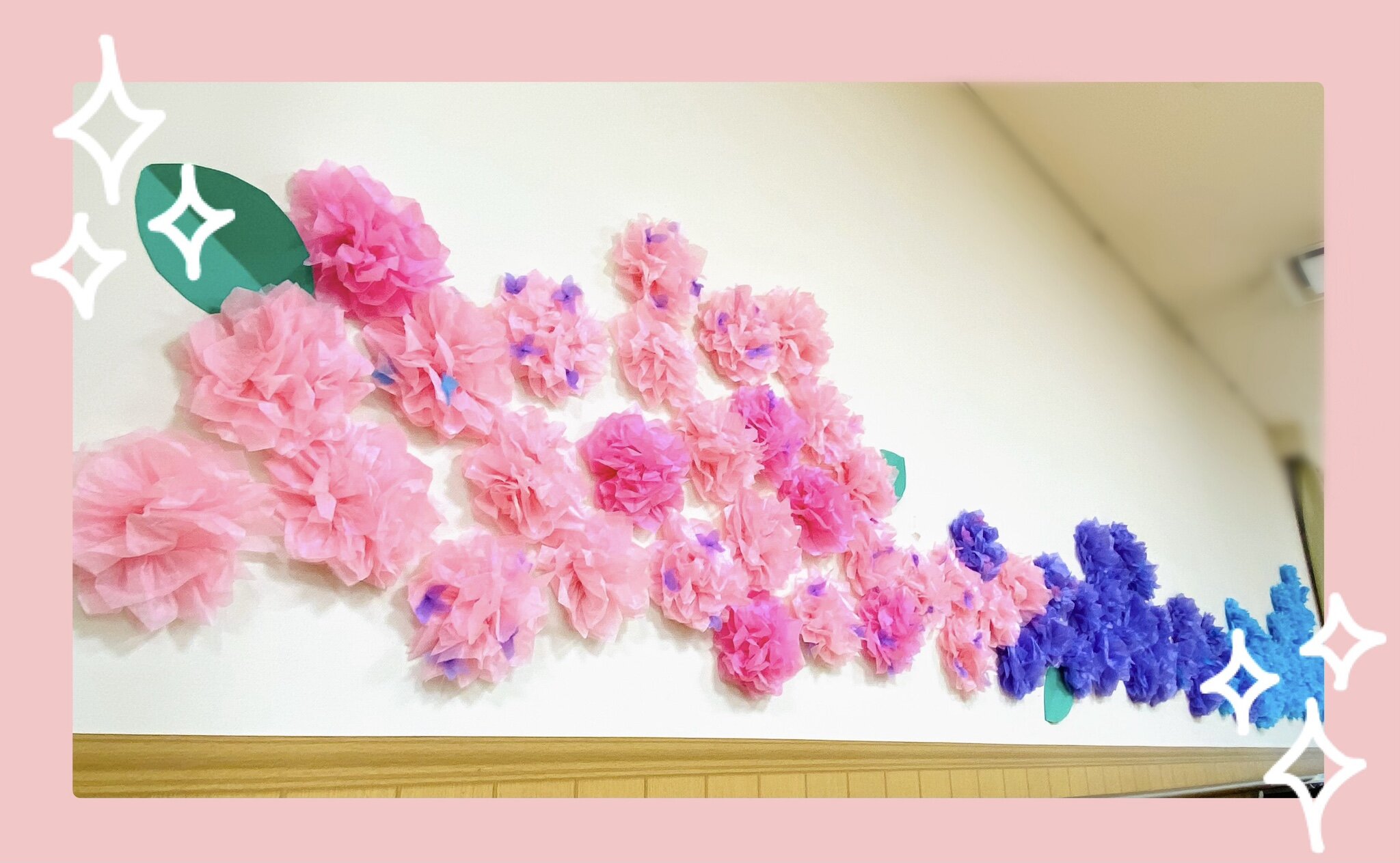 今回は、食堂壁に飾り付ける 「紫陽花」 をお花紙で作りました❀
