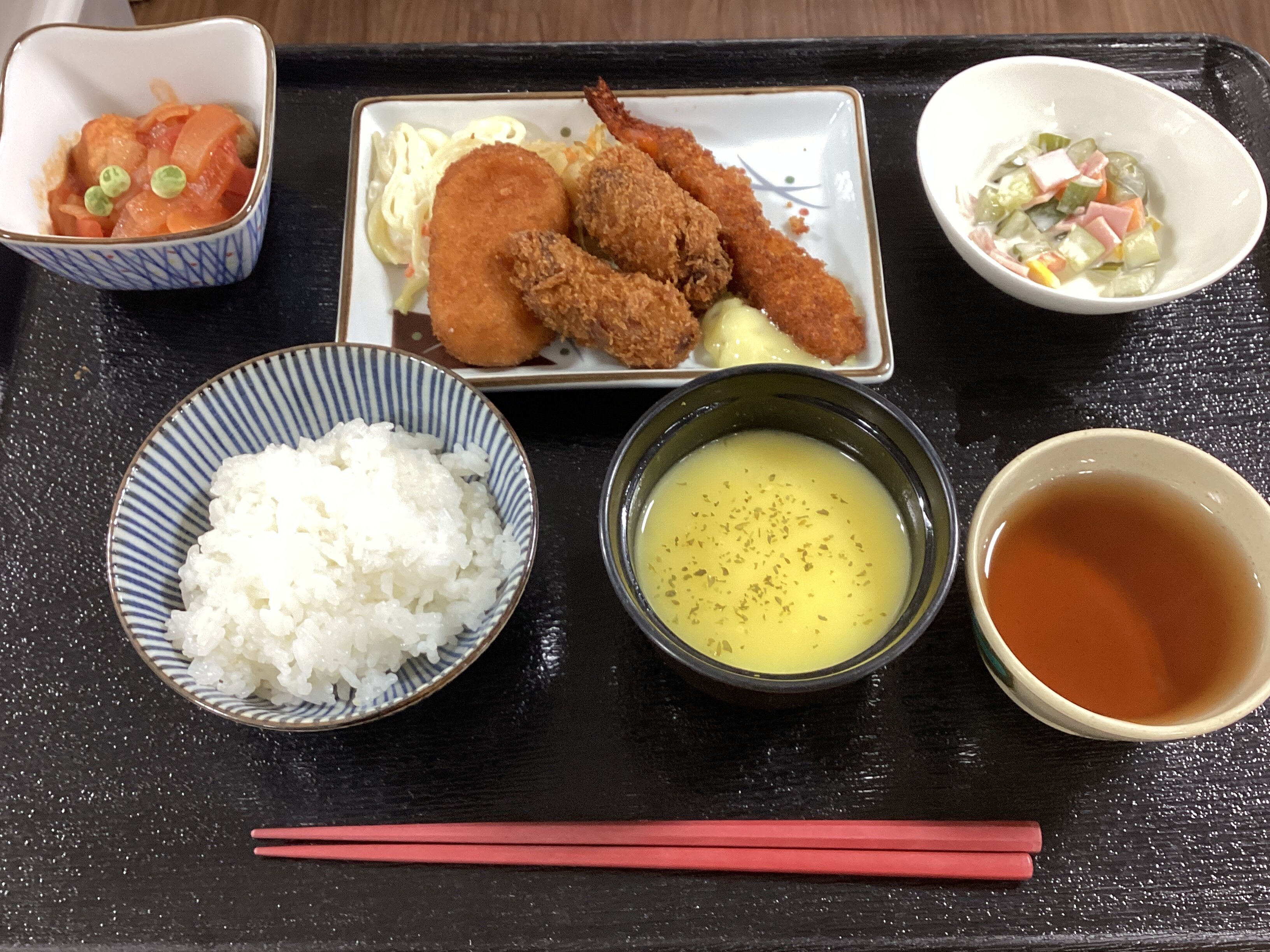 ミックスフライ(エビフライ・カキフライ・クリームコロッケ)肉団子のトマト煮・マセドアンサラダ・コーンスープでした\(^o^)/