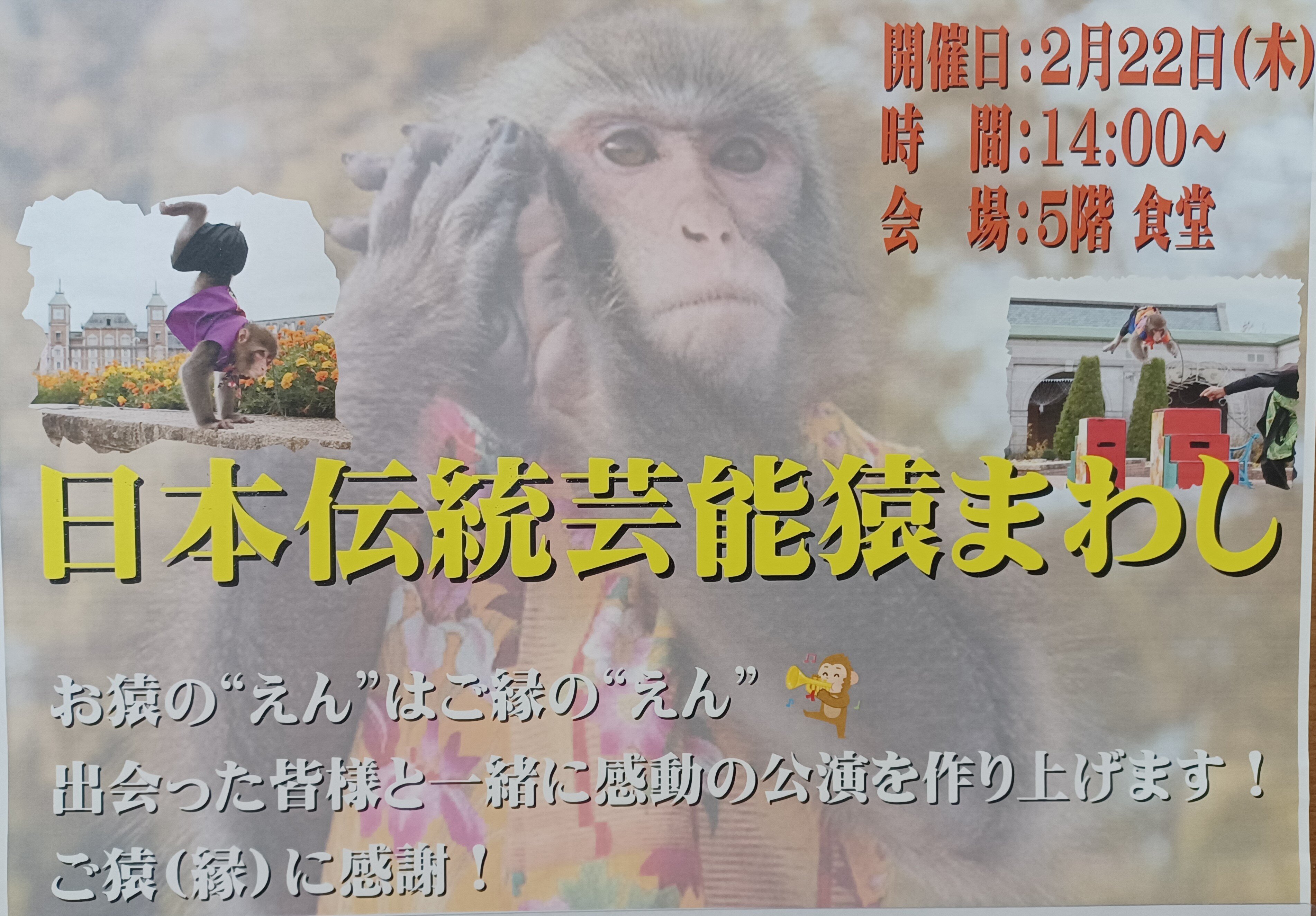 2月22日(木)14:00~『日本伝統芸能 猿まわし』を開催致します♪♪