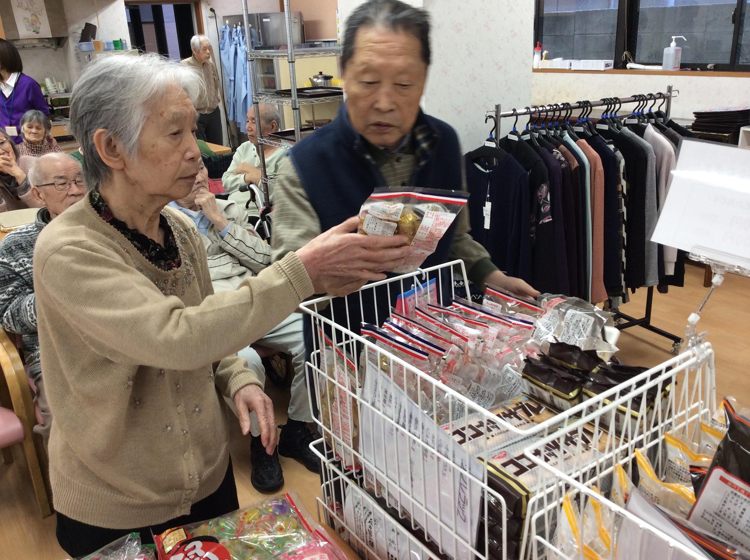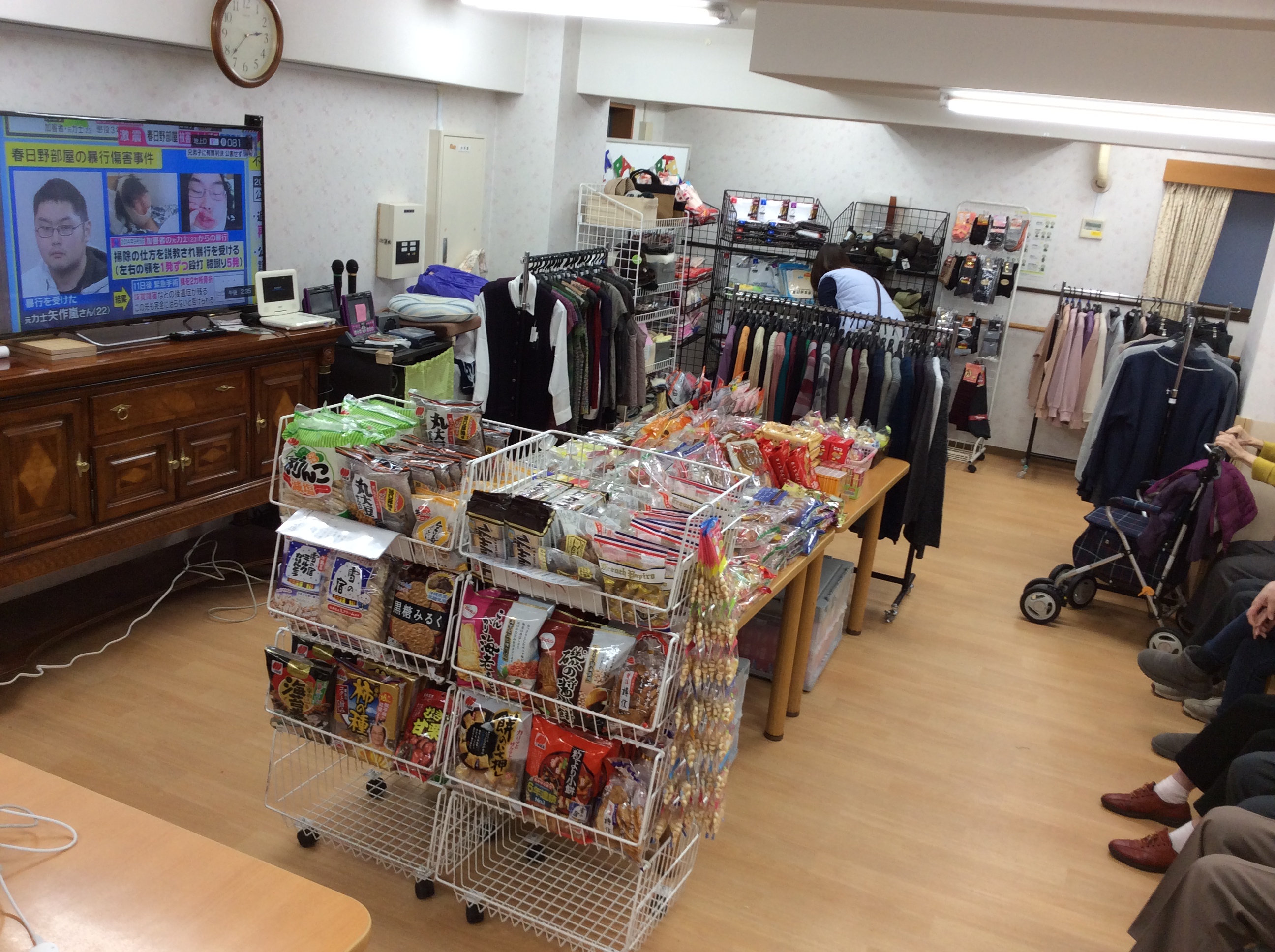 お菓子・洋服・介護シューズなどたくさんの商品が食堂いっぱいに並んでます☆
