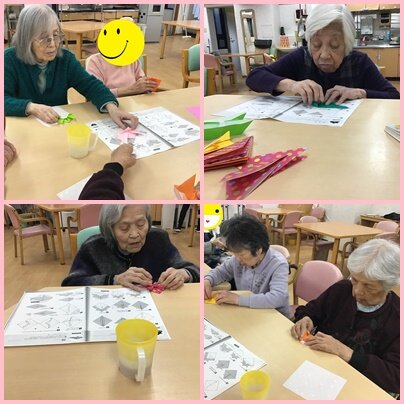 今回は折り紙レクレーションさせて頂き、お手本を見ながら折って頂きました♪