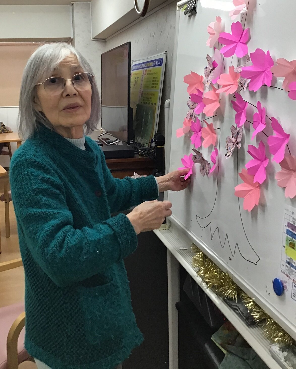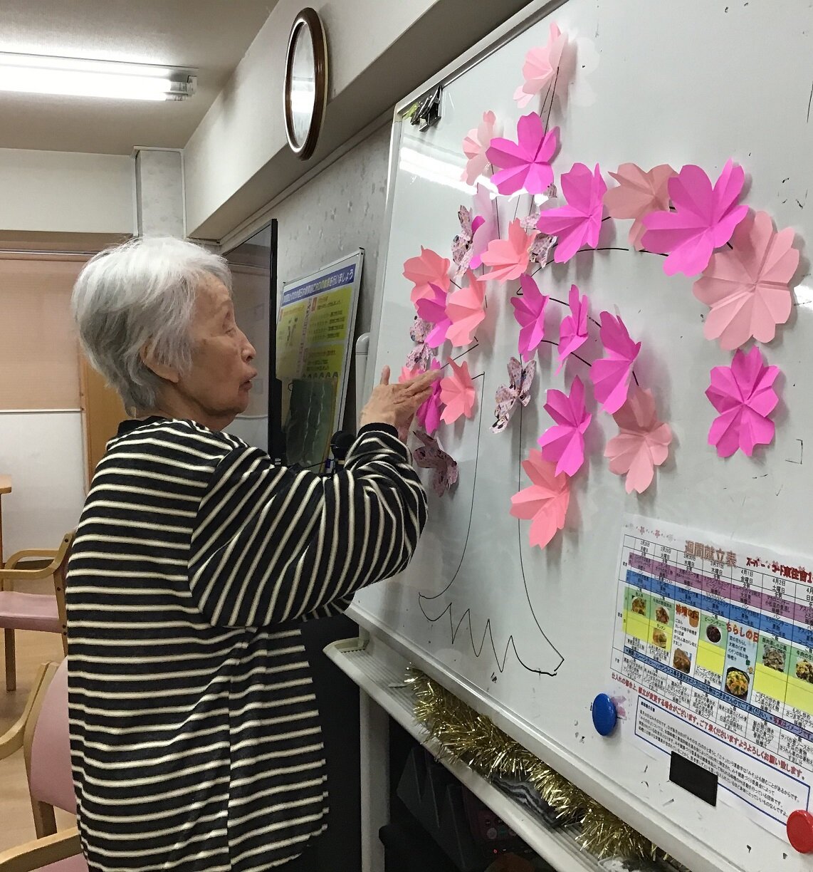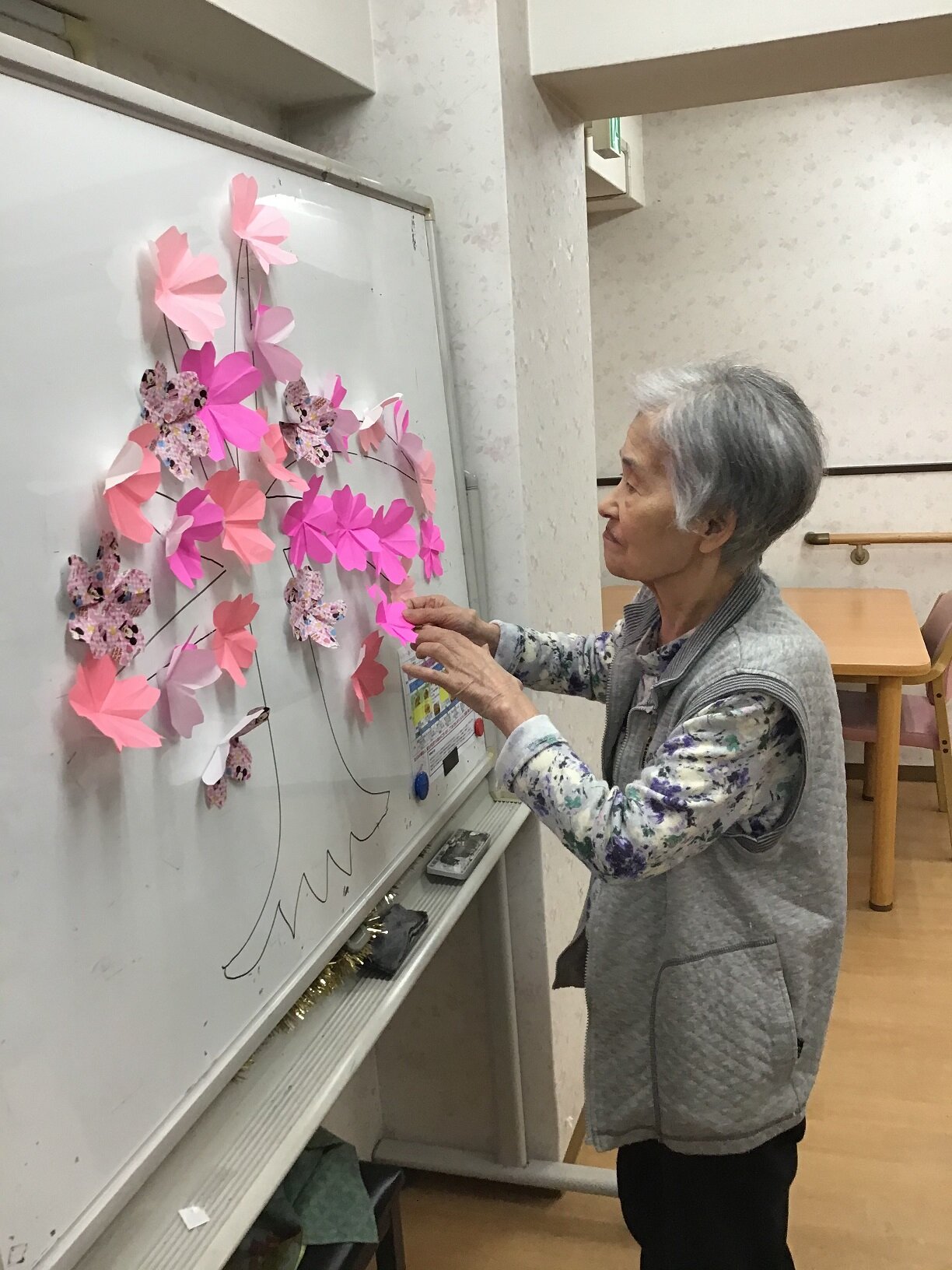 お花の折り紙を折って頂きホワイトボードに木を描かせて頂き、