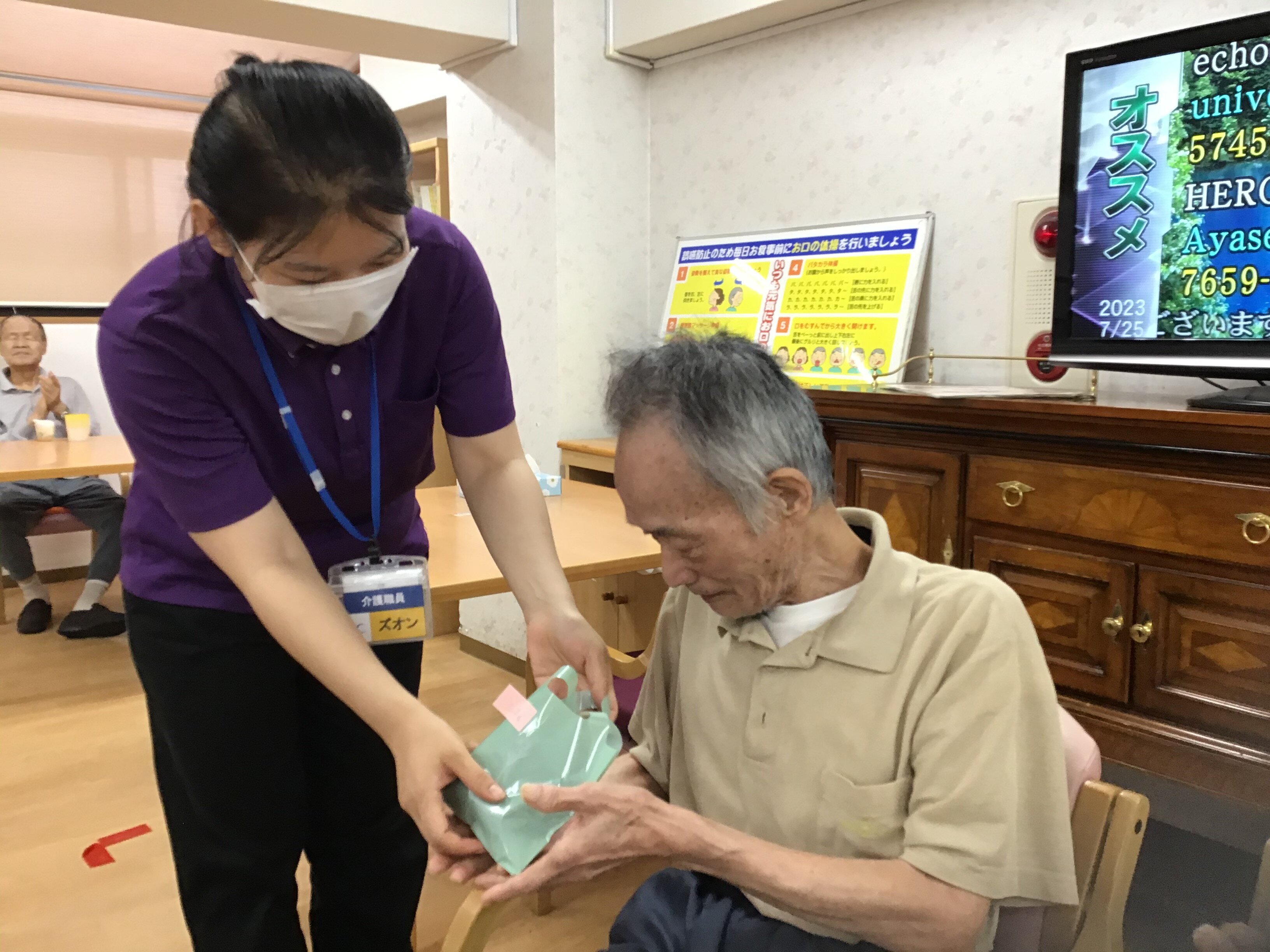 7月生まれの方のお祝いをした後、プレゼントをお渡しさせていただき