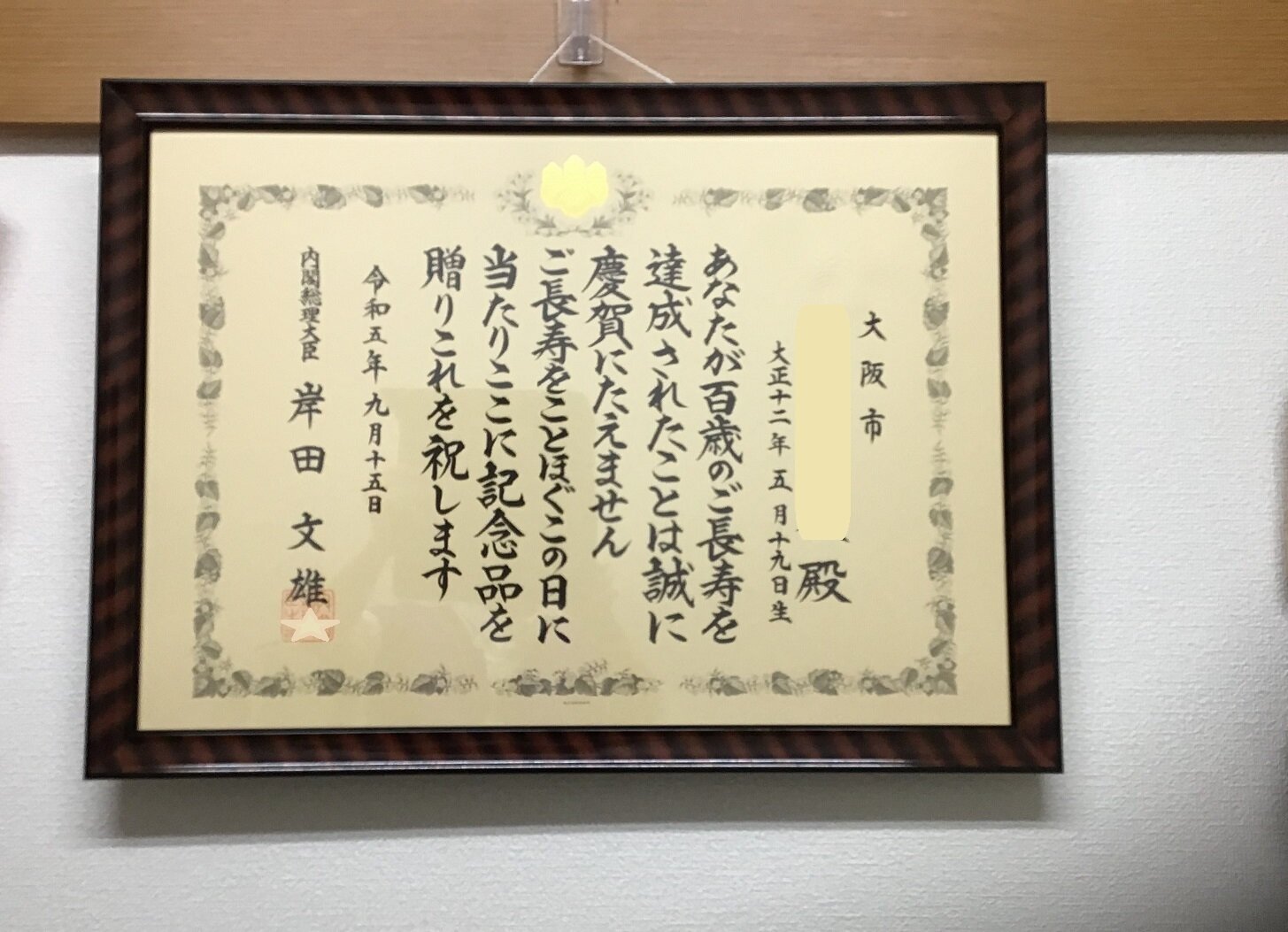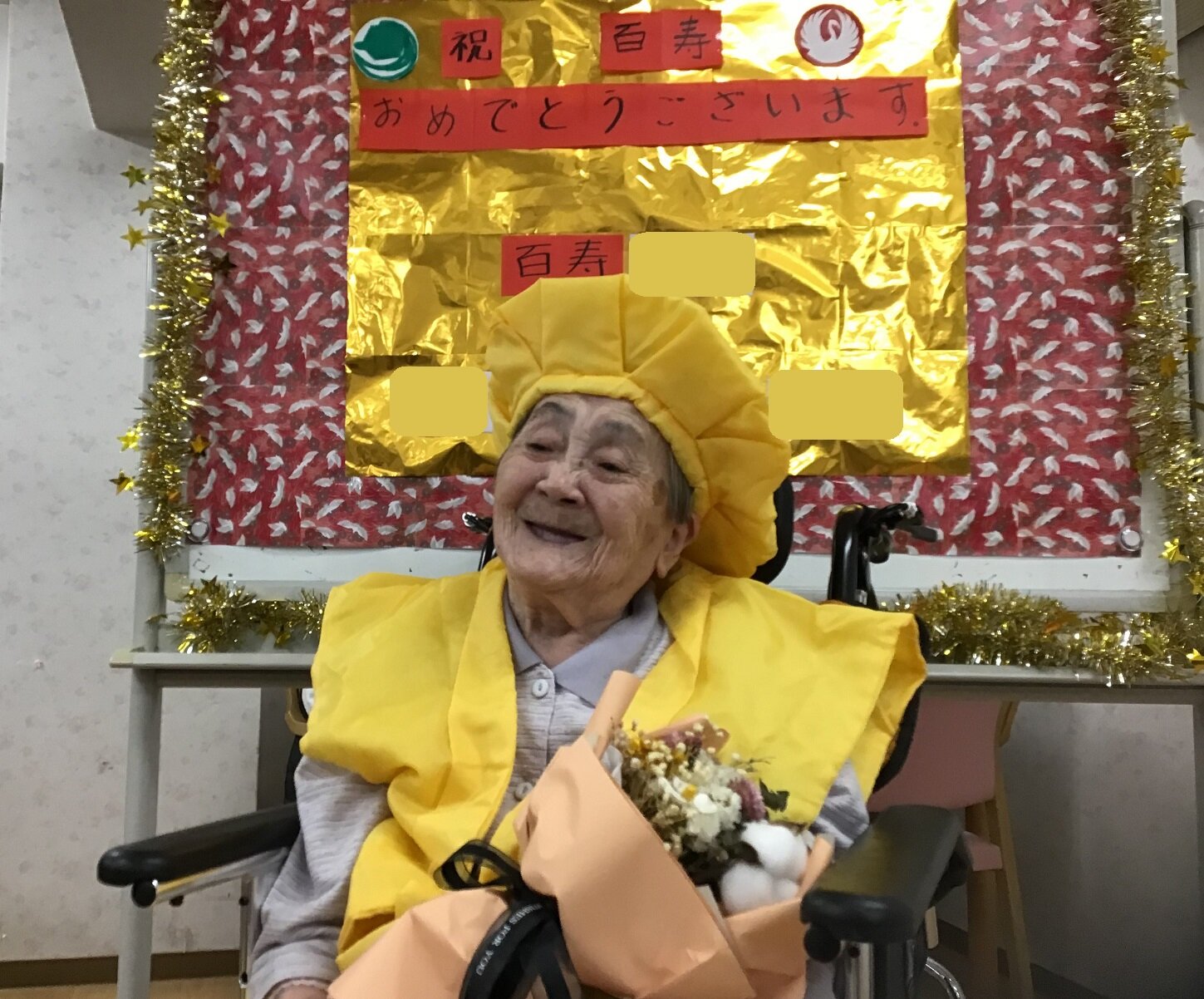 スーパ-・コート東住吉1号館で、百歳になられたご入居者に贈られた