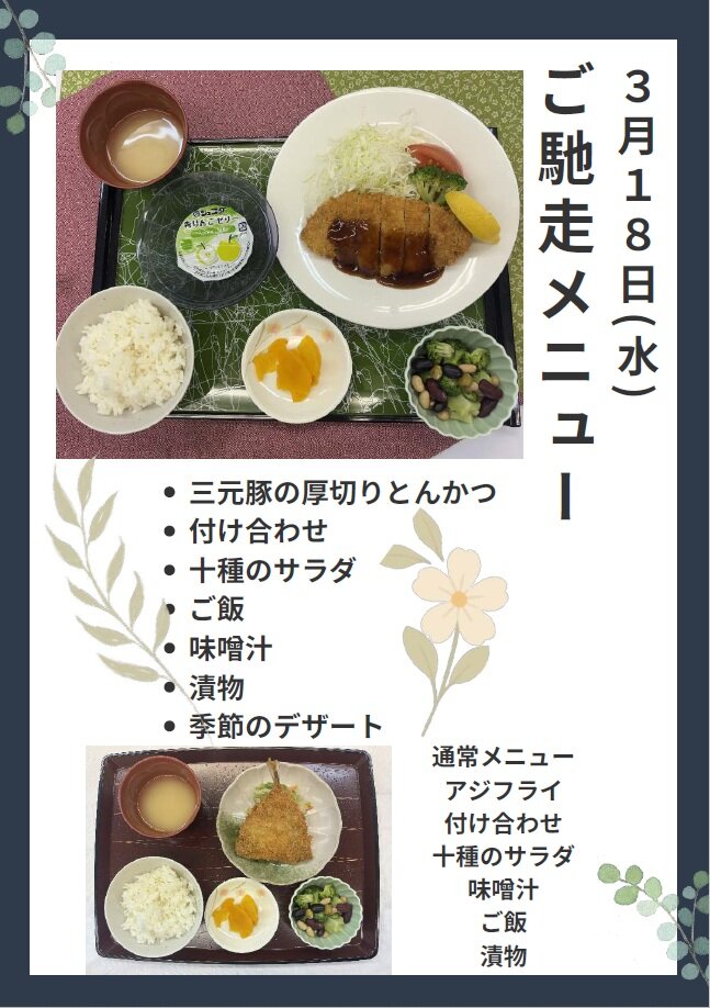 3月18日にごちそうメニューとして「三元豚の厚切りとんかつ」が振舞われます(*^^*)