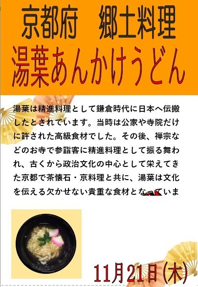 11月21日に京都府の郷土料理「湯葉あんかけうどん」が振舞われました(/・ω・)/
