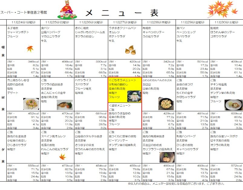11月24日から11月30日までの献立をご紹介致します('ω')ノ