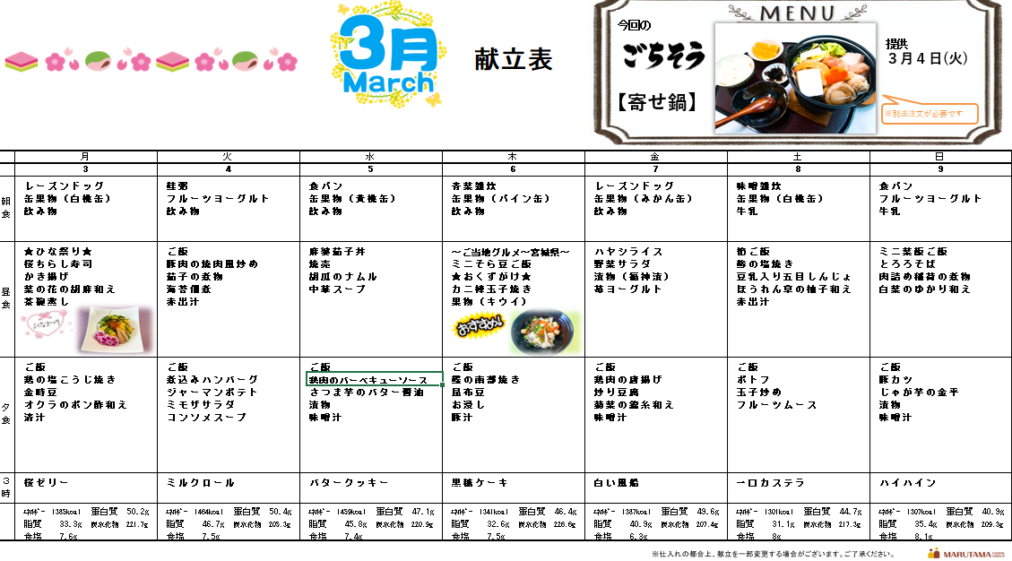 3月3日から3月9日までの献立をご紹介いたします(/・ω・)/