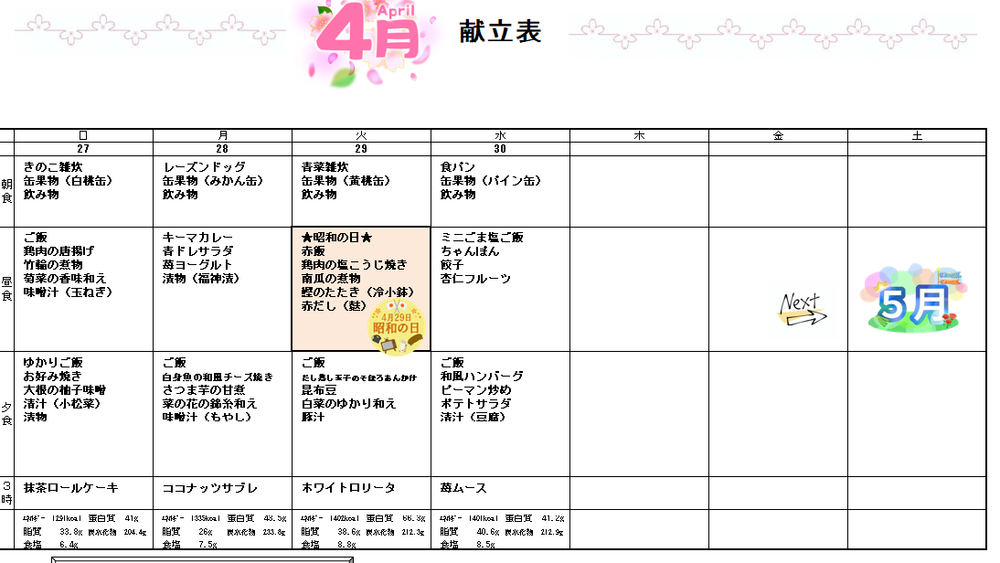 4月27日から30日までの献立をご紹介いたします(*ノωノ)
