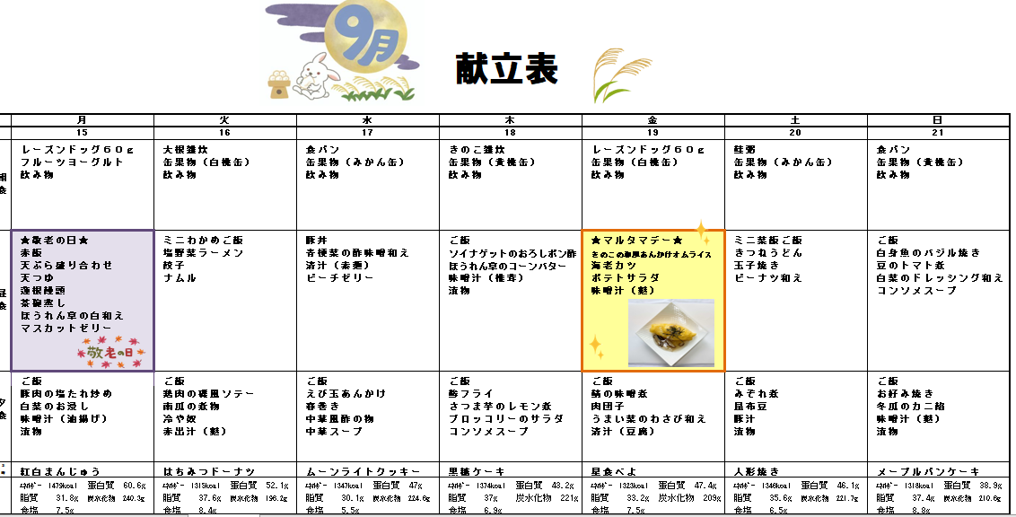 9月15日から21日までの献立をご紹介いたします(*'▽')