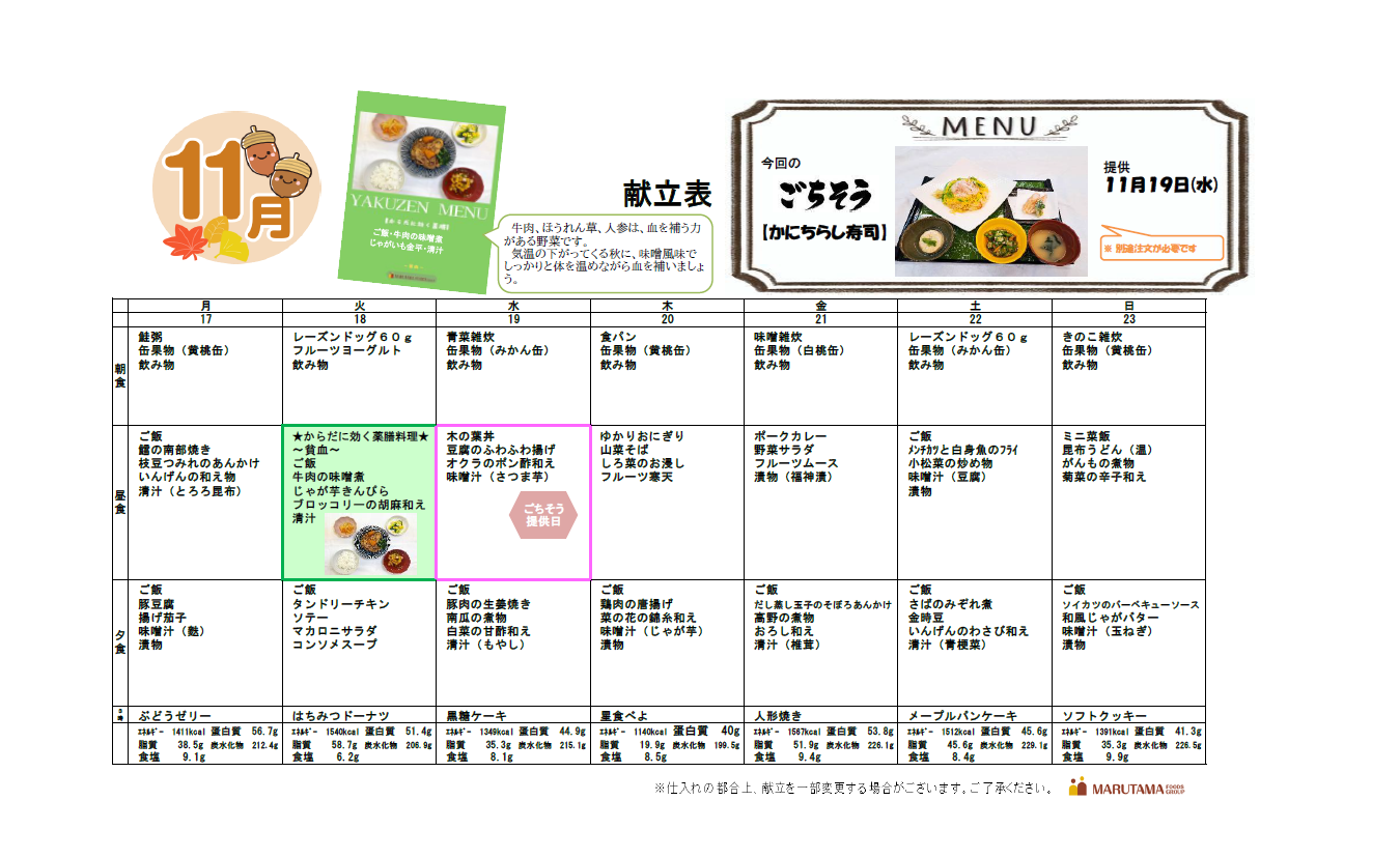 11月17日から23日までの献立をご紹介いたします(=゚ω゚)ノ