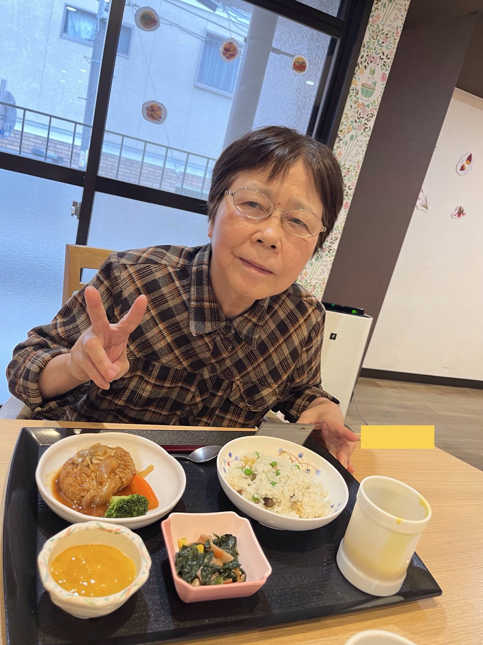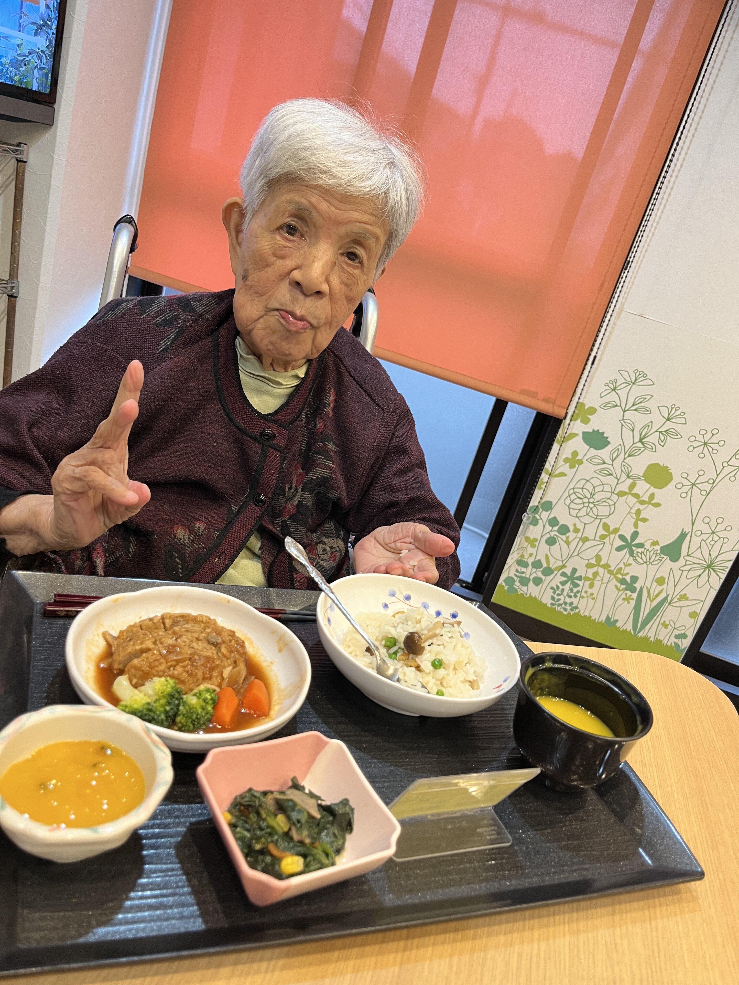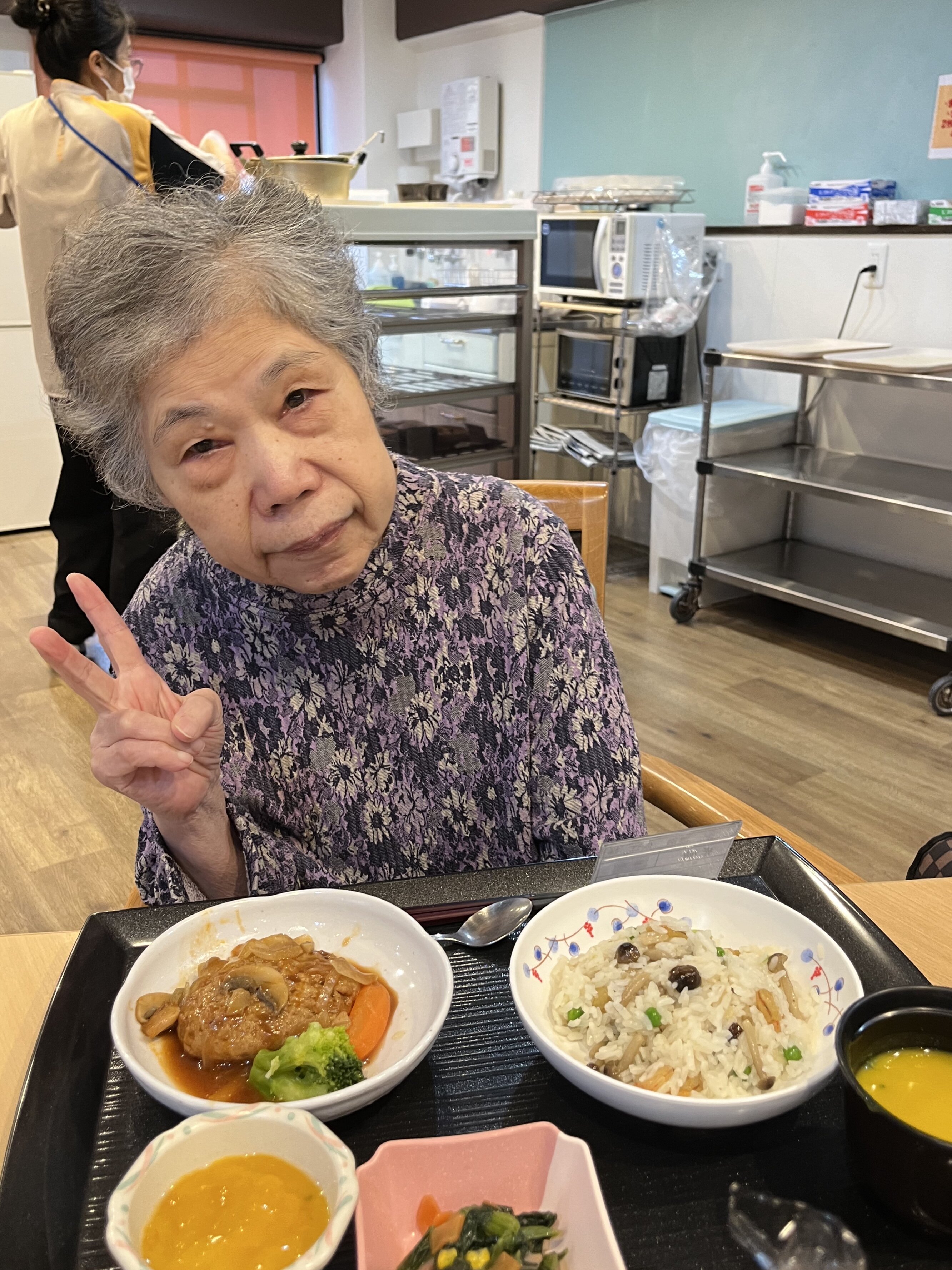 メニューは「きのこのピラフ、煮込みハンバーグ、ほうれん草のソテー、パンプキンスープ、南瓜プリン」です♪